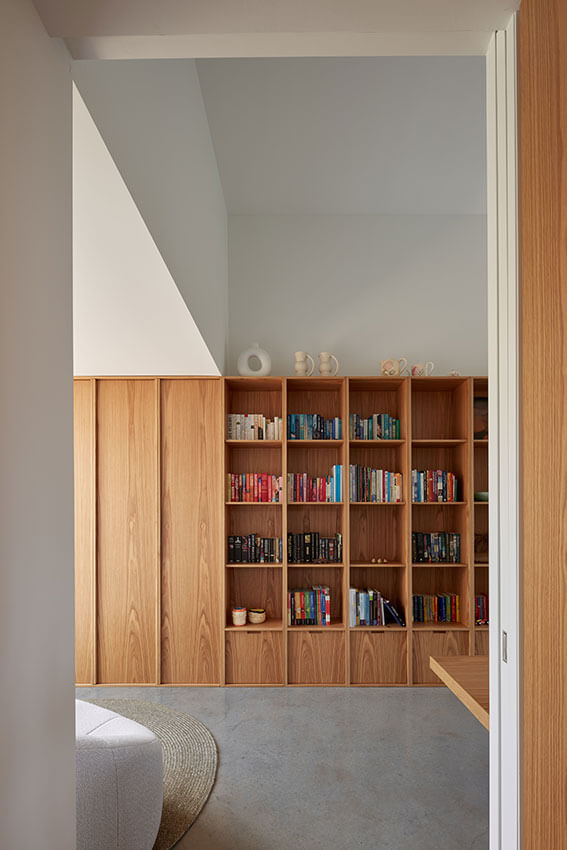 Running almost the full width of the site and segmented along its length, the planning of the addition is uncomplicated and efficient. The interplay of varied ceiling heights and column spacing endows each section its own identity. Neatly wrapped in western red cedar, the external elevation conceals the undulation in internal volumes.