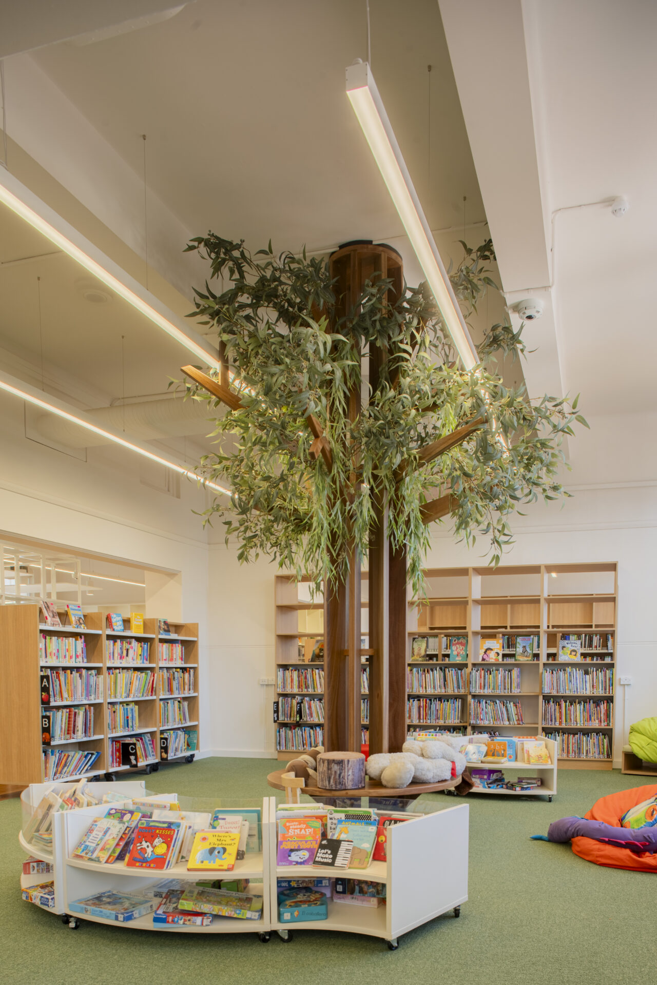 More than a reinstatement, the project embedded a flood management plan into the building’s design. Collections, mobile shelving, and furnishings were planned for quick relocation to upper floors, with circulation and storage reconfigured to support efficient disaster response. The building was also reimagined as a stronger civic hub—enhancing accessibility, integrating multipurpose rooms, and creating engaging features such as the children’s hardwood “tree.”