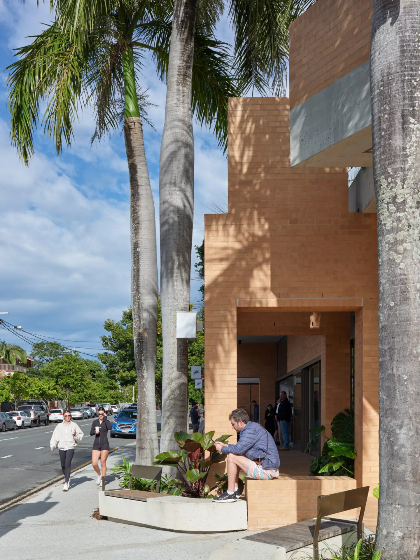 The built form responds thoughtfully to its context of commercial character and brick apartment buildings through scale, massing, and articulation. A palette of brick and concrete, complemented by integrated landscaping, grounds the project in its subtropical setting.Â