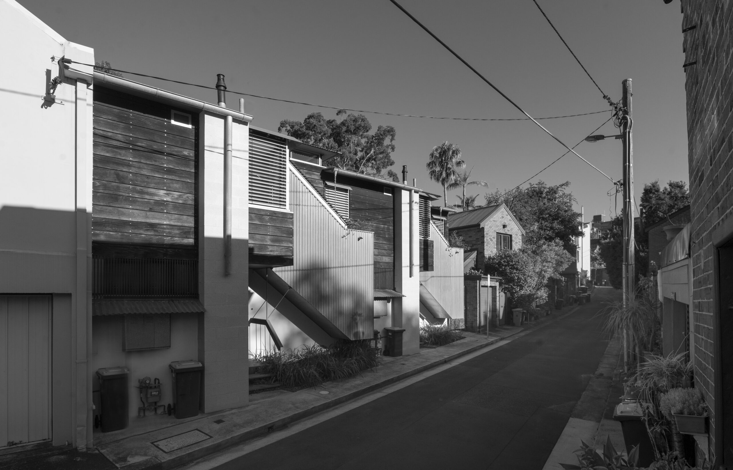 The identical houses are ‘upside-down’: bedrooms below and living areas above. All ‘machines’- bathrooms, stairs, kitchens, rubbish-bins, etc are rowed in front concentrating the main massing away from the street. Articulate and expressive, the resulting external appearance contributes much to the streetscape.