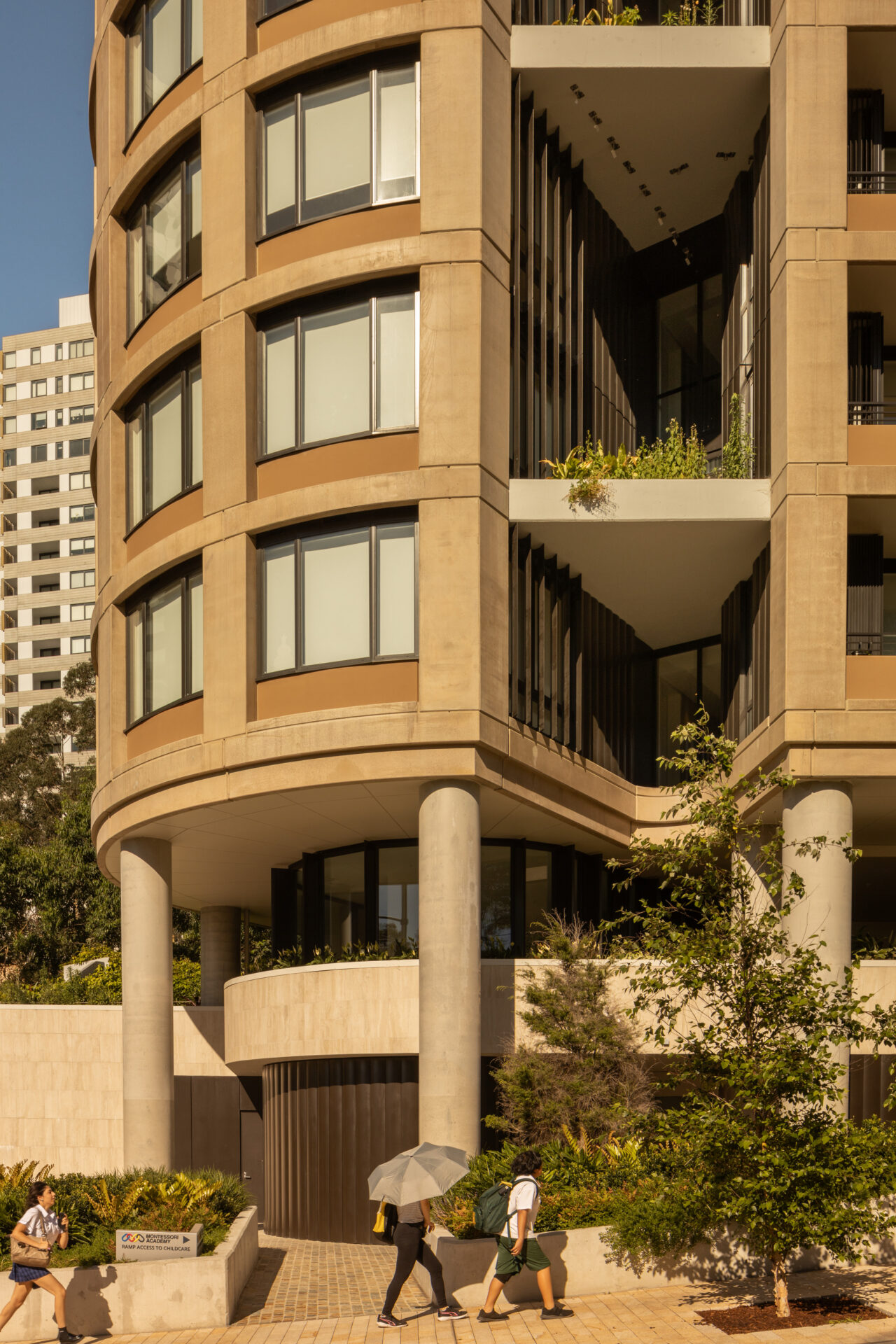 A triple-level base organises a childcare centre, residential arrival plaza, carpark entry and circulation. Above, the tower rises 23 storeys, offering 269 apartments including 23 wheelchair-accessible units. Residences are planned to work in tandem with the form so that amenity is maximised. The façade combines a precast concrete structure, high performance thermal envelope and rigorous repetition to deliver an efficient and elegant expression.