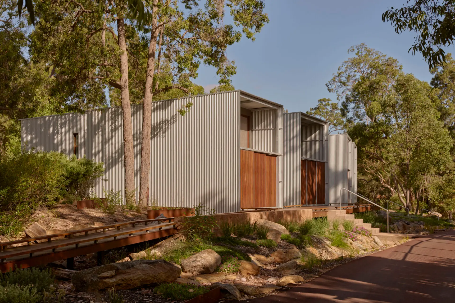 Located within a bushland setting on a former campground, Marri Pavilions is a retreat accommodation project deeply connected to its landscape and sloping topography. The design balances privacy and solitude within individual dwellings with opportunities for informal social interaction creating a grounded retreat experience.