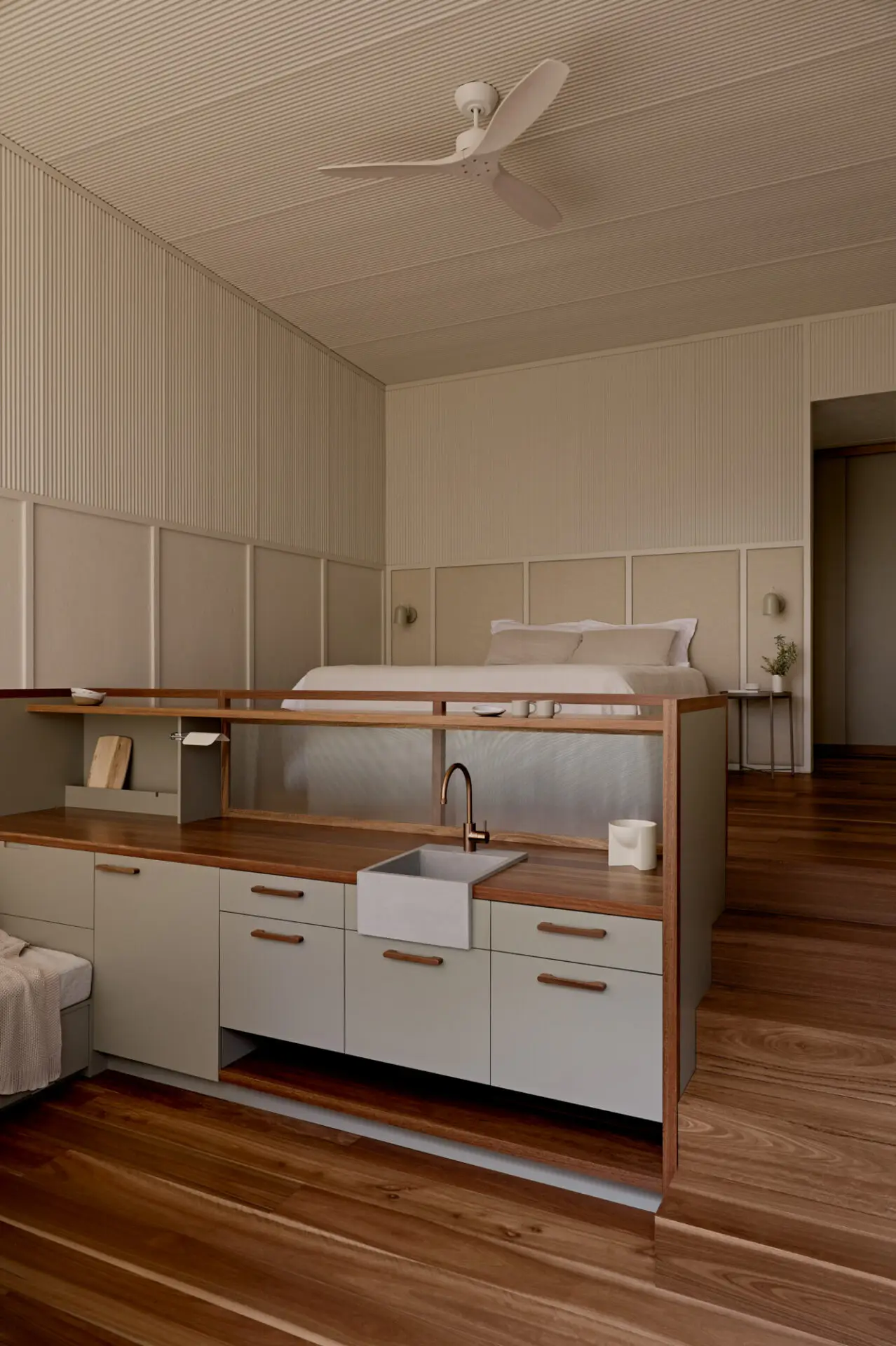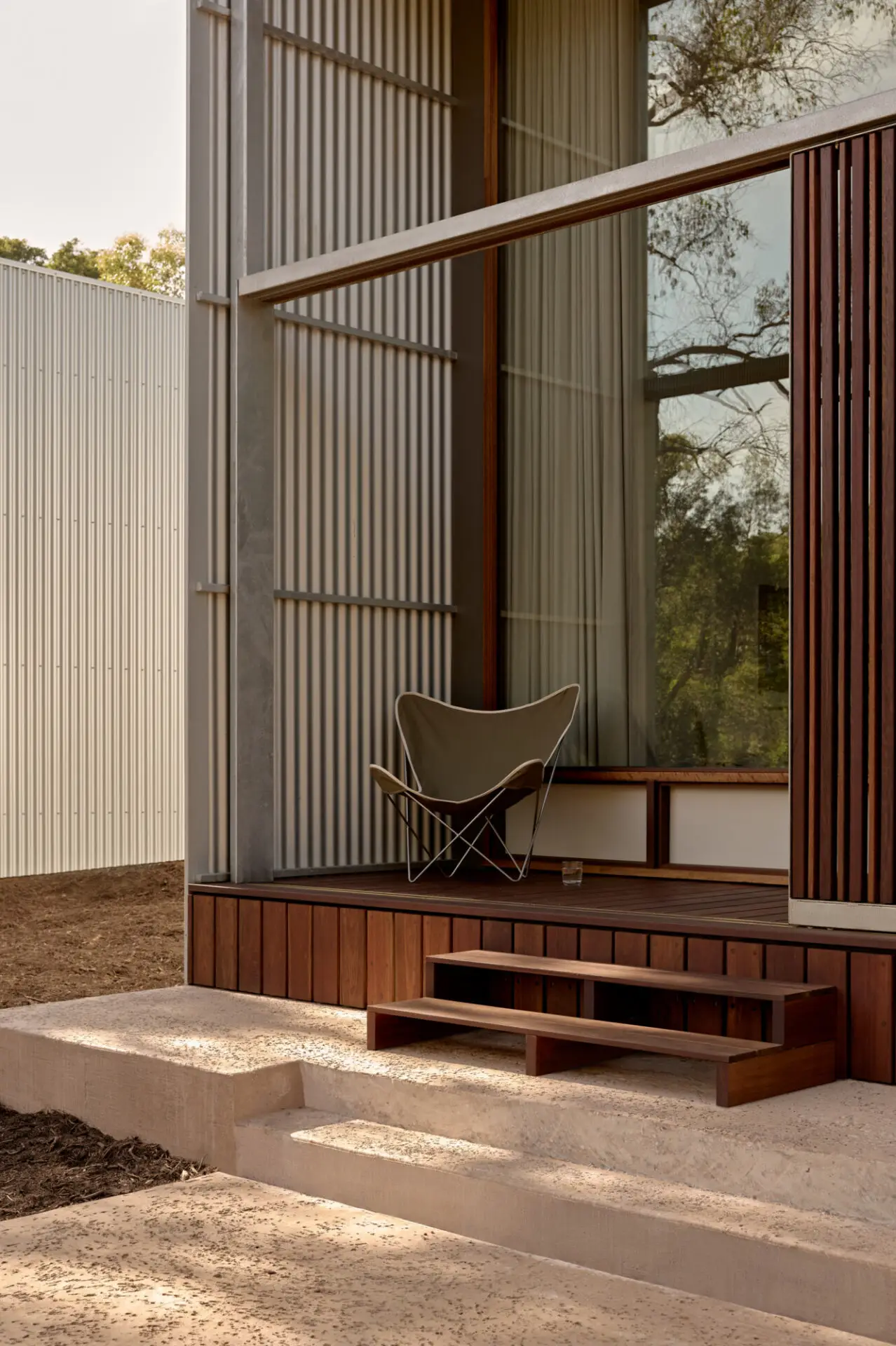 The architecture adopts a robust, utilitarian language inspired by shed typologies, sitting comfortably within the bush context. Dwellings are positioned in the location of former structures, carefully spaced to protect mature trees and allow landscape and views to pass through. Split-level interiors, configurable timber screens and private/public verandahs provide privacy, shade and visual connection to the bush.
