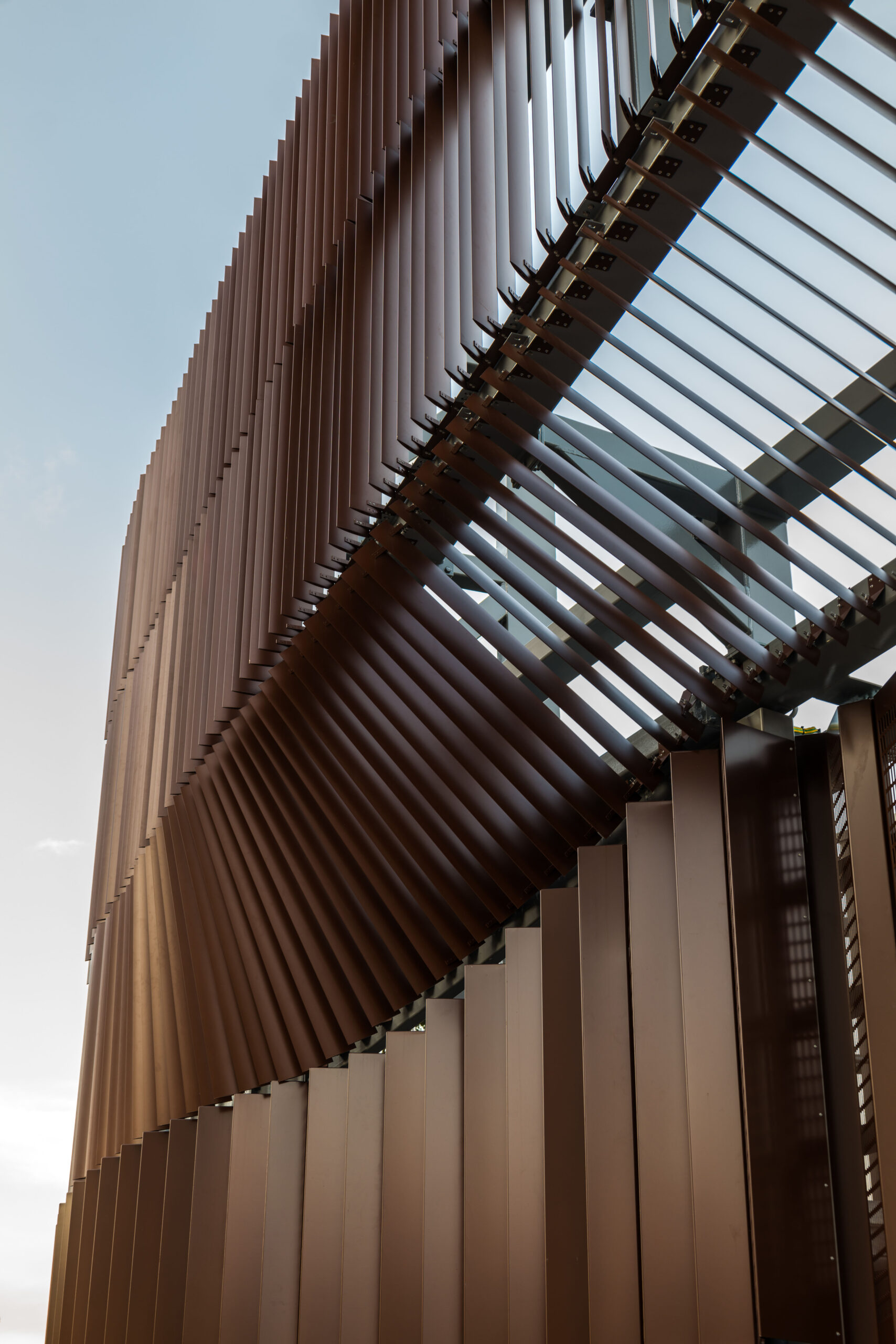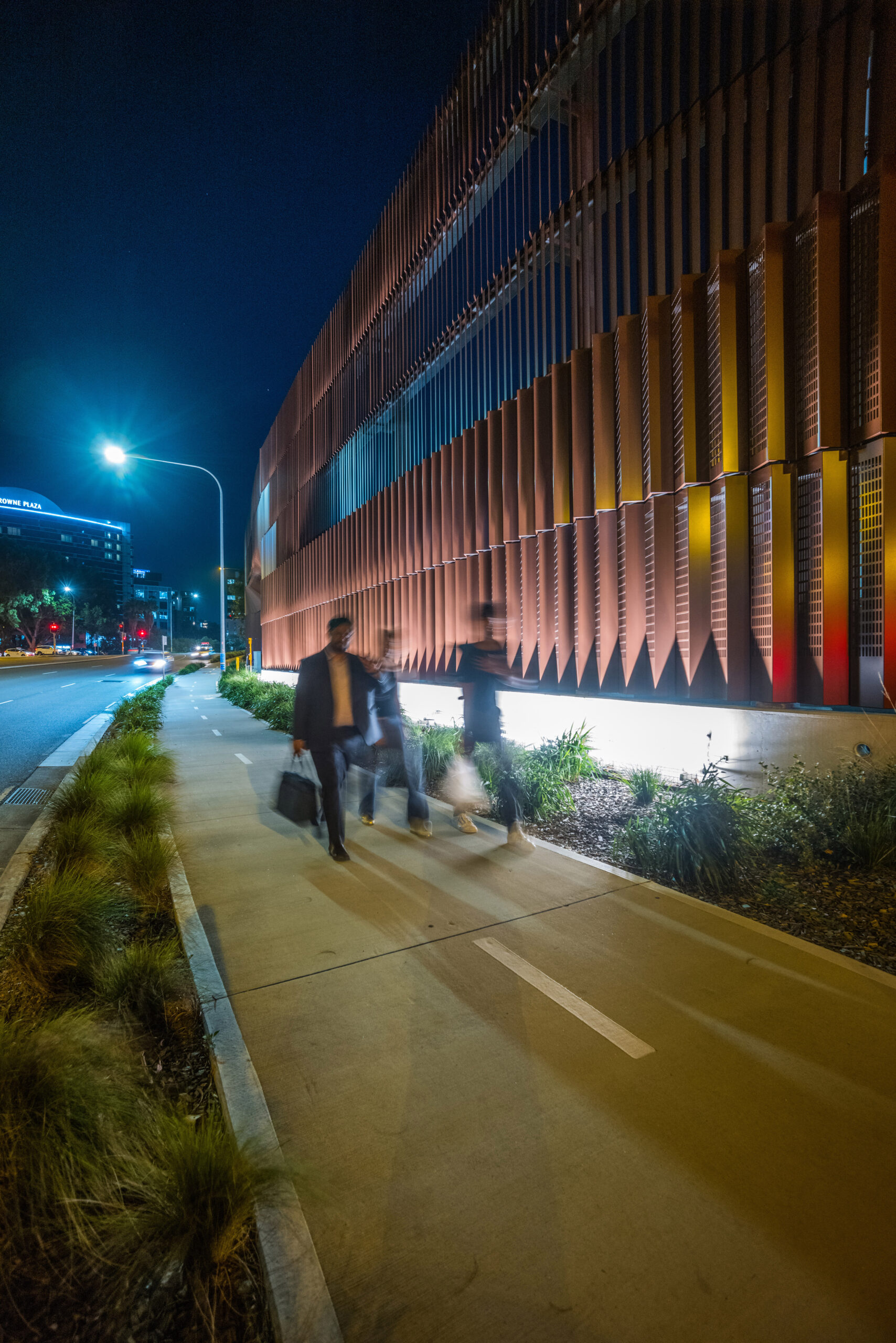 Shaped through parametric modelling, the screen is an immersive experience and thus invites curiosity and interaction upon closer inspection, and a fleeting sense of rhythm and motion through differences in opacity and openness. Fostered by the functional this intervention brings delight to the public domain of O’Riordan Street.