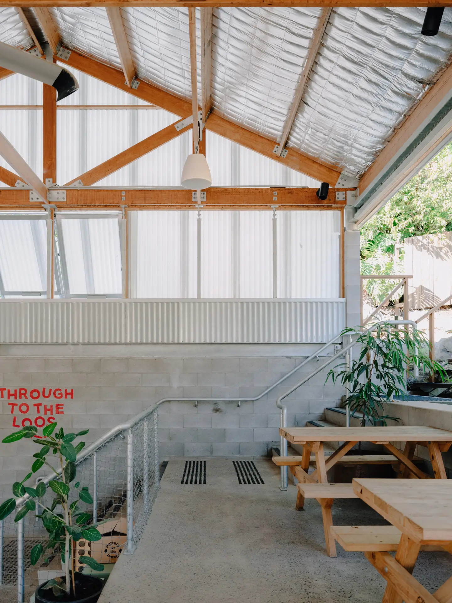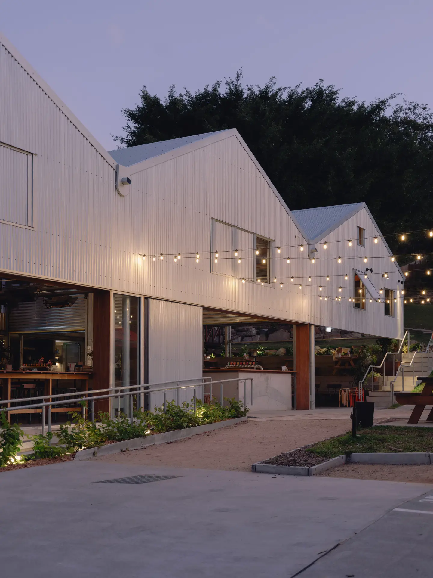 Designed by Five Mile Radius and Knight Wilson Architects, the project reconfigures site circulation, re-establishing a connection between Main Street and a previously underutilised rear landscape, now a publicly accessible, multi-use garden. A series of shed-inspired pavilions reference regional industrial typologies while integrating passive cooling, operable façades, and recycled materials, creating a climatically responsive and adaptable environment.