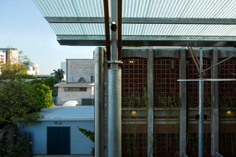 The new butterfly roof makes a statement and gracefully soars over the existing courtyard, honouring and embracing the original 1960s breezeblock building. The robust yet lightweight, contemporary roof structure features galvanised steel roof framing and spotted gum timber details. Raw, unrendered materials and an efficient structural design minimise construction costs. The strict yet artful structural detailing and use of large concealed cyclonic washers on the roof sheeting are creative solutions that respect the tropical environment.