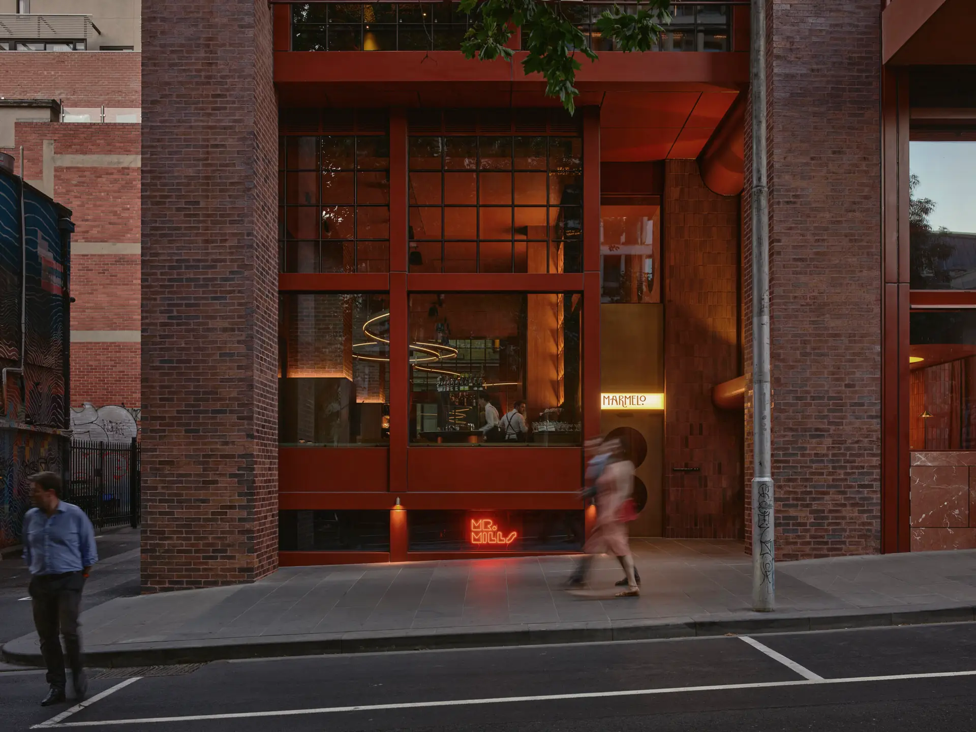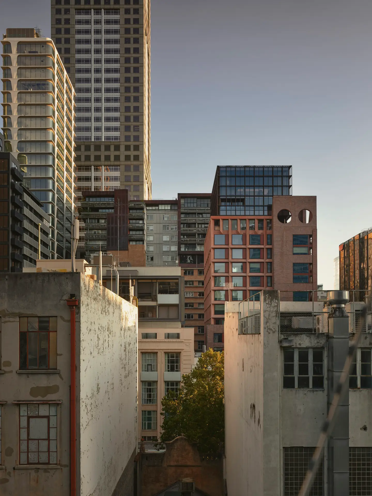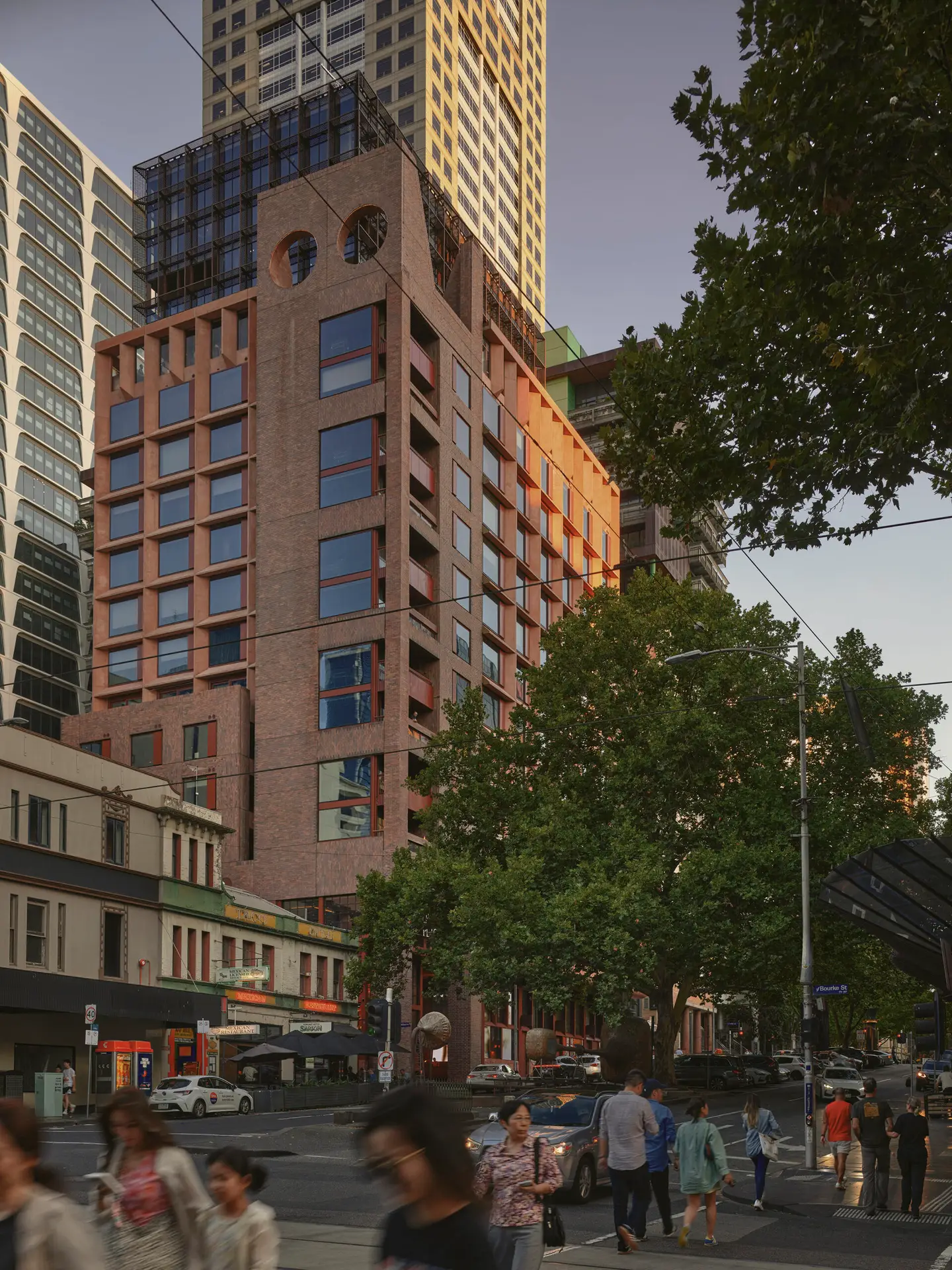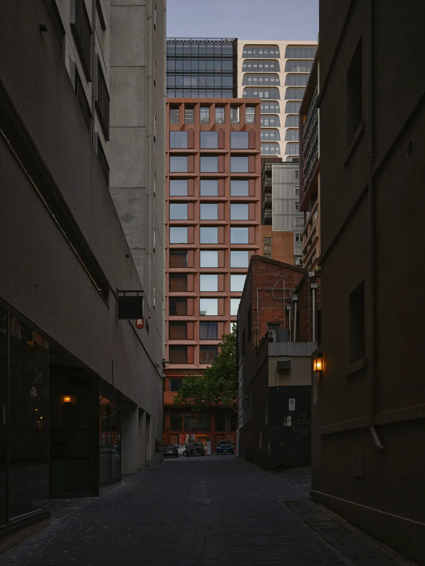 Melbourne Place aims to contribute to the wider city by being polite and well-mannered but also having a personality, introducing a familiar friend to Melburnians, recognisable, even memorable. The building is tactile and materially civic in quality and scale. It considers shelter, incorporation of planted habitats and the unique and exciting nature of laneways, the sense of discovery and city-ness of them. Melbourne Place has a porous and welcoming ground plane incorporating a series of high-quality and distinct edges. There is an active corner of balconies on the north-east, operable shutters to every guest room animating the façade and revealing the presence of people, a function-room balcony in the tree canopy and a roof top restaurant with two massive oculi which gaze out to the north – a visible, friendly presence in the city which looks back upon it.