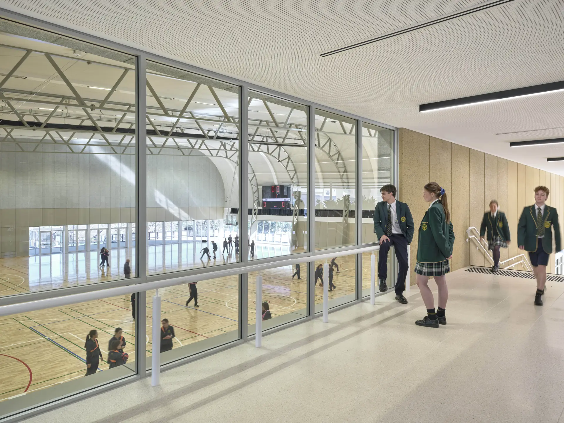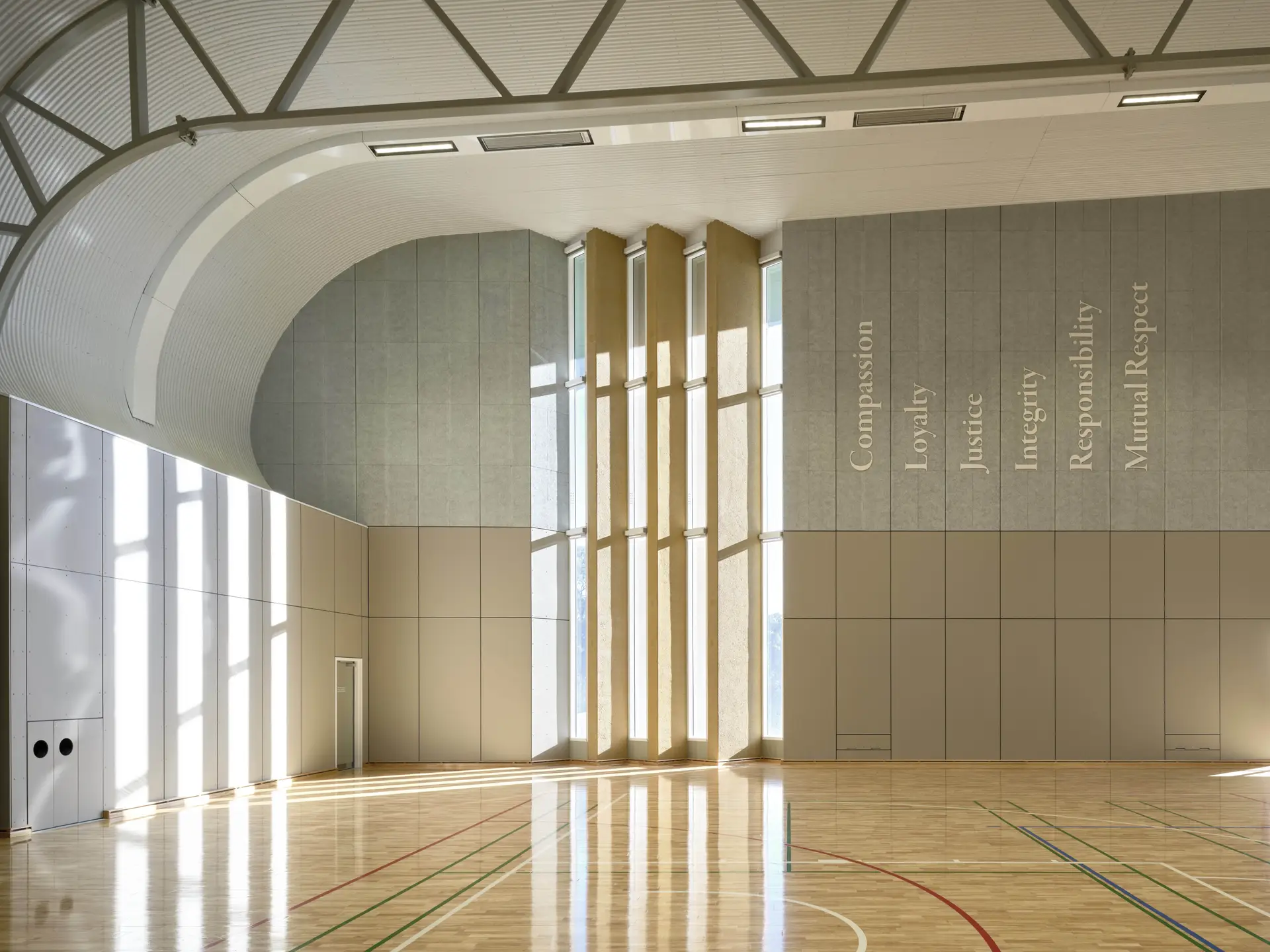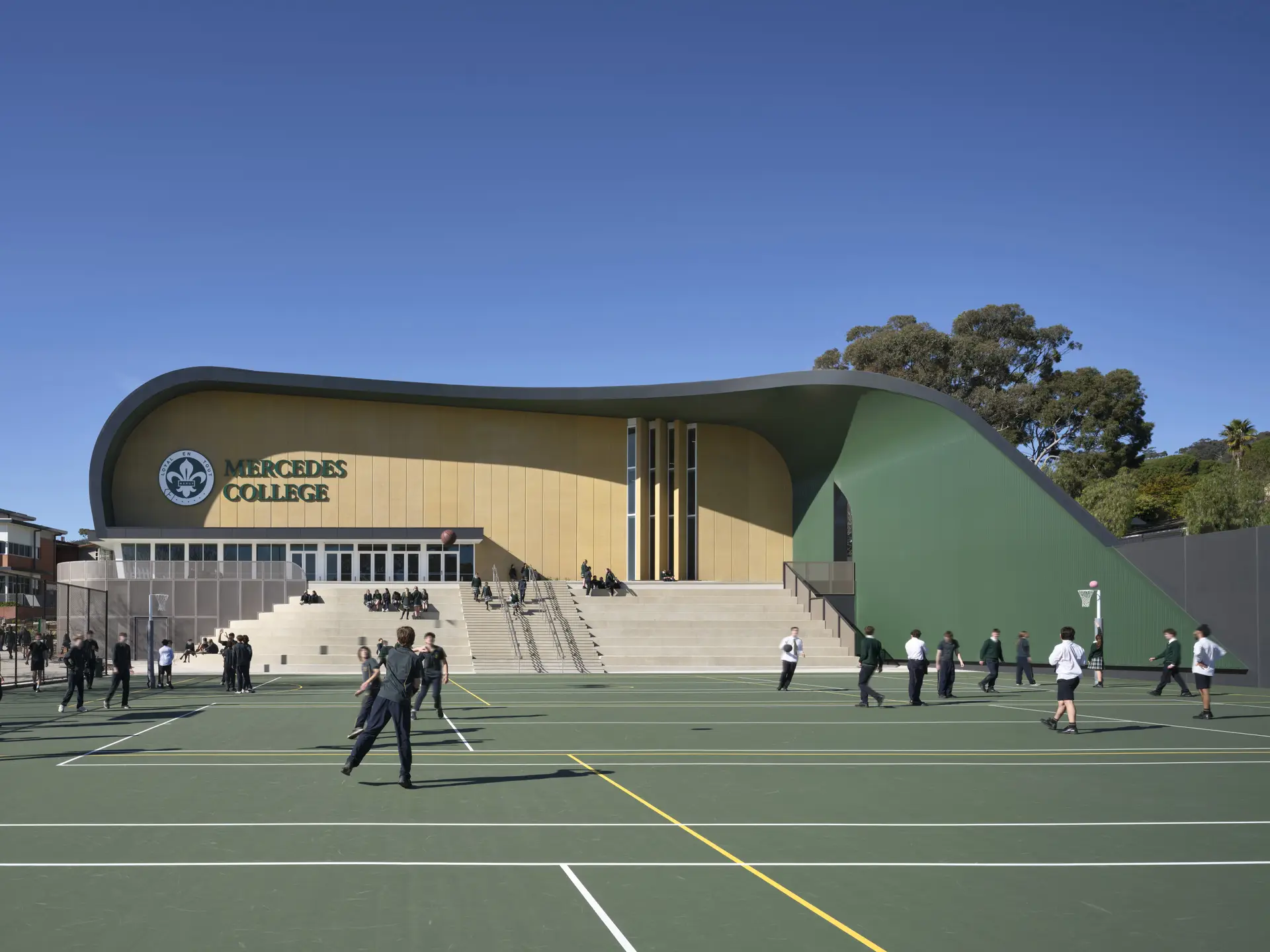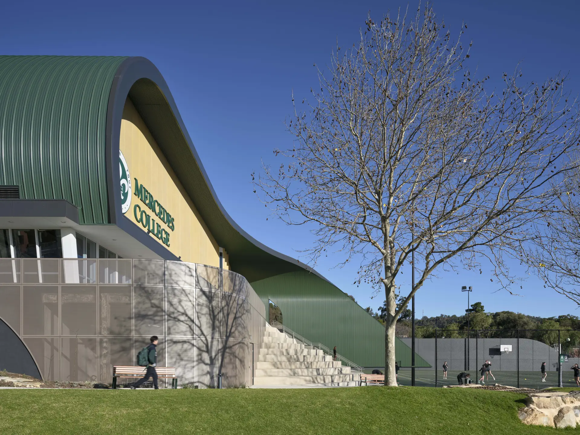 The brief for the Mercedes College Sports and Arts Precinct was to create a contemporary and flexible place for whole school gatherings with a focus on sport and the arts, providing a dedicated theatre and gymnasium. Aligned with Mercedes College Mercy Keys, the design is inspired by three key themes: body, mind and spirit. Movement, performance, and opportunities to gather underpin the physical experience of new and adapted buildings. Integrating with the surrounding landscape the project endeavours to encourage student wellbeing and liturgical tradition whilst connecting to nature and place.
