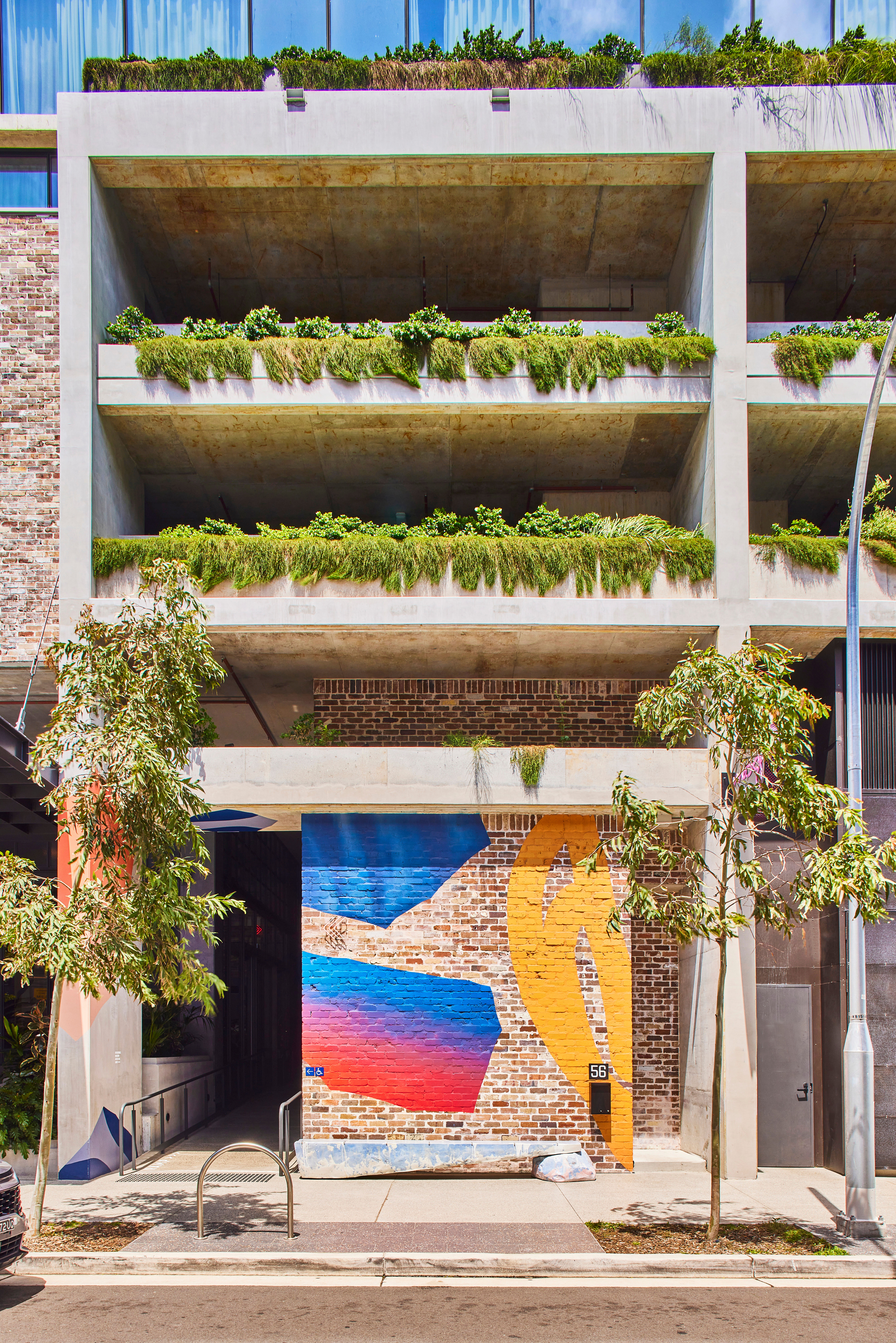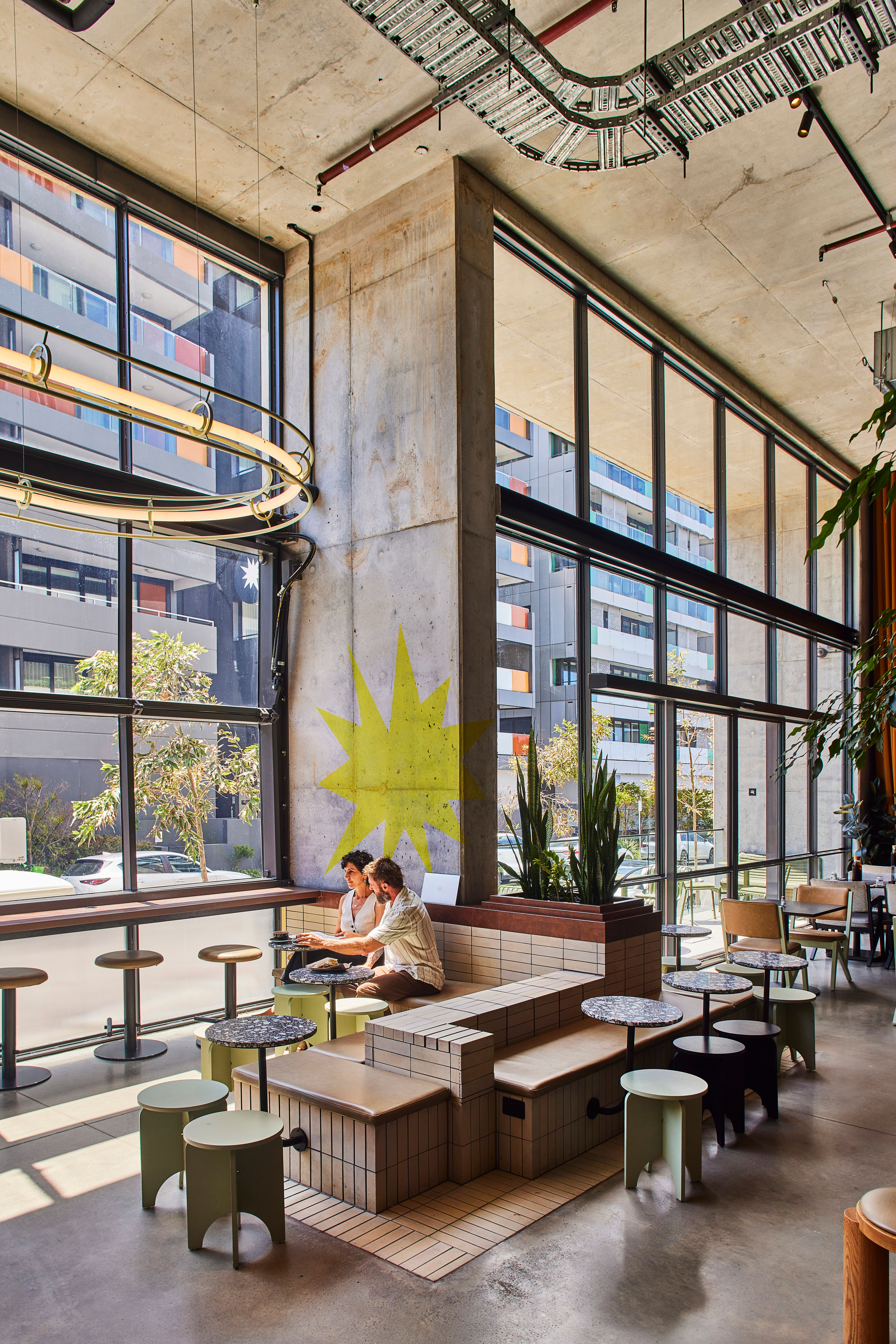 A multifunctional ground floor fosters social engagement with a cafe, co-working spaces and retail. Dynamic public art installations by Elliott Routledge enhance the hotel’s cultural appeal.