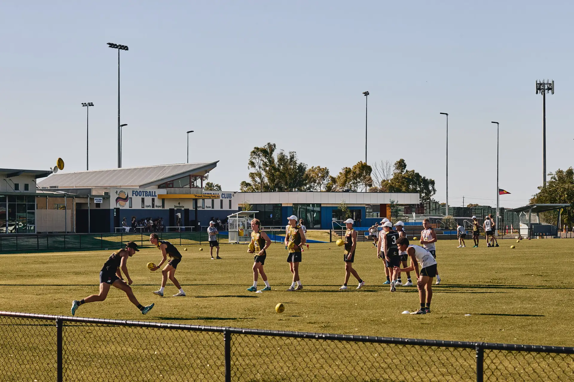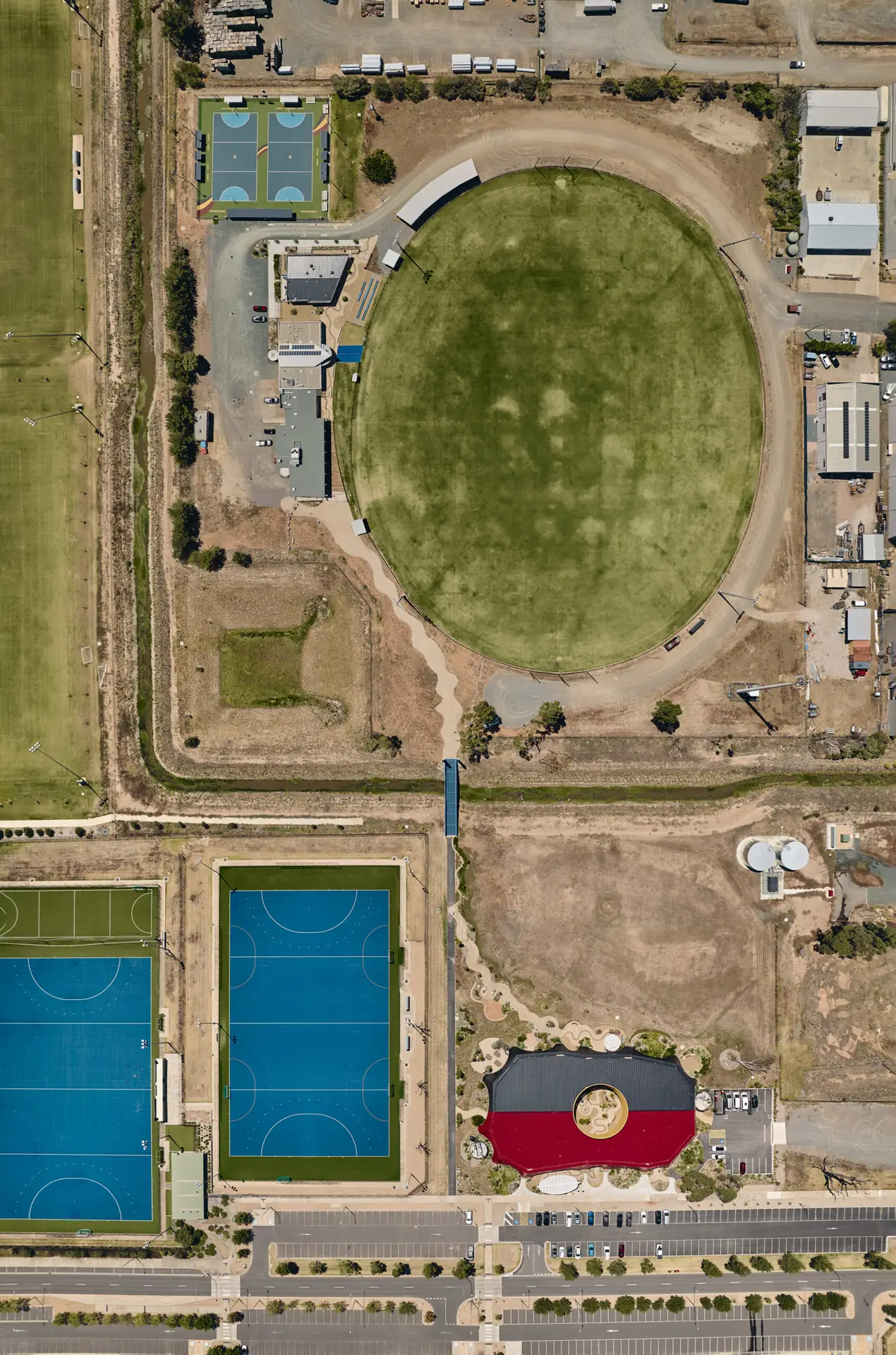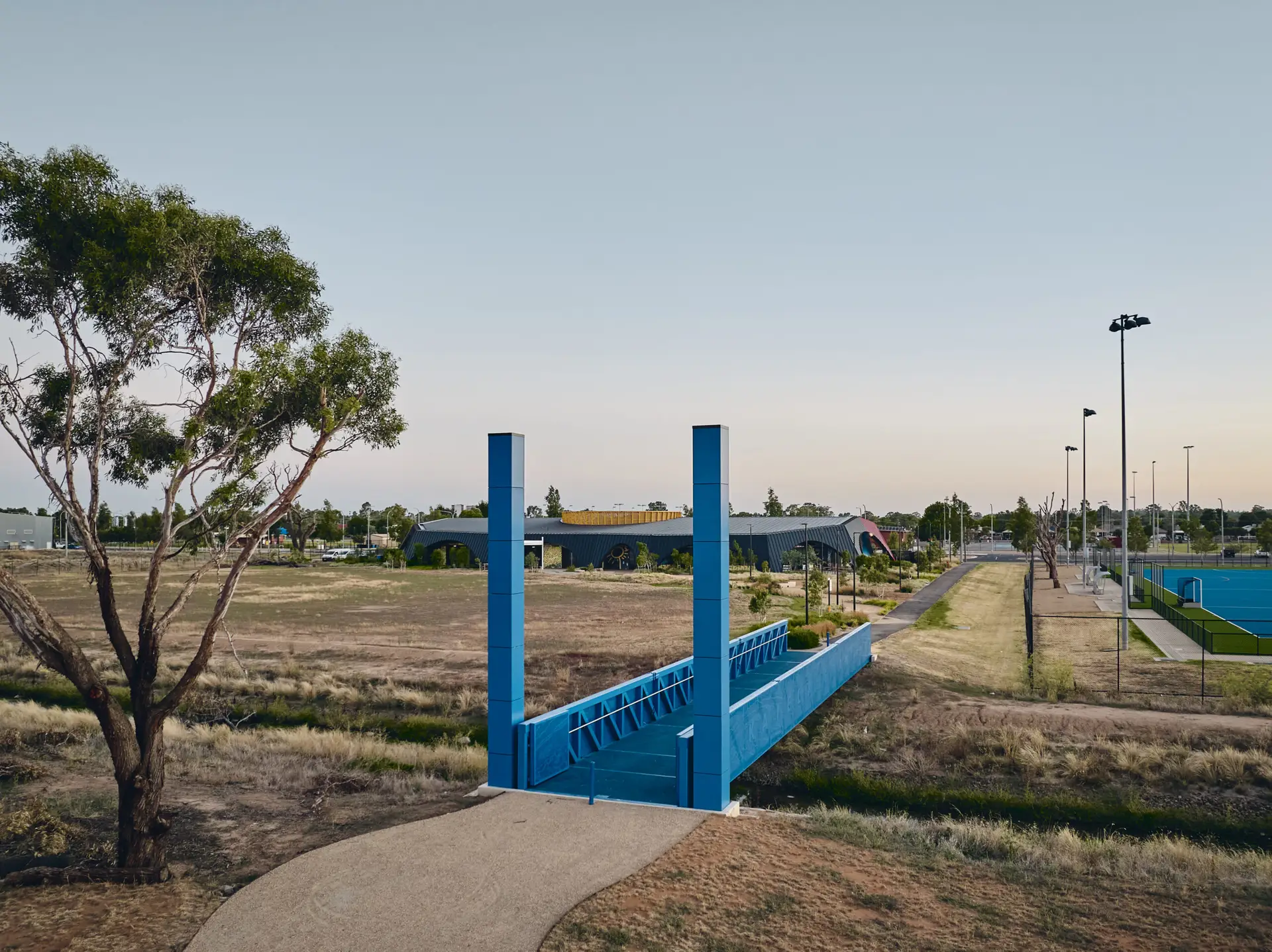 Munarra establishes a cultural heart within the Shepparton Sports Precinct, linking the previously isolated Rumbalara Football and Netball Club via a new blue bridge. Upgraded facilities, shaded gathering areas, and indigenous planting encourage community connection, storytelling, and learning. Passive design principles ensure year-round comfort, while workforce training spaces, including a commercial kitchen and café, support economic opportunities.