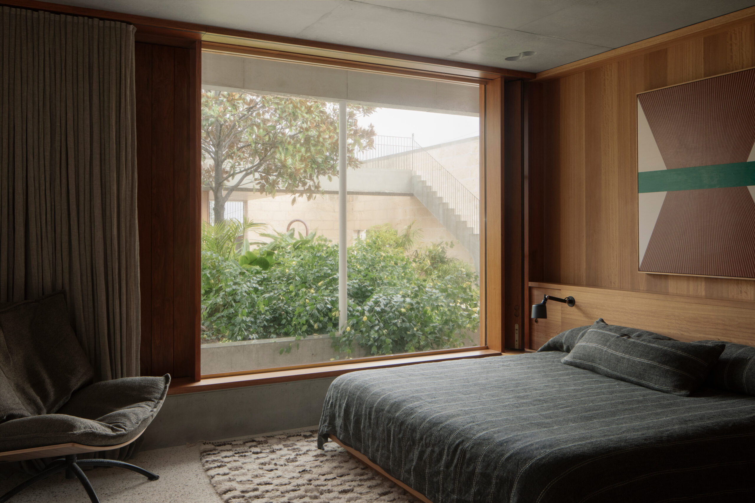 Quietly nestled in the foothills of southern Merewether, _New Castle_ manifests a subtle grandeur that is both ambitious and refined. Romantically envisioned as an invisible garden of paradise, the residence’s design is entirely encompassed within a walled garden, creating a _sub rosa_ sanctuary for its inhabitants. A thick limestone wall begins at one corner at hip height and rises to nearly two stories at the opposite corner, with a few thoughtfully placed openings offering intriguing glimpses of inside, which include a cluster of Cabbage tree palms and a mature evergreen Magnolia Grandiflora.