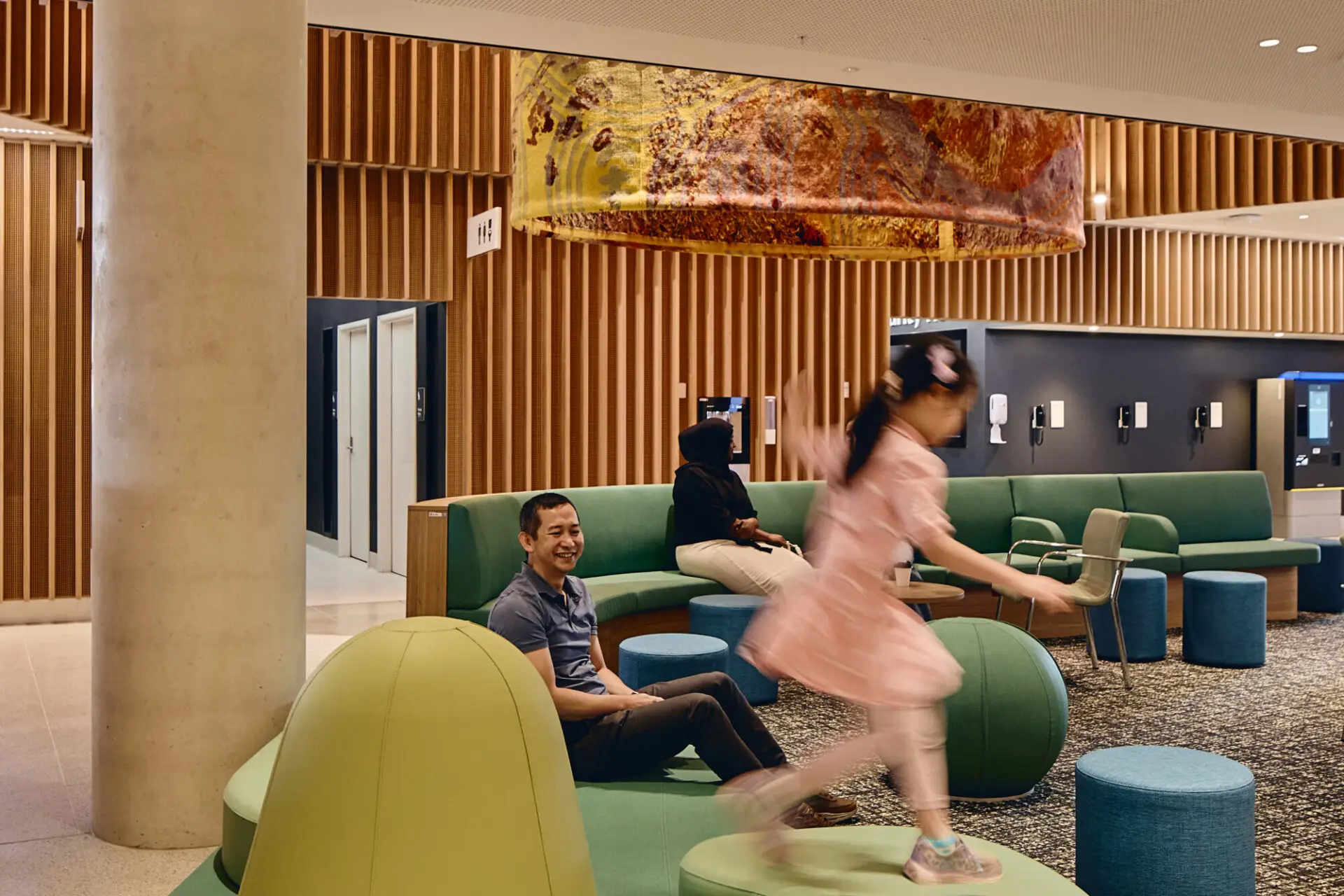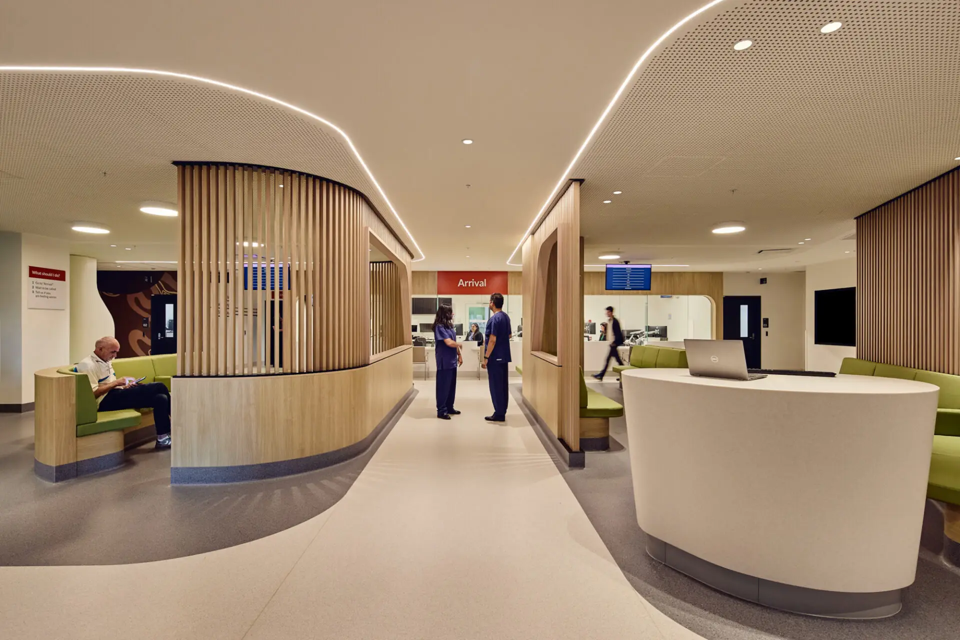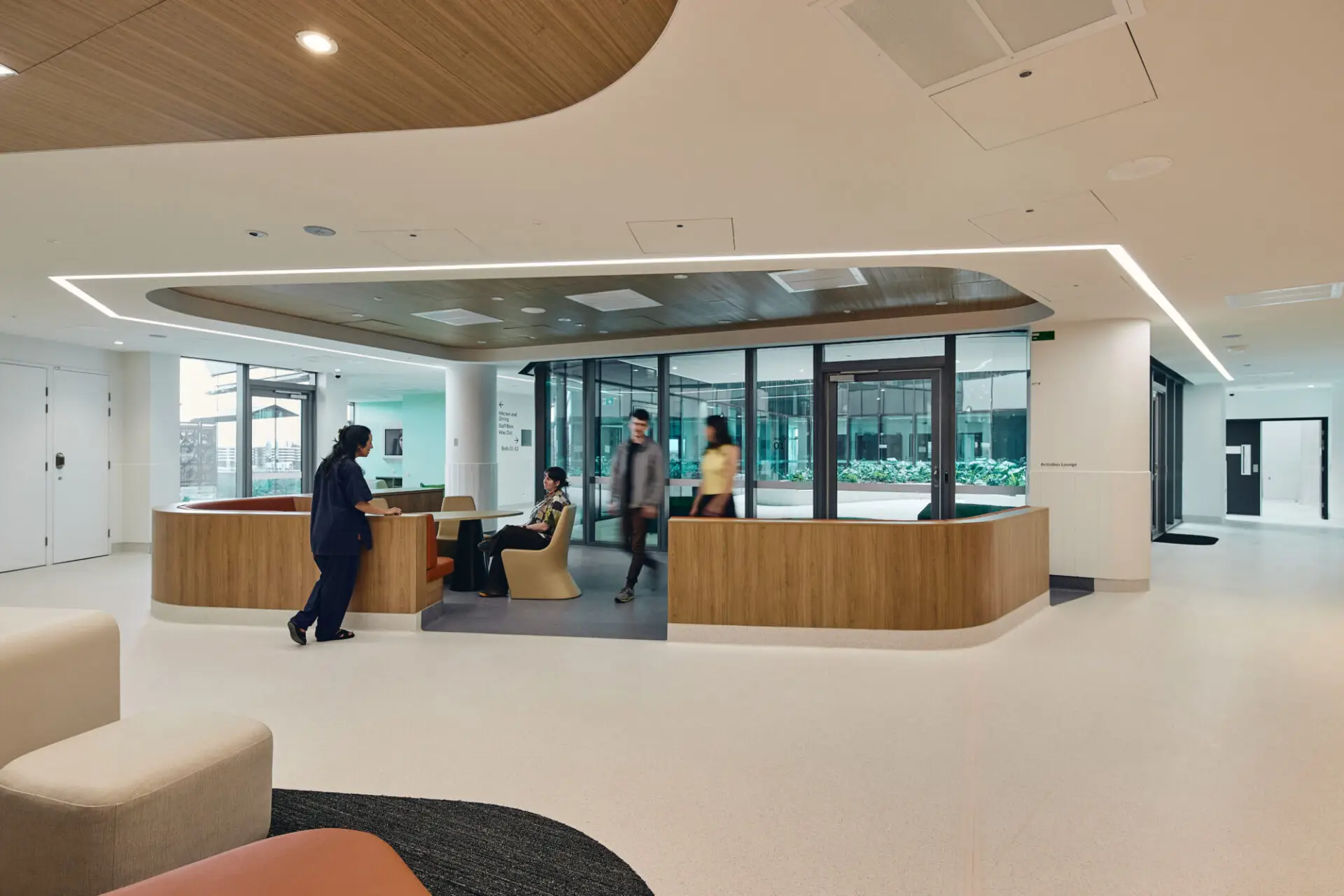 The campus is designed around five interconnected buildings, centred around a welcoming Village Green that invites public interaction. The interior design moves beyond traditional hospital aesthetics, integrating natural elements, warm timber finishes, and familiar materials like glazed mosaic tiles to enhance wayfinding.