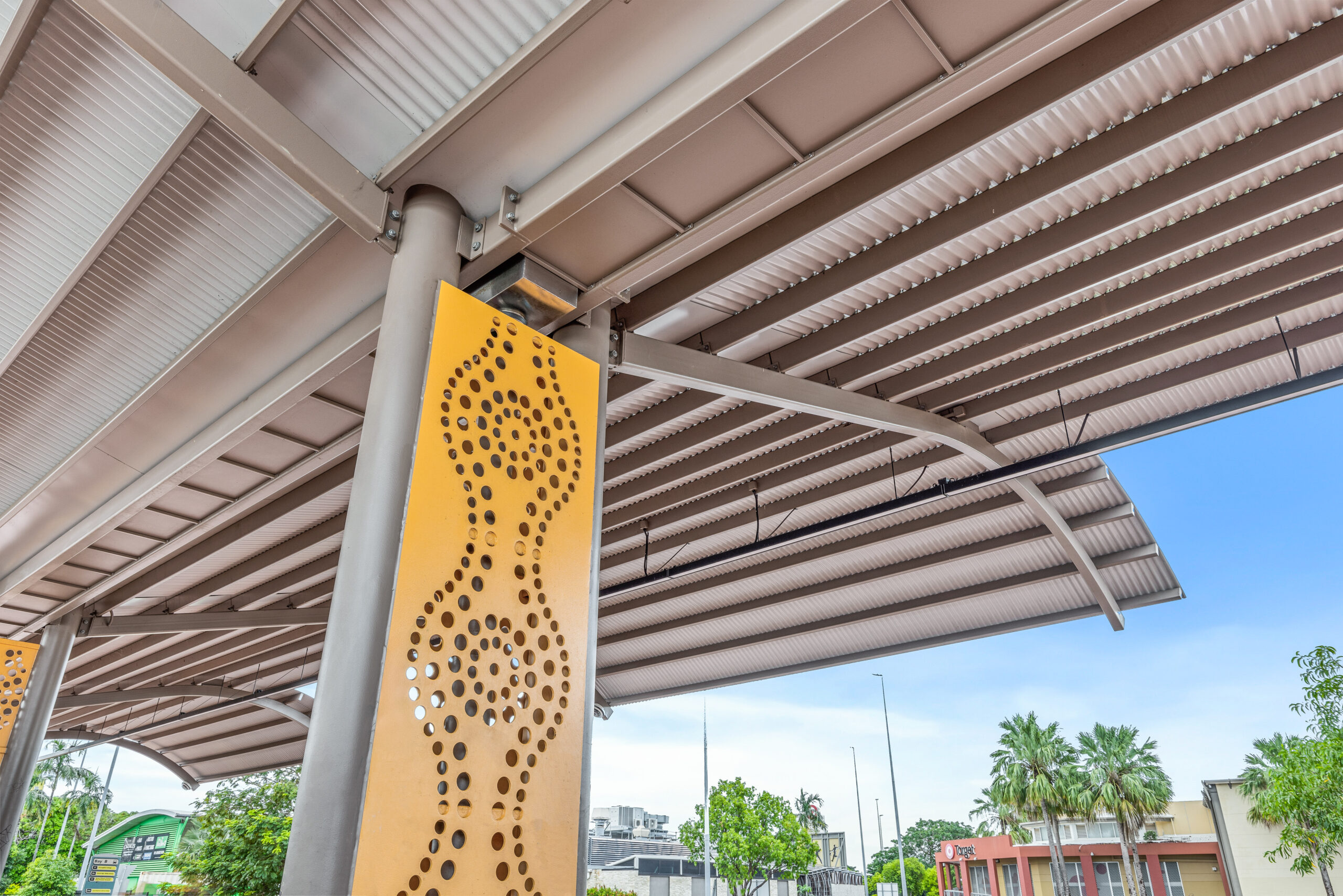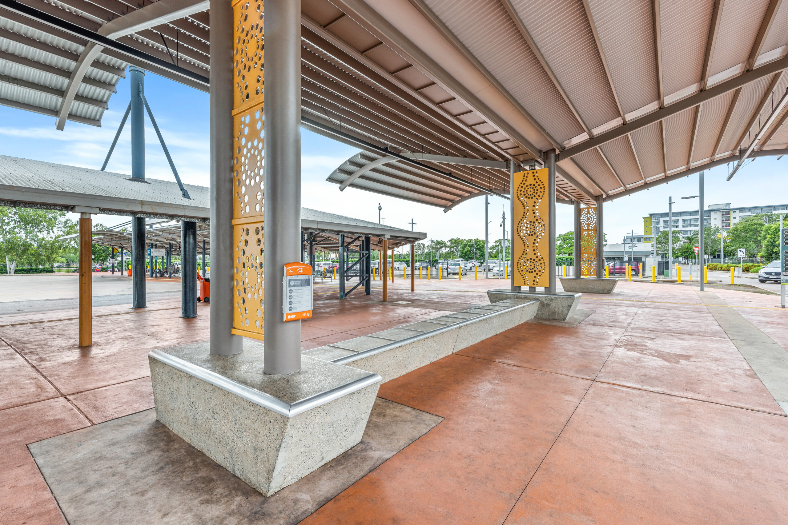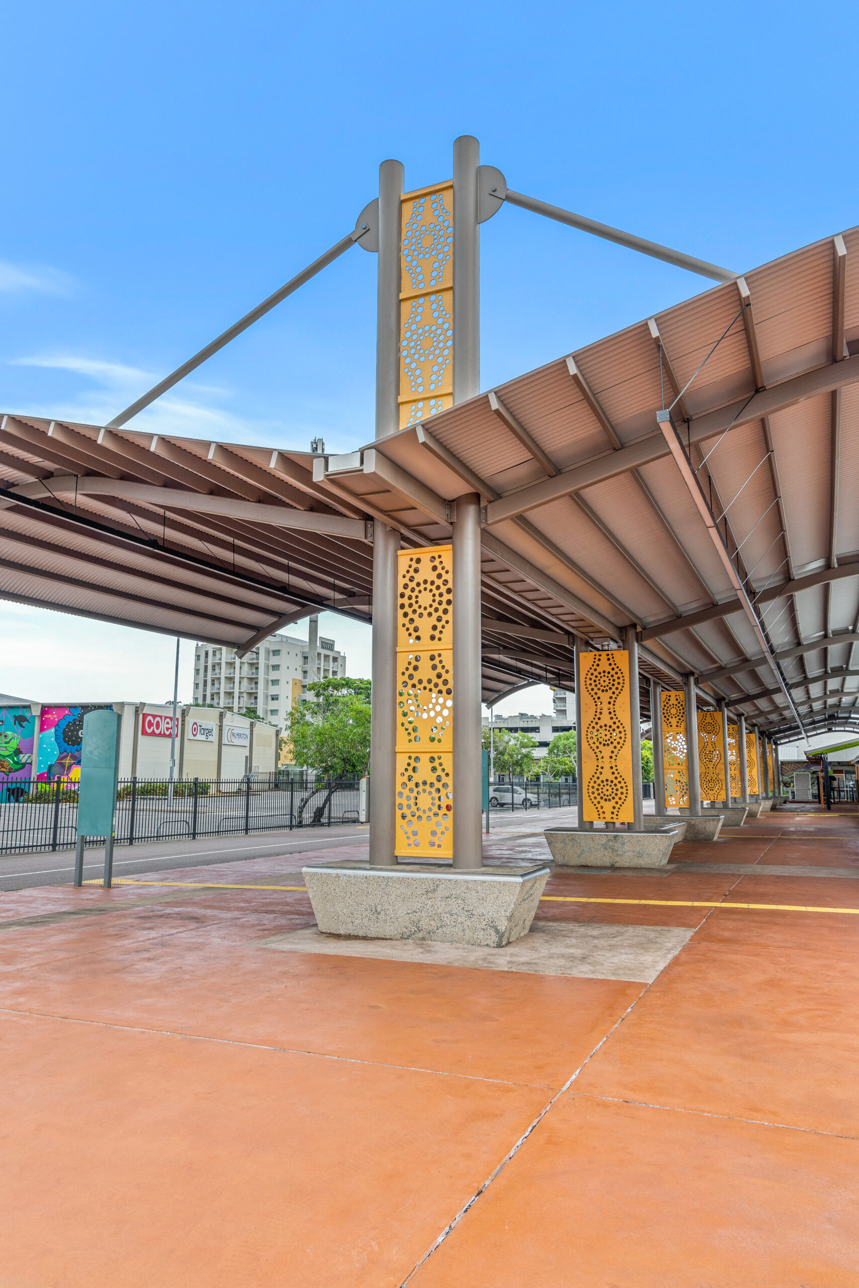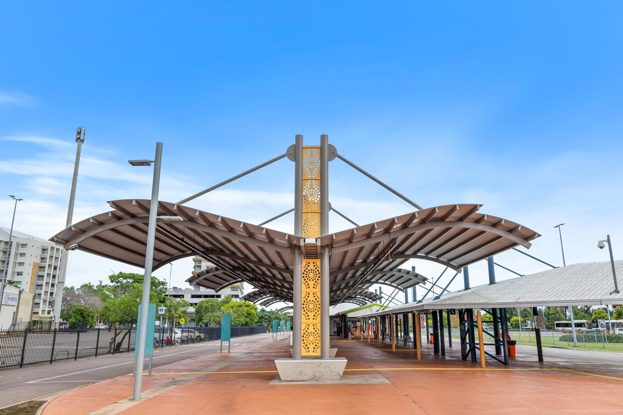 The new roof extension to the existing Palmerston Bus Interchange was developed in response to the increased number of commuters, and the need for additional weather protection. The new roof structure creates a safe, cool and dry environment, incorporating lighting and security. Additional seating was provided beneath the new roof structure.