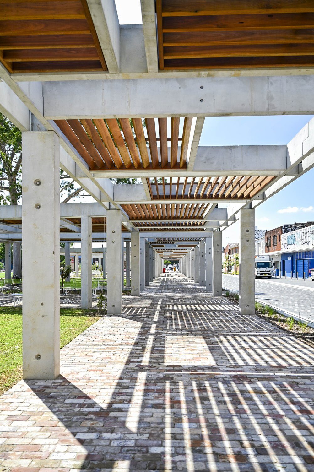 The new amenities building features stamped bricks recycled from a heritage home in Penrith arranged in a basket weave pattern and laid on edge to display the stamp. The façade facing north to the park is clad with wide hardwood planks with a cut-out pattern for views to the park and natural ventilation. The building’s planted roof includes four skylights, each painted internally with different colours, creating a playful lighting effect within the building. The overall design emphasizes sustainability and integration with the pergola and park.