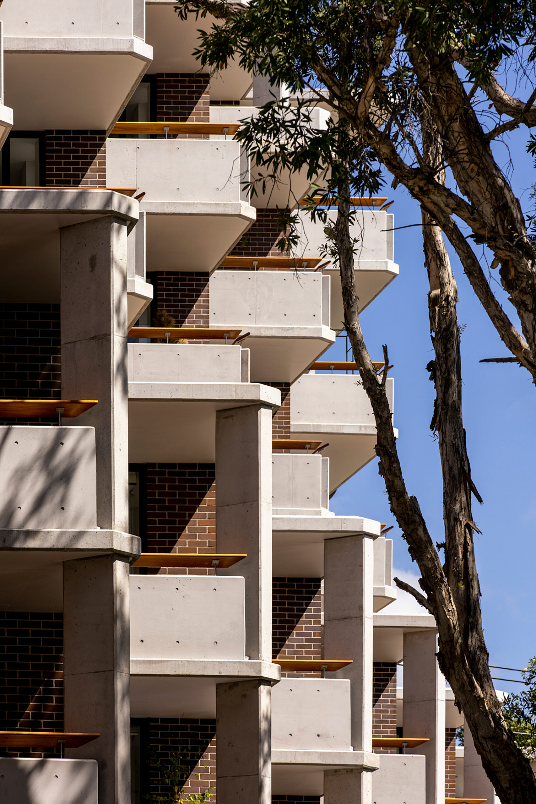 The building façade, reminiscent of the pattern of development of 19th century housing, is defined by crafted brickwork and off-form concrete – a modularised repetition of elements woven together to create a pattern of solid and void. The project’s 50 residential apartments are orientated to maximise on natural light and ventilation. Naturally ventilated accessways within the building reduce operational costs and provide strong connections between covered walkways and the outdoors.