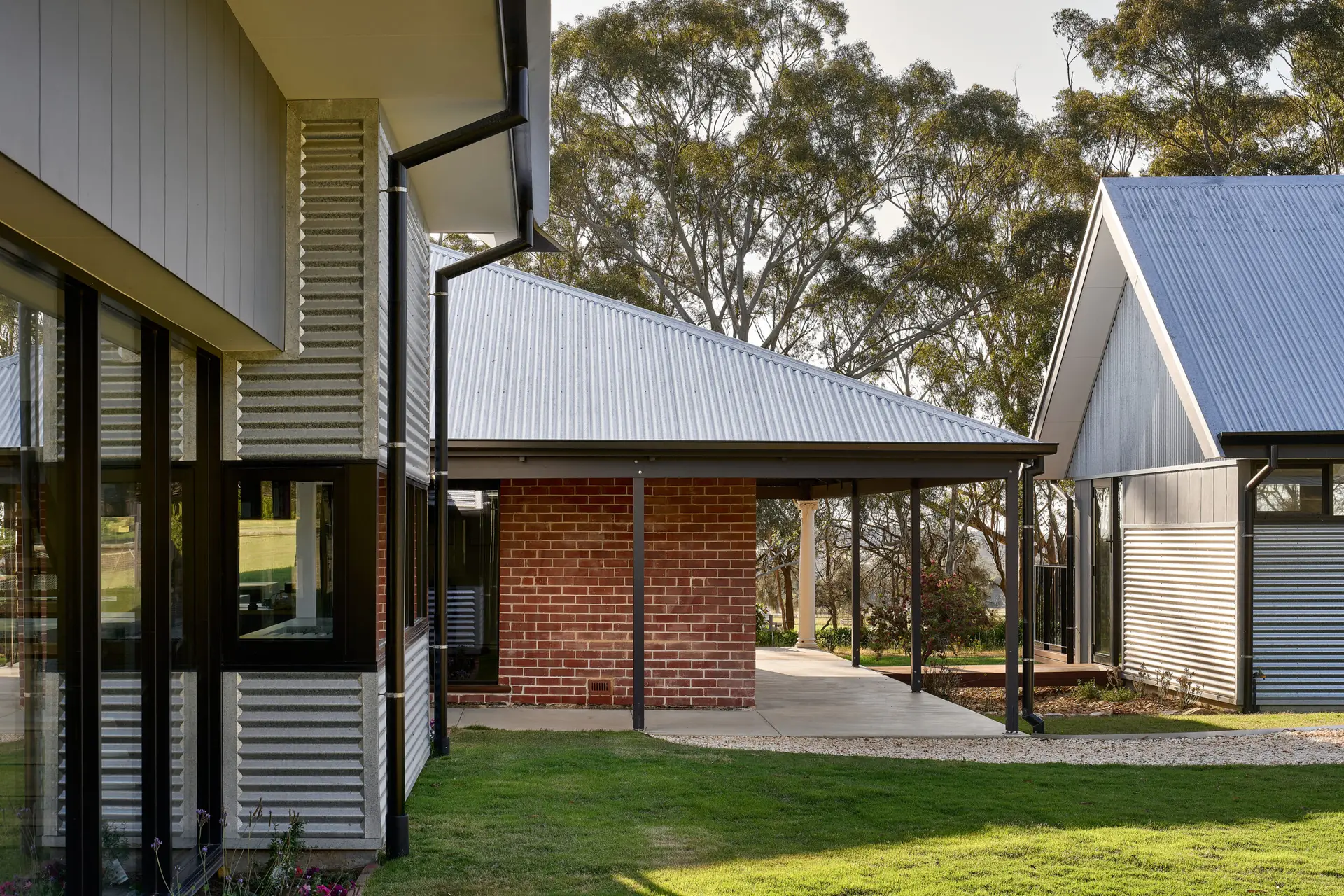 Our clients immediately warmed to the concept of buildings wrapping around a lawned courtyard – a format reminiscent of the cloistered courtyards of Oxford where they met. We shared the thought that the settler’s cottage was so unique it should be the focus from the entry.