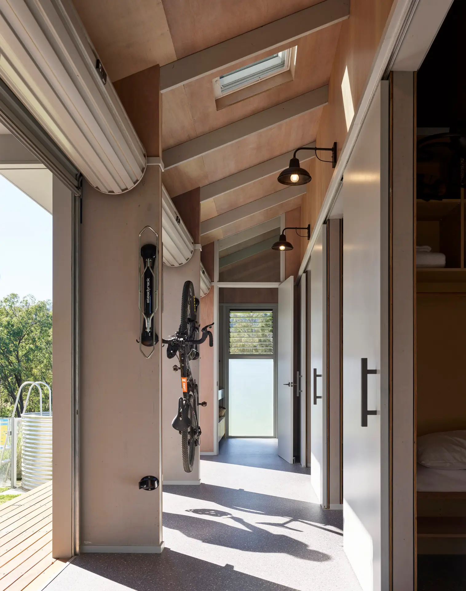Nestled in the rural landscape of Linville, Queensland, The Rail Trail Refuge offers short term accommodation for bicycle riders exploring the Brisbane Valley Rail Trail. Inspired by her cycling adventures in Europe, our client envisioned a safe, practical retreat catering to “Human Powered Holiday Makers.” The resulting design consists of two parallel modules—one housing a caretaker’s residence, the other providing comfortable overnight sleeping quarters and amenities for up to 6 cyclists. Between them, connected decks and a plunge pool create communal spaces for rest and connection, with the plan echoing the typology of traditional railway stations. The efficiency of the project’s compact footprint, use of raw materials and exposed handcrafted structure reflects Rail Trail Refuge’s rural context.