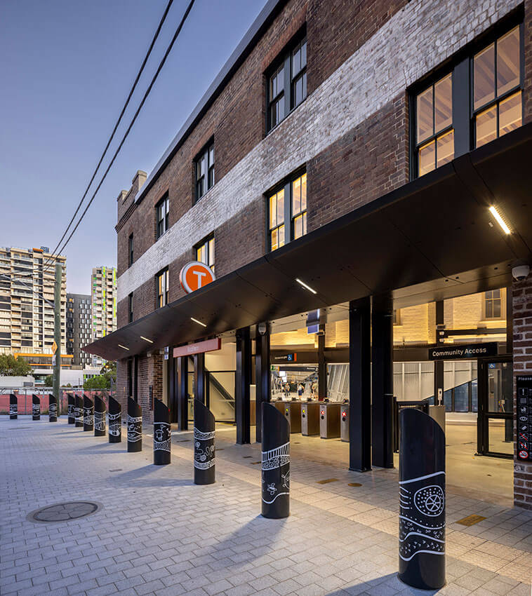 The State Heritage Listed Redfern Station Group, opened in 1884 as a collection of brick and stone structures, is associated with engineer-in-chief of the NSW Railways, John Whitton, and was originally served by the Eveleigh Railway Workshops and nearby residences. The new southern concourse entries at Marion and Little Eveleigh Streets demonstrate thoughtful and substantial interpretation of context by references to historiological users of the site including First Nations pre-settlement ecology and 20th Century industry, transport, and engineering themes by interpreting both wetland mists and steam motifs through a continuous perforated veil canopy.