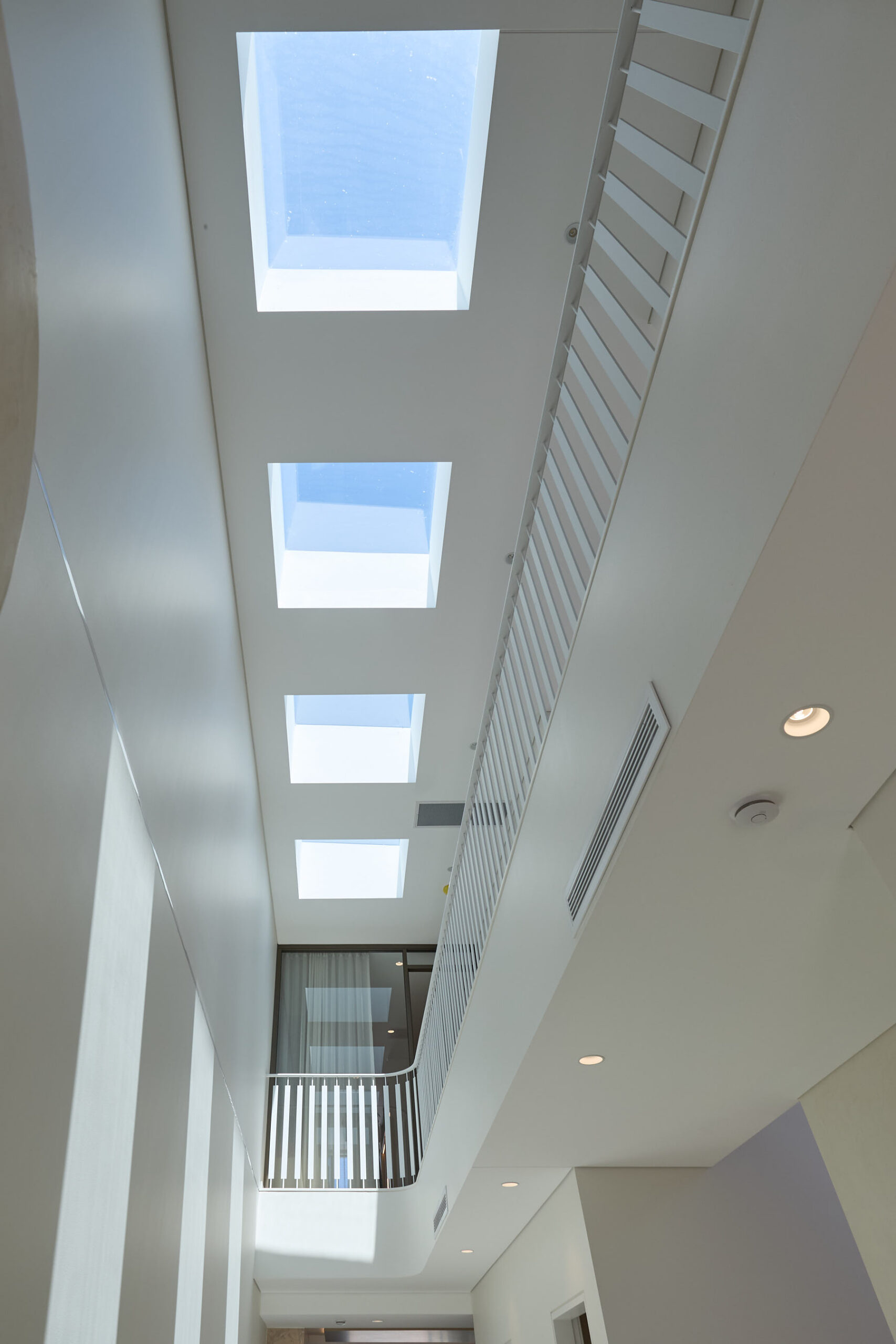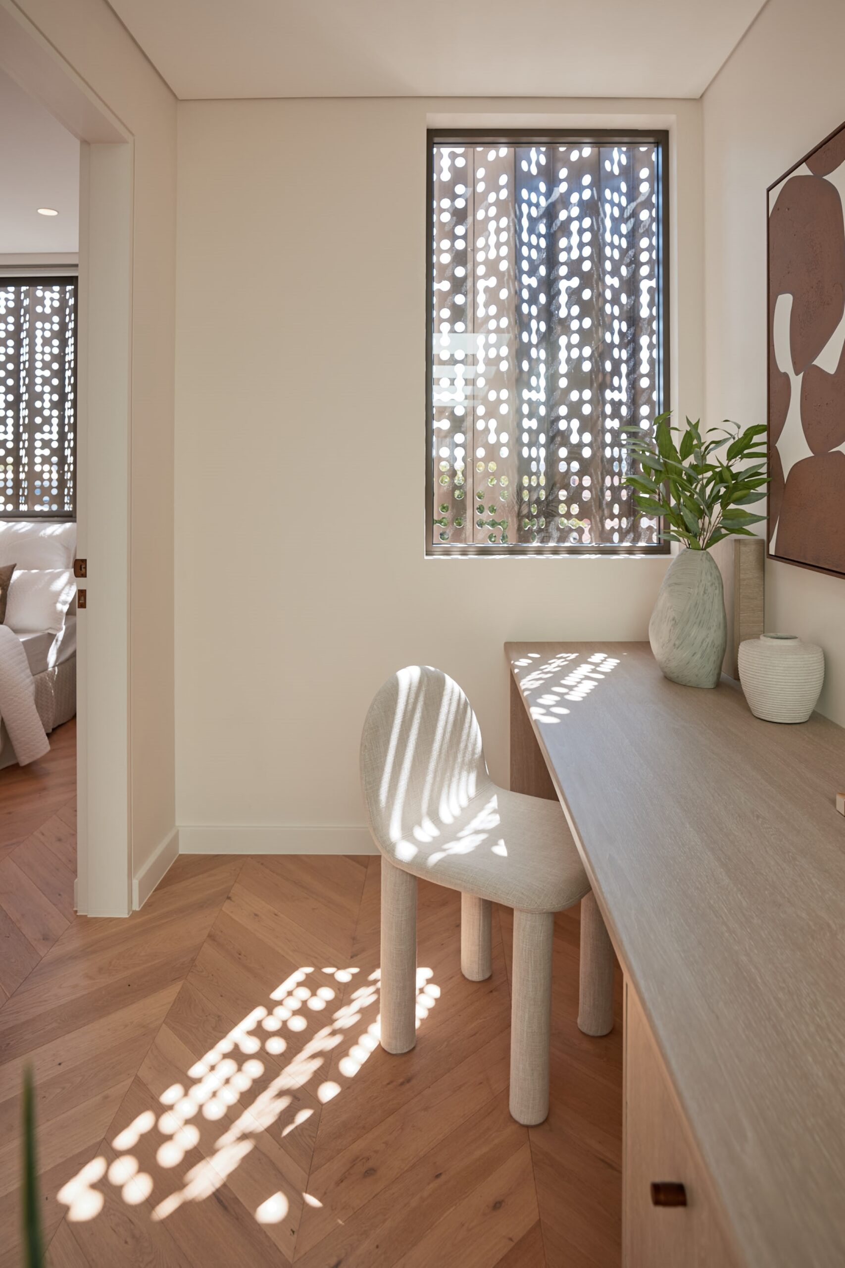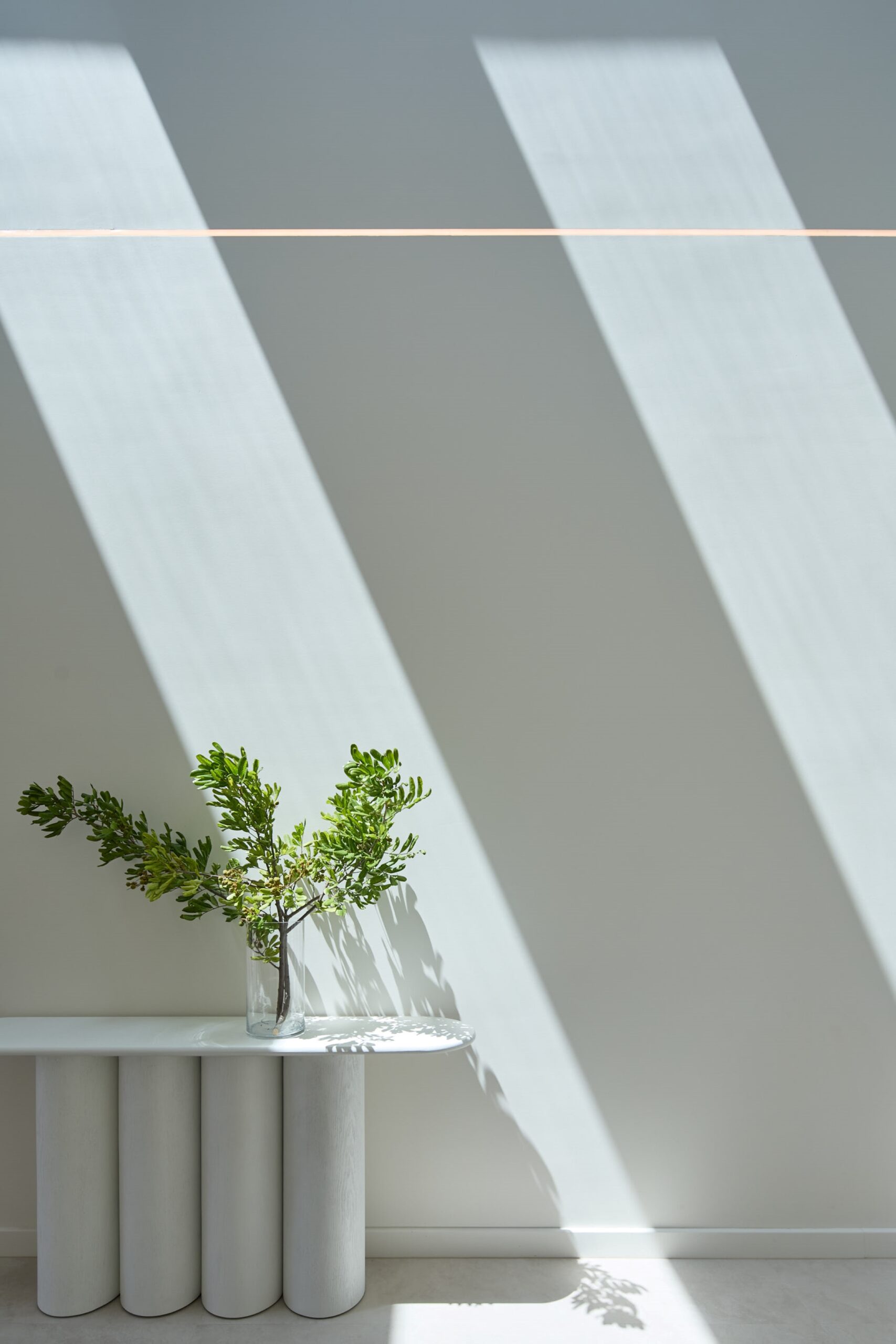 The design enhances the way they engage with their environment by fostering meaningful connections. The central void area between the two levels creates a sense of openness and encourages interaction between family members, making it easier to communicate. The kitchen island, positioned as the heart of the home, not only serves as a functional cooking space but also becomes a hub for conversation, bringing people together. A unique feature of the design is the dynamic light art, which changes throughout the day as natural light flows through the space. This evolving light pattern enhances the connection to the outdoors.