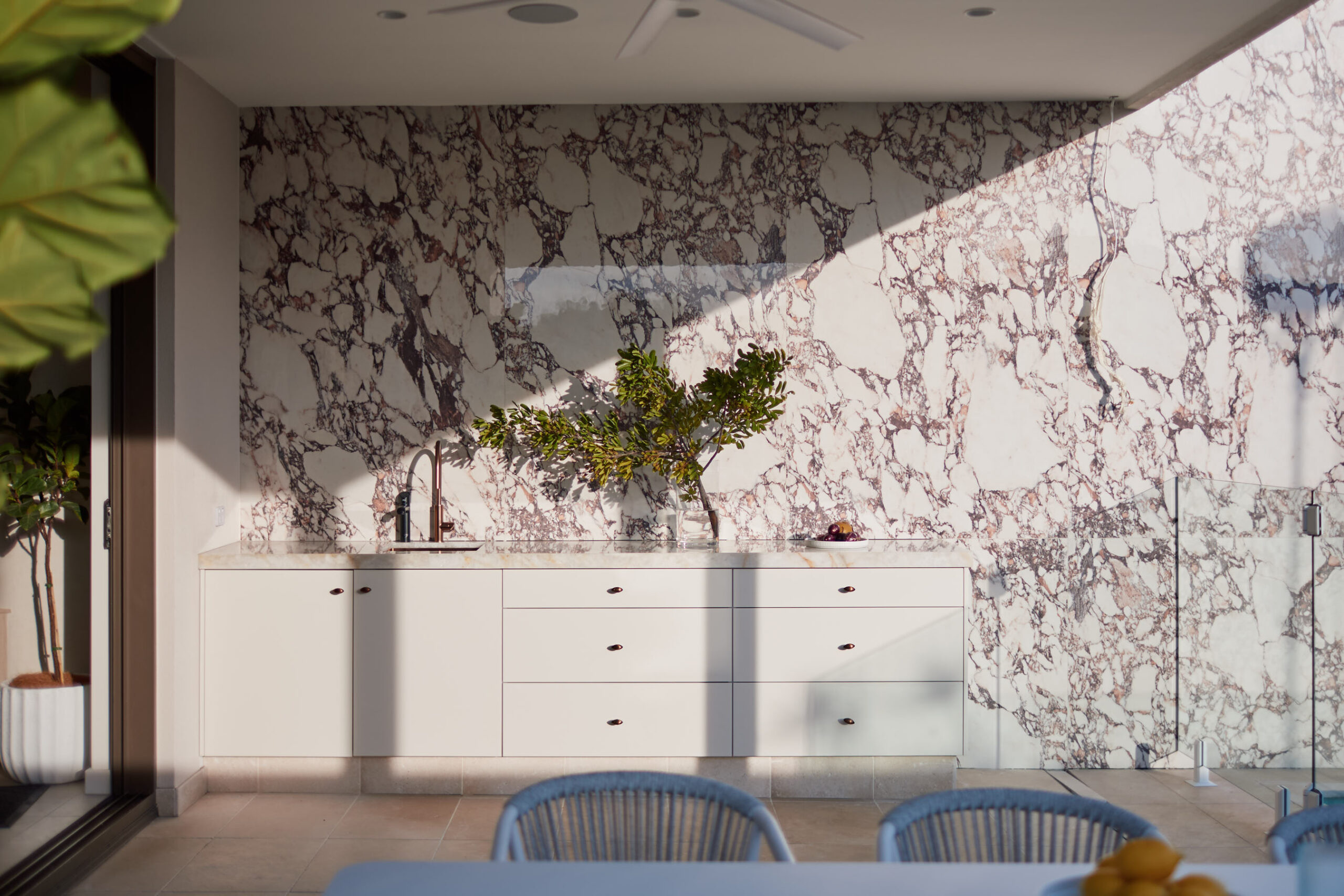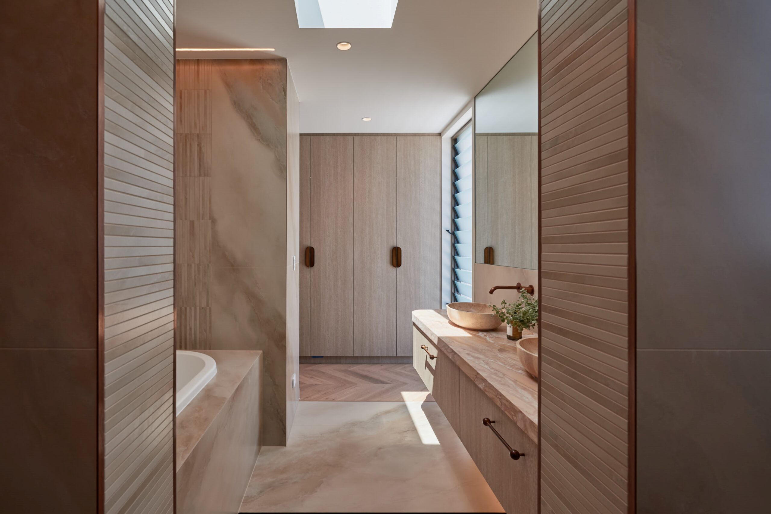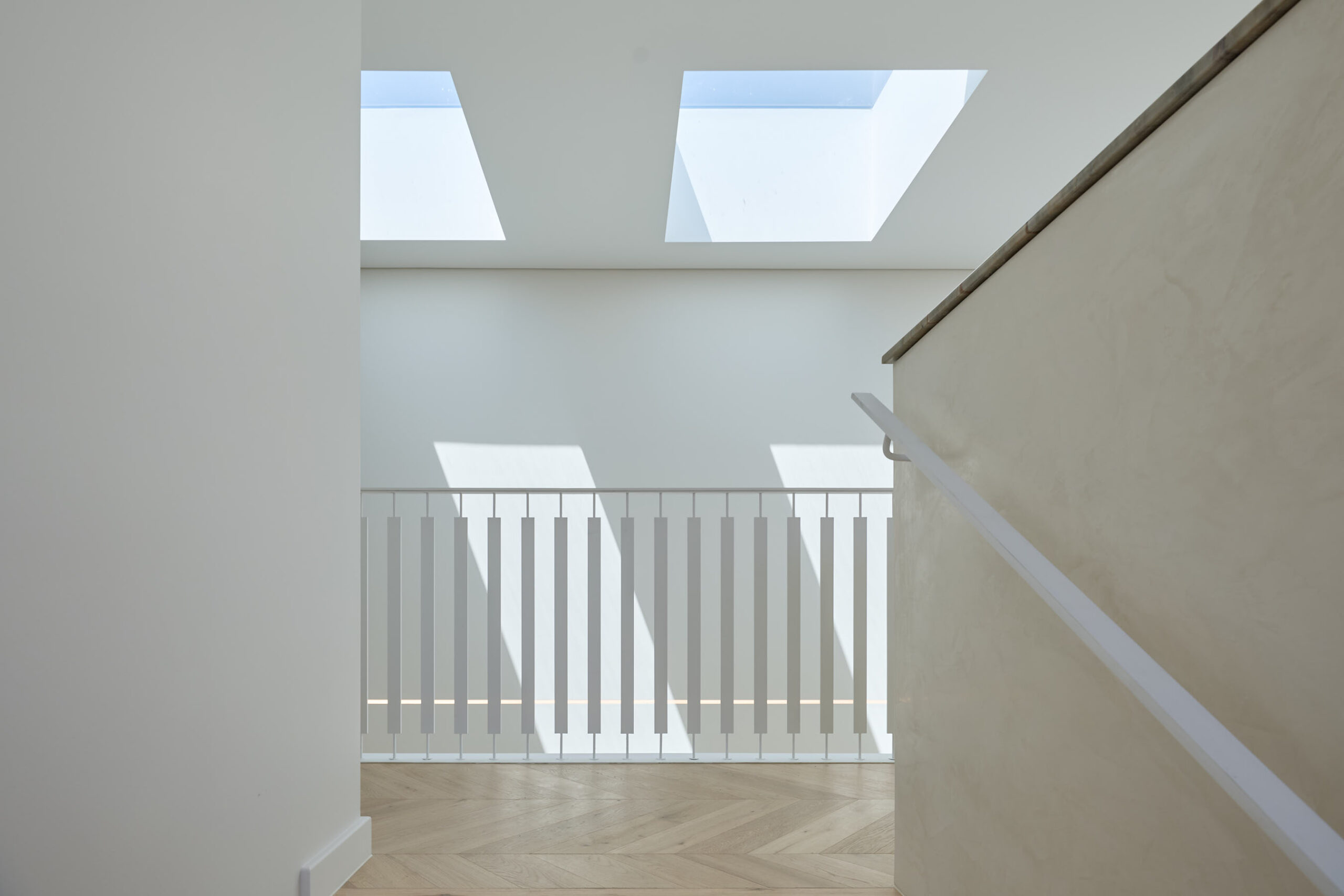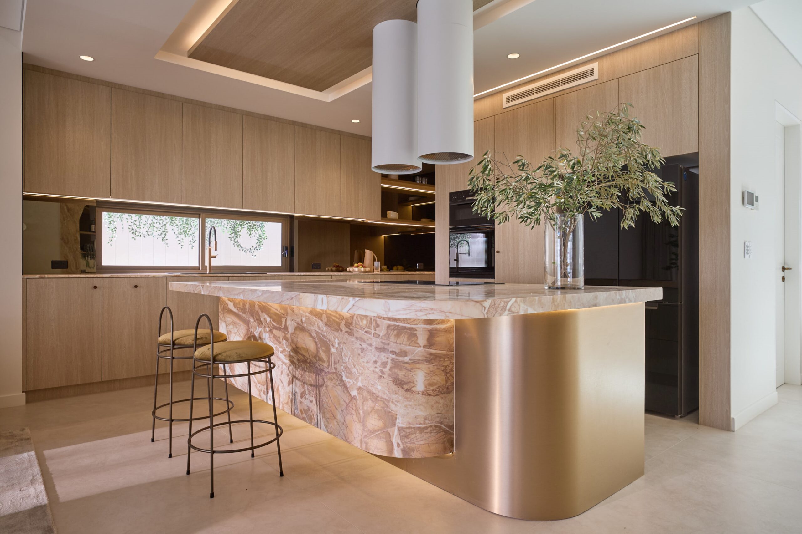 The design enhances the way they engage with their environment by fostering meaningful connections. The central void area between the two levels creates a sense of openness and encourages interaction between family members, making it easier to communicate. The kitchen island, positioned as the heart of the home, not only serves as a functional cooking space but also becomes a hub for conversation, bringing people together. A unique feature of the design is the dynamic light art, which changes throughout the day as natural light flows through the space. This evolving light pattern enhances the connection to the outdoors.