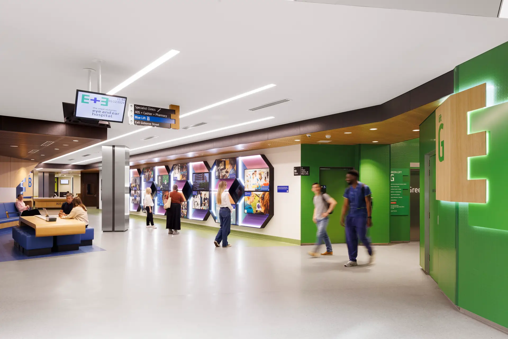 The redevelopment of The Royal Victorian Eye and Ear Hospital provides our patients, staff and visitors with upgraded, accessible facilities including a new Emergency Department, state-of-the-art operating theatres, consolidated patient services and an expanded education precinct. The consolidation streamlines processes and enhances communication, enabling seamless transitions between treatment and consultation areas for both patients and staff. The new design and navigation of the building supports both the visually impaired and the el-derly. Lyons’ design of the redeveloped facilities improves access to specialist care, reinforc-ing our legacy of innovation and the delivery of world-class patient care well into the future.
