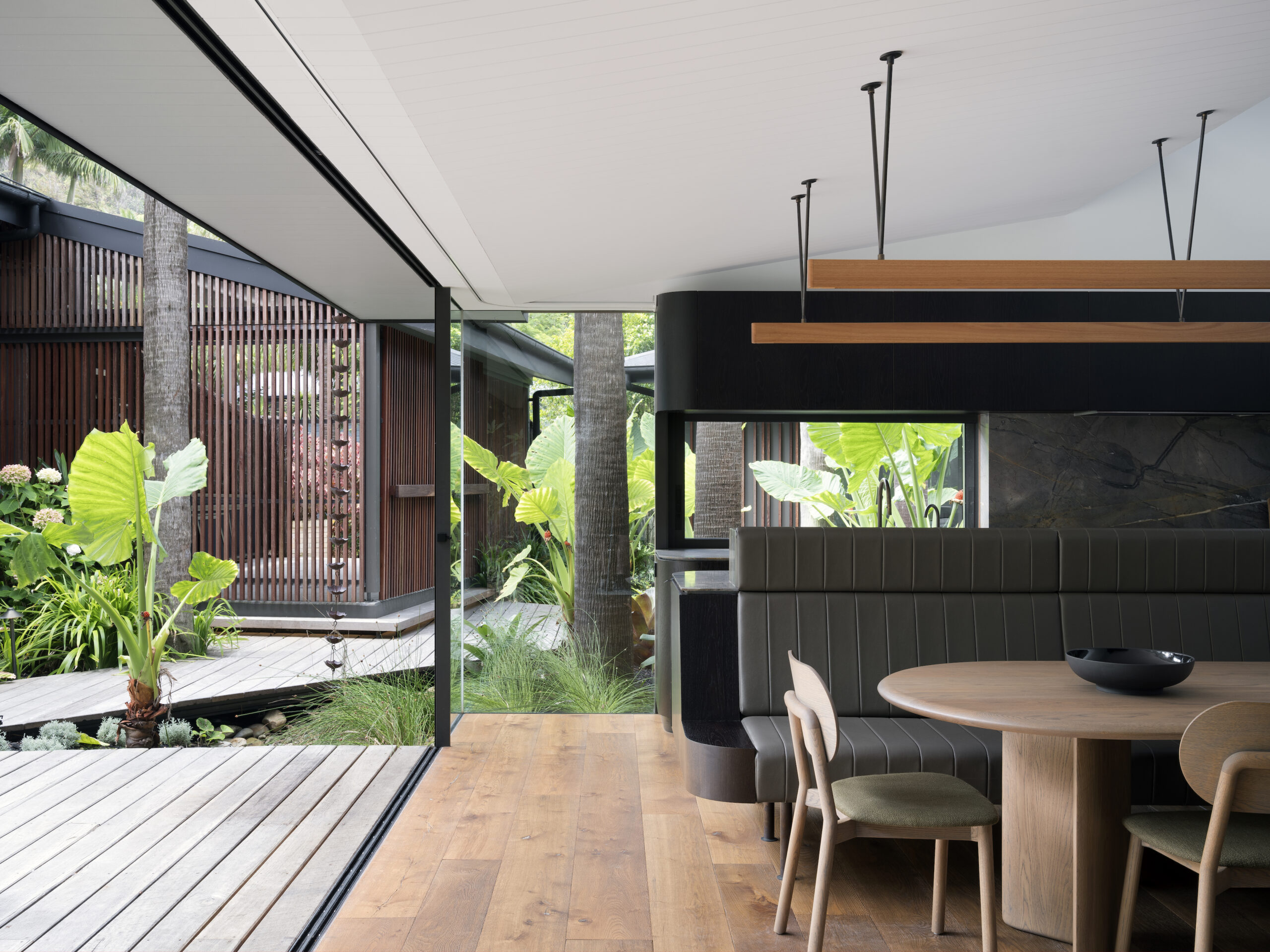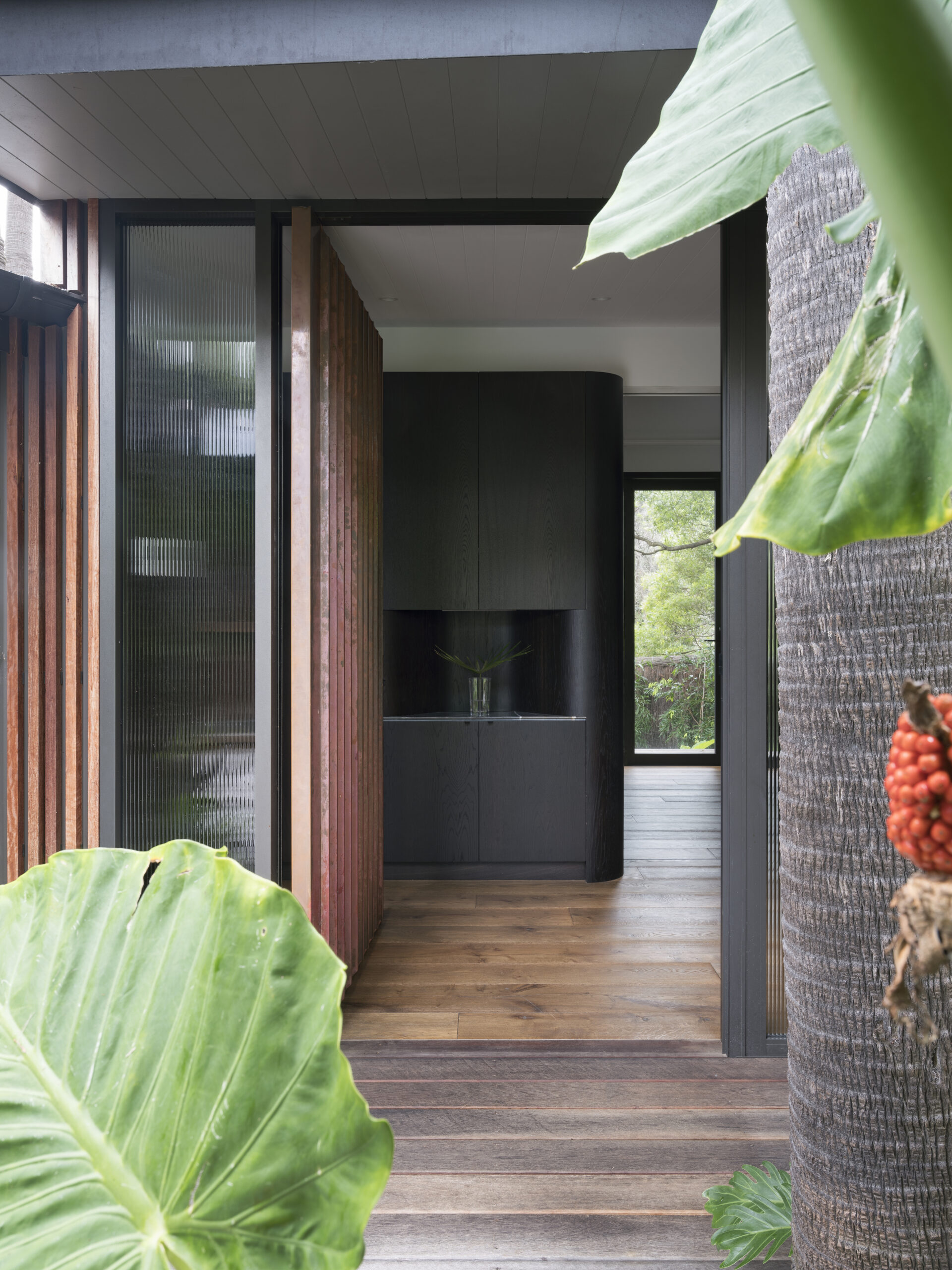 Vertical textures and dark timber are repeated in tribute to the vegetation.