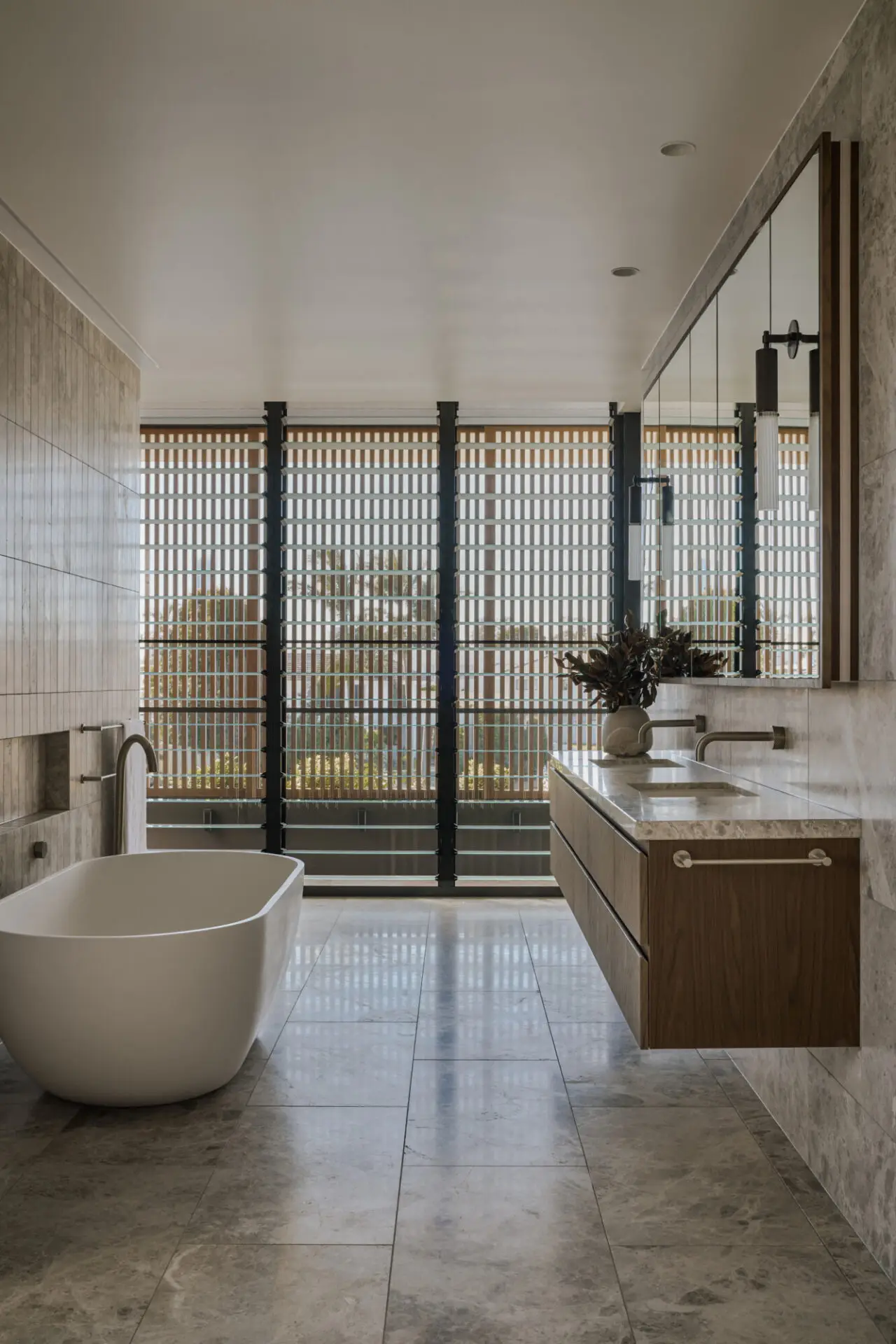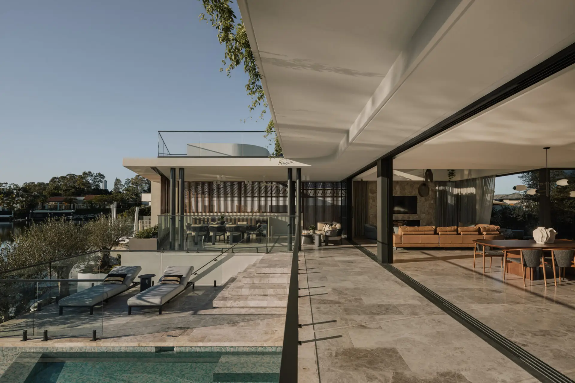 Deep overhangs and timber screens provide passive solar control and privacy while enabling natural ventilation and fluid indoor-outdoor connections. A central axis organises the plan, linking living areas to courtyards, terraces, and rooftop decks that offer expansive water views and promote cross-breezes.