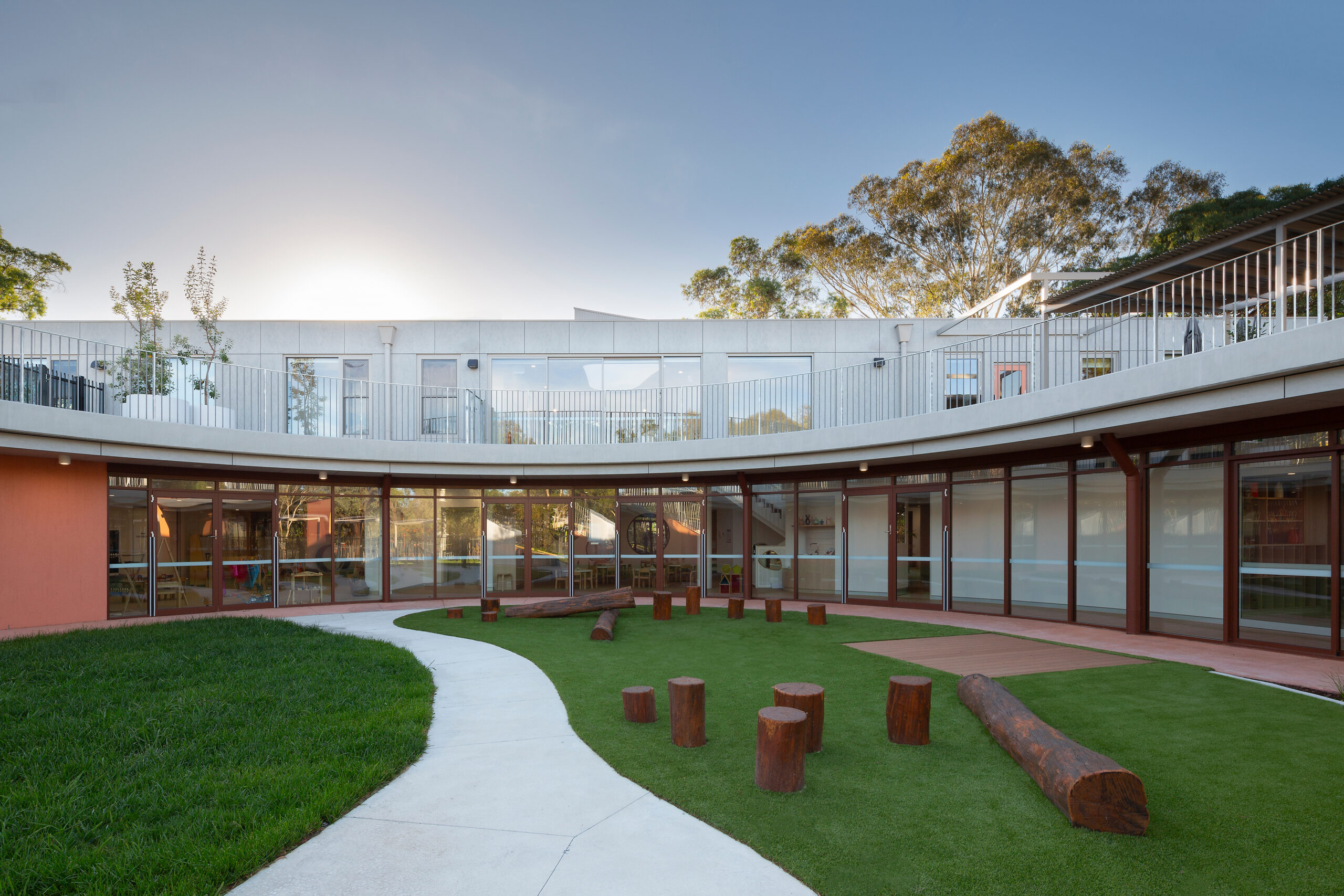 The St. Luke’s Early Learning Centre and Community Commons design utilises the constraints of a steeply sloped site to create a landscape folded across two levels, fostering connections for users both externally and internally. This ‘grounded’ form, arranged around the lower-level courtyard, houses the Early Learning play hubs in a circular layout. Children maintain continuous visual connections to other play spaces, establishing their sense of place within the community and nurturing their social development.