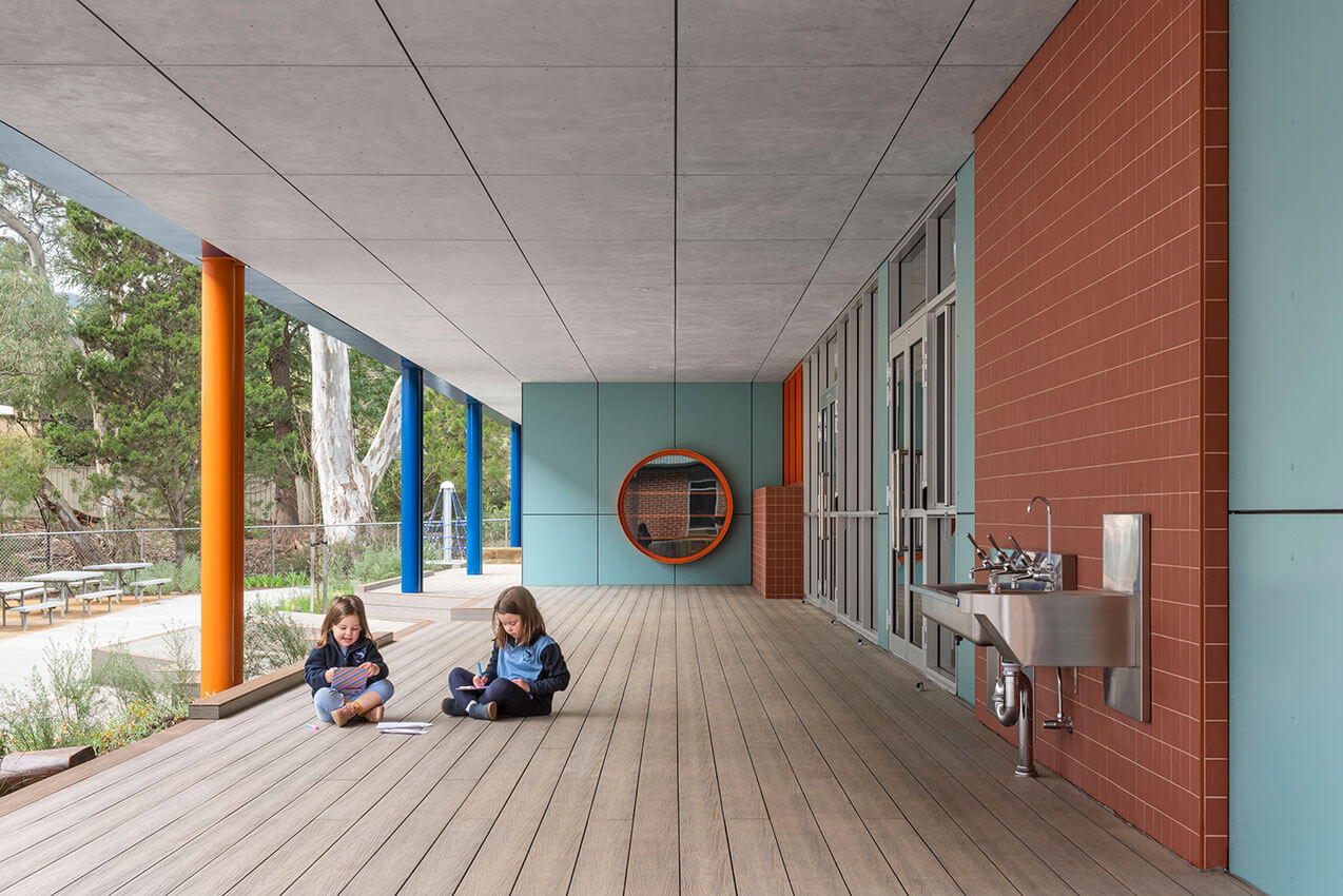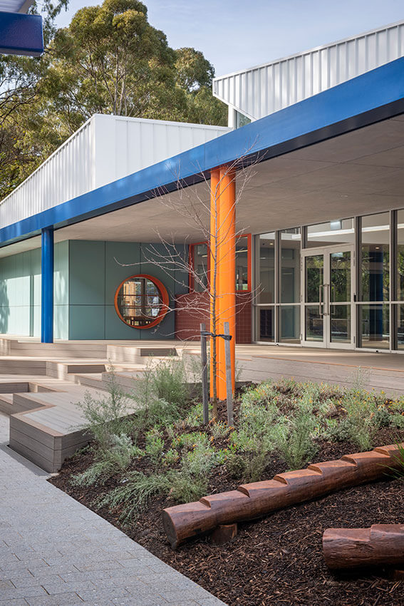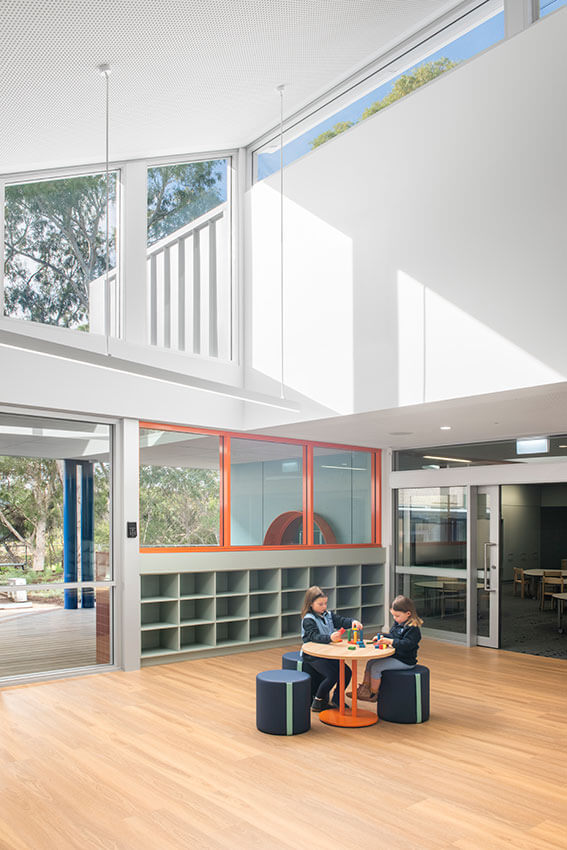 Nestled against the backdrop of the Fourth Creek walking trail and a mature Eucalyptus canopy, this development unfolds with a spacious veranda and integrated learning spaces. Clever reuse of an existing floor slab expanded the project scope to include the upgrade of neighbouring classrooms, which are connected through a bold yet contextual colour palette. A well-considered floor plan links learning spaces to a central communal area, featuring delightful architectural detailing and expression.