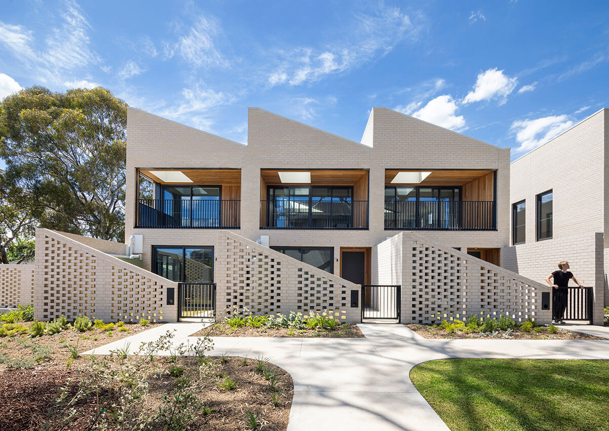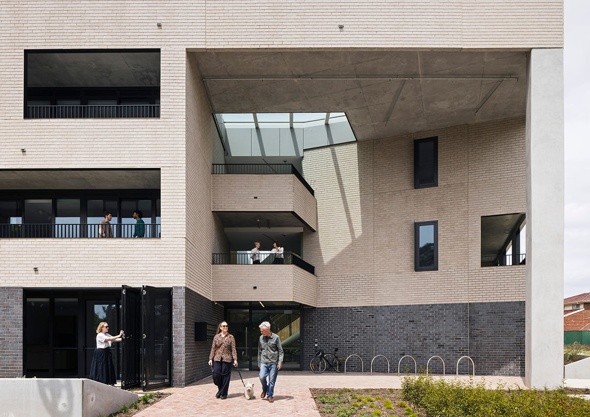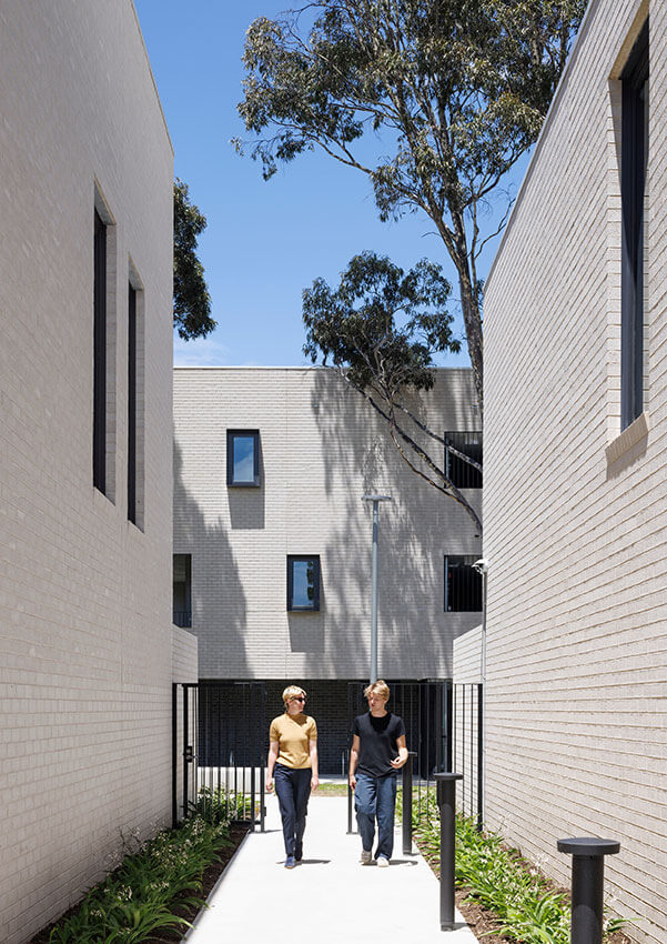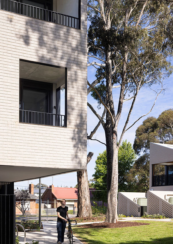 The three buildings respond to the scale of their suburban context ranging from 2 storey townhouses to 6 storey apartments. Entries are designed with a low number of keys per entry enabling small communities to flourish, providing a sense of address for all residents. The foyers and corridors are naturally ventilated by light filled openings and provide numerous spaces for gathering and pausing.