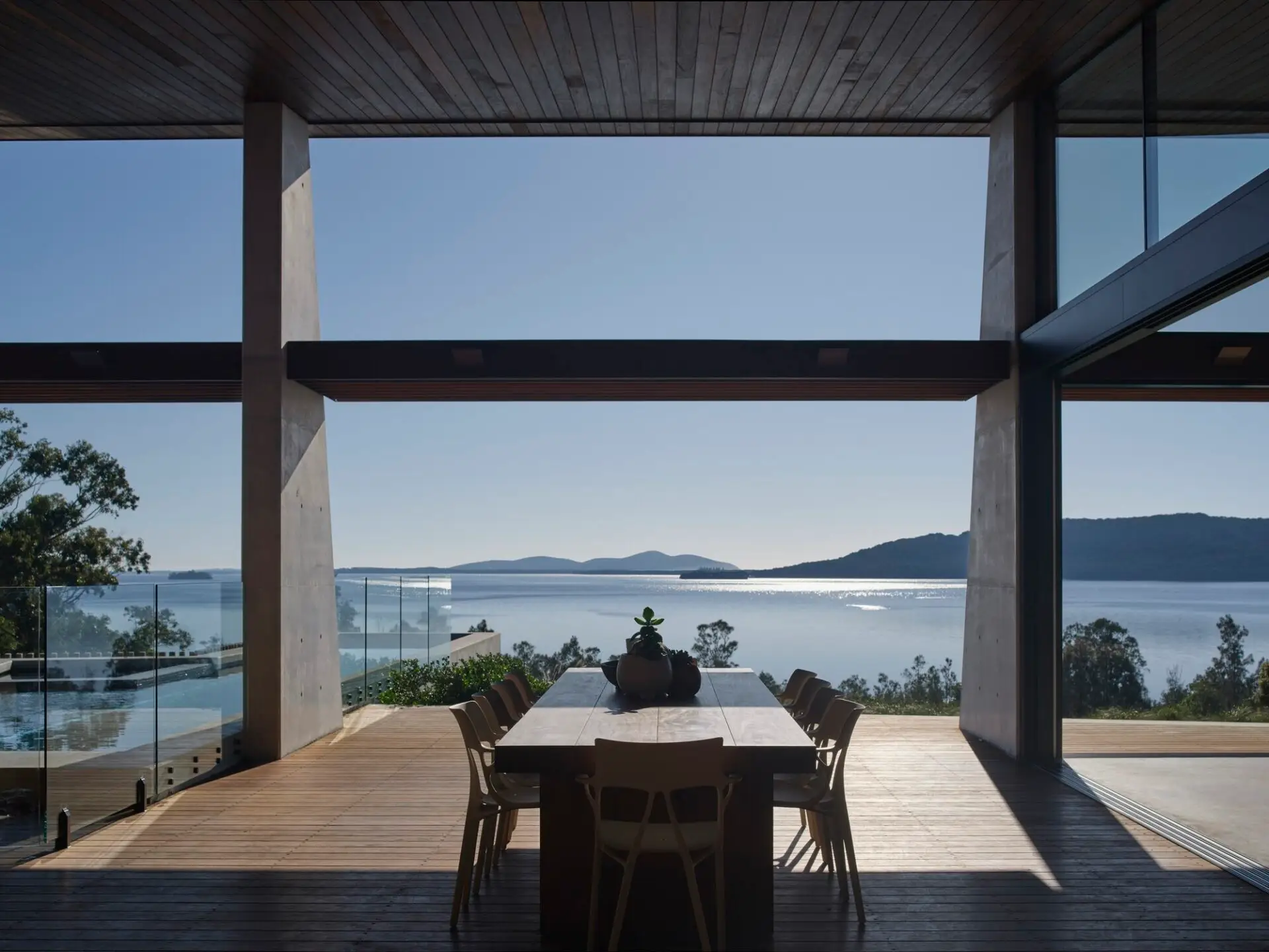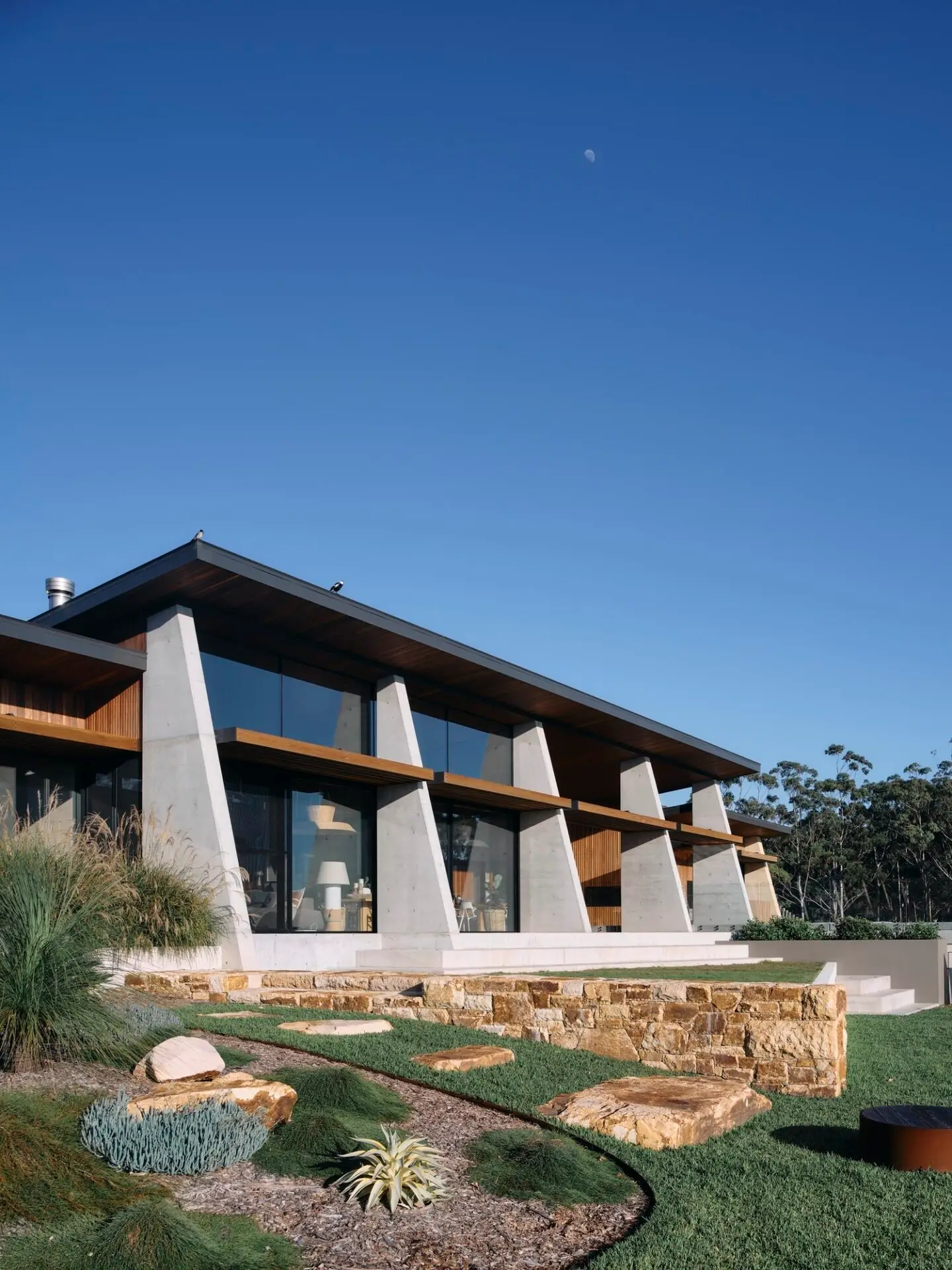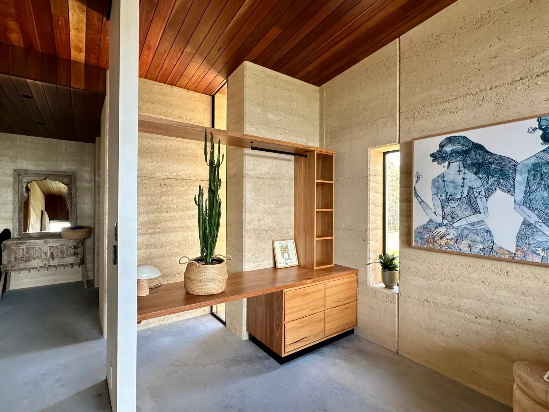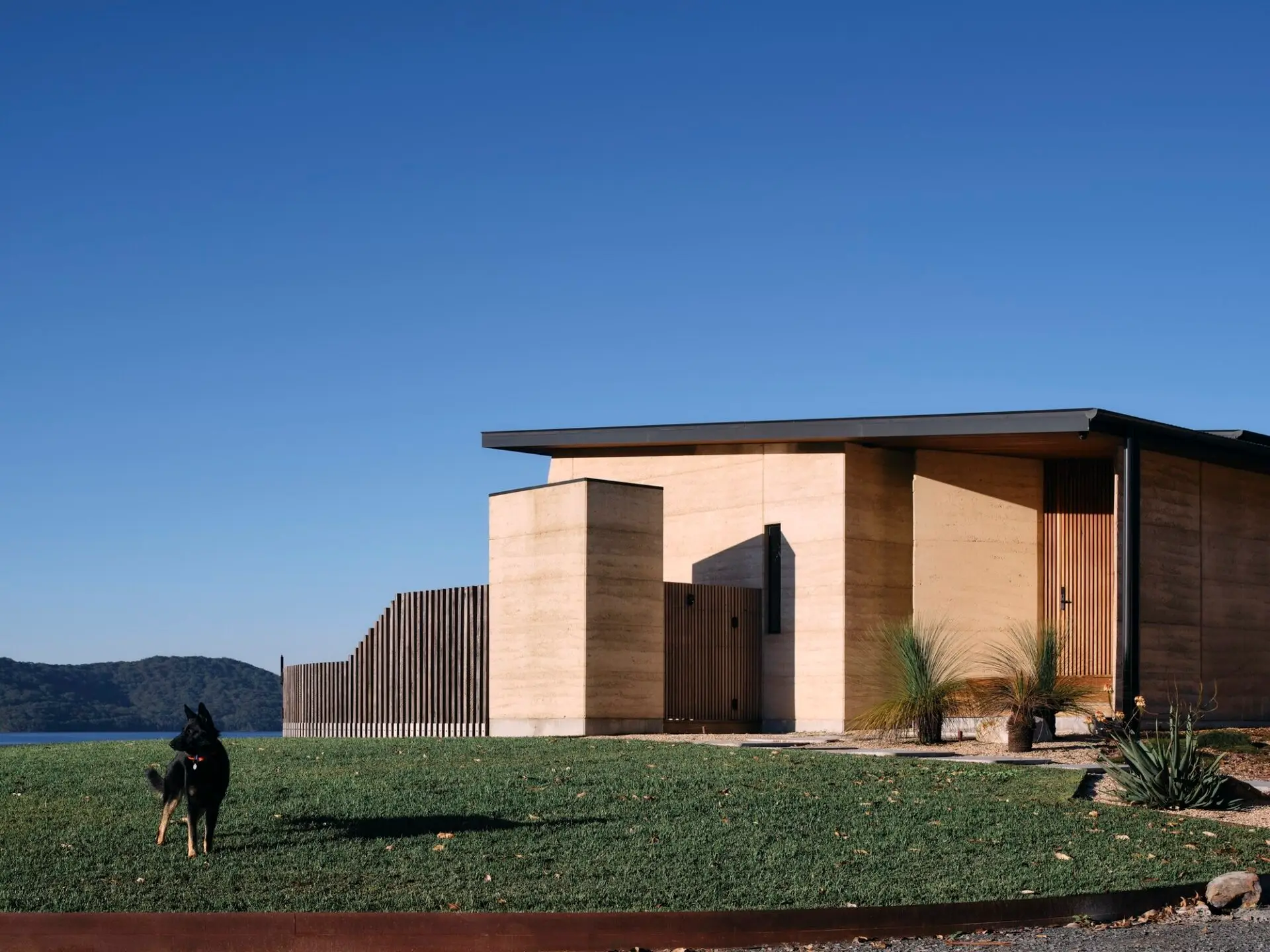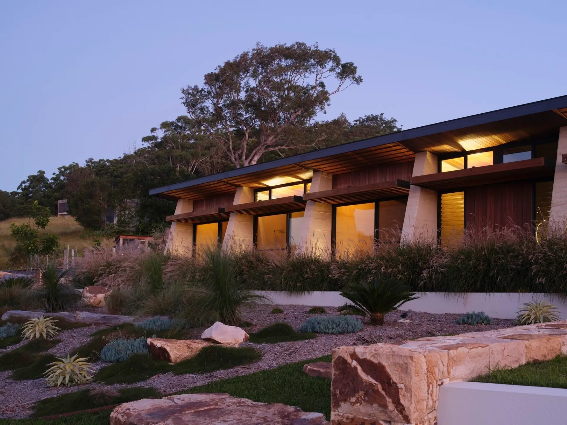 The extensive use of natural materials, typically rammed earth and hardwoods, help connect the occupants to the bush setting as well as providing a healthy environment. Large double glazed sliding doors allow for plenty of winter sun to heat up the thermal mass of the concrete floor and rammed earth, plenty of ventilation in summer and blur the lines between internal and external spaces.