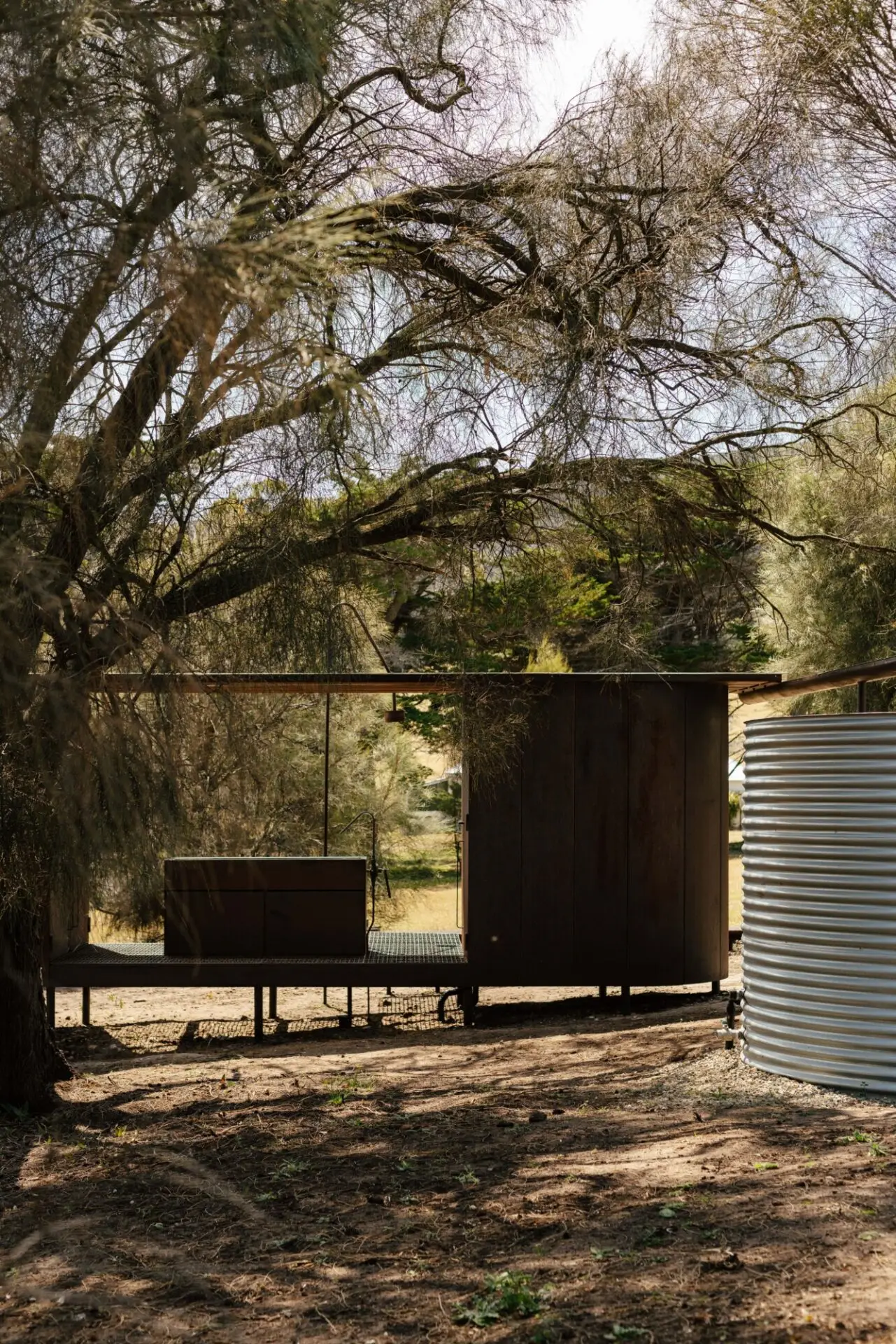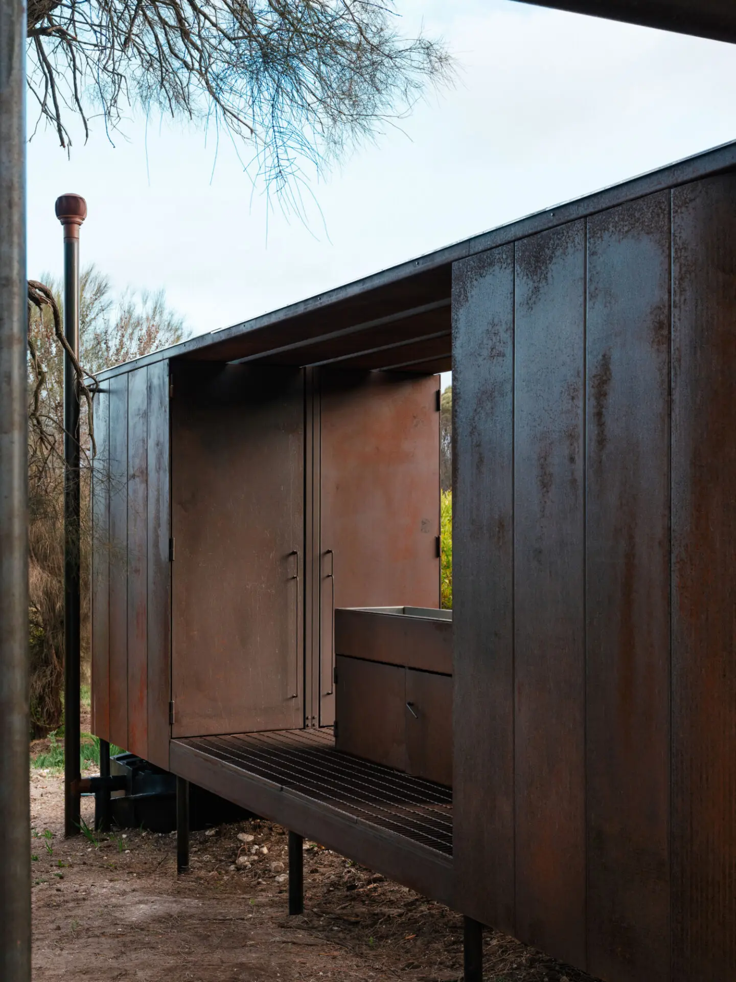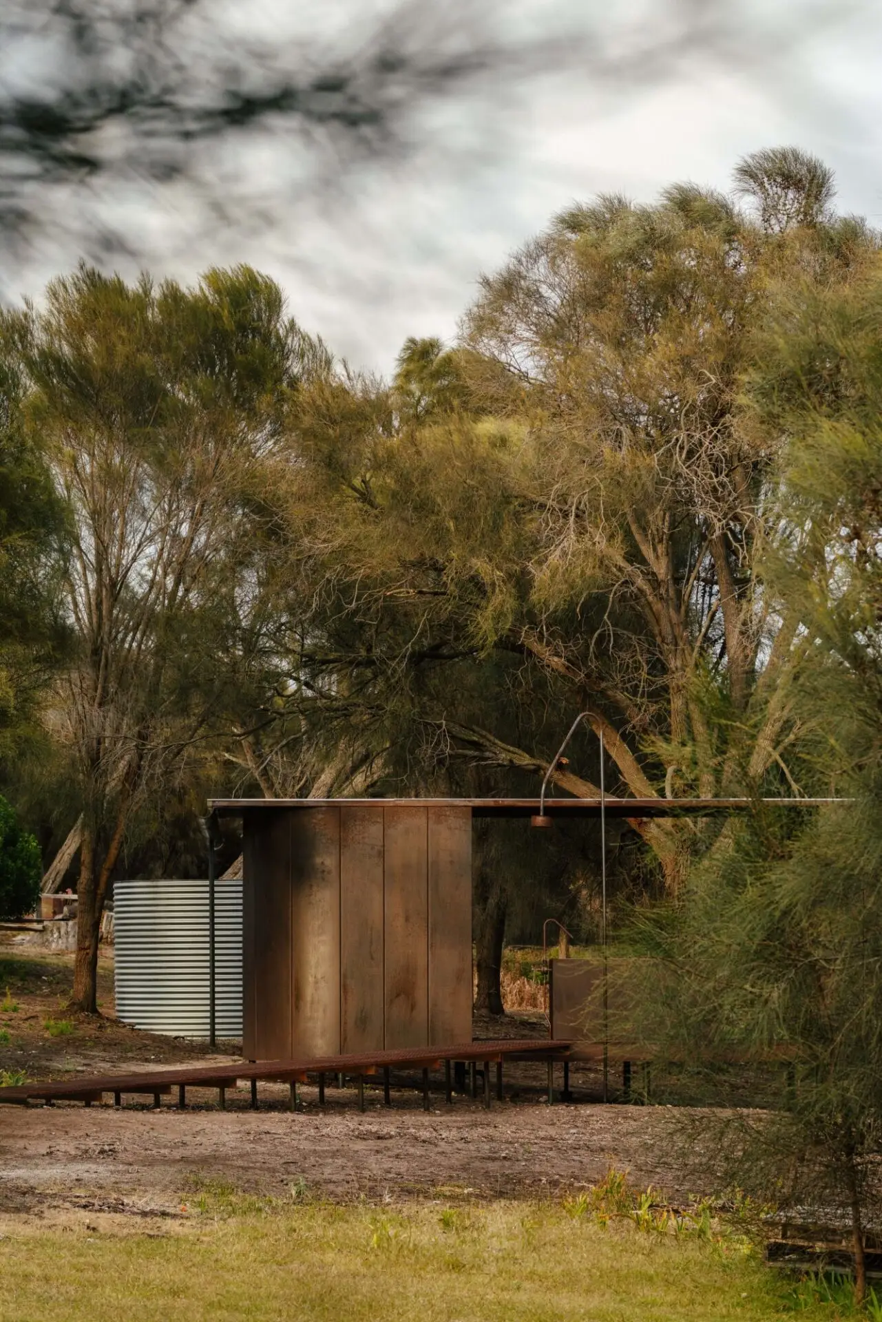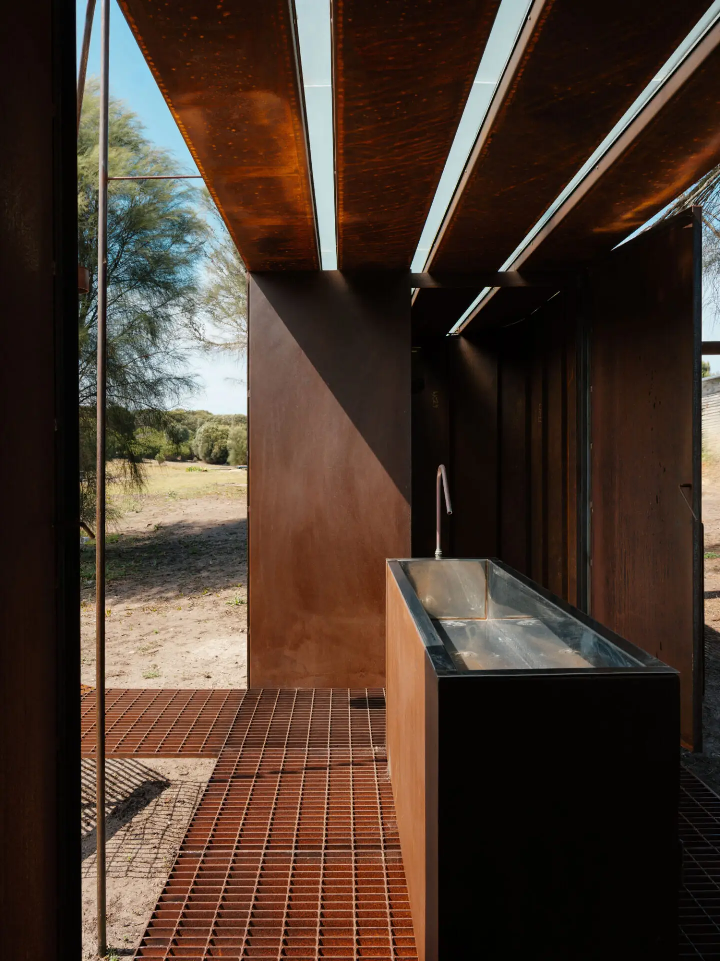Wybalenna is a profoundly sacred place for Tasmanian Aborigines, recognised internationally as a place of genocide. From 1833 to 1847, it operated as an open-air concentration camp, and after prolonged activism, was returned to Aboriginal ownership and care in 1999. Limited funding support has hindered proper care of the site for decades. Responding to these challenges, the Aboriginal Land Council of Tasmania launched ‘Truth Telling at Wybalenna’ in 2023, and prioritized the realisation of communal amenity for Aborigines at Wybalenna. This ablutions pavilion is the first new structure at the site in over a century. Prefabricated and constructed pro bono, the ablutions offers community amenity while also honouring the enduring spirit of the Palawa. While prosaic, it is also architecturally symbolic, and through its materiality and siting seeks to reflect the resilience and cultural meaning of the setting.