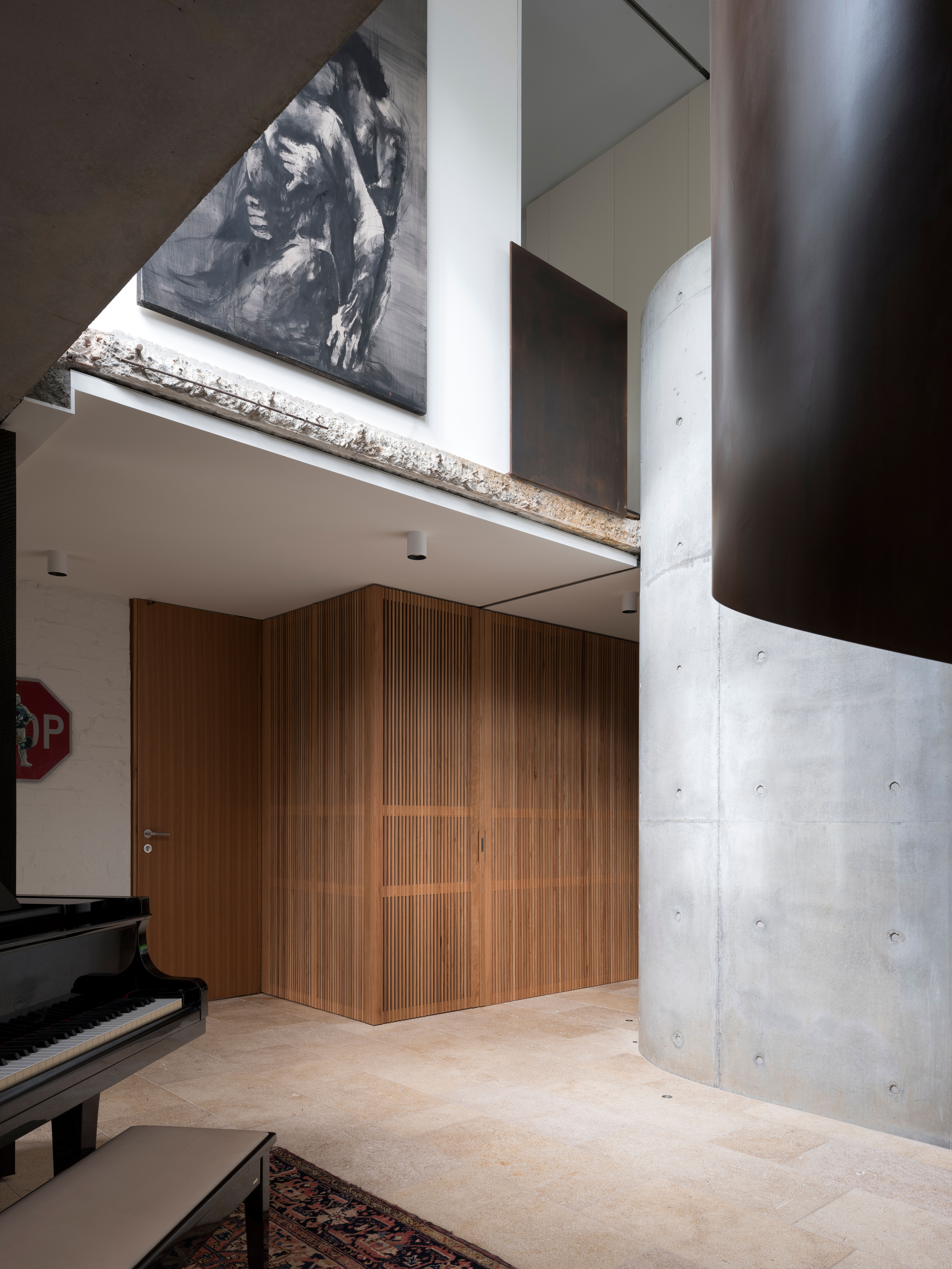 The plan is revealed by promenade linked by curated views to and from the gardens, and around the intervention of a serpentine of concrete wall which is cut through existing building and extending beyond.