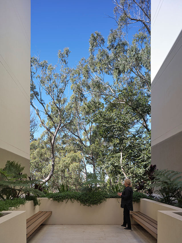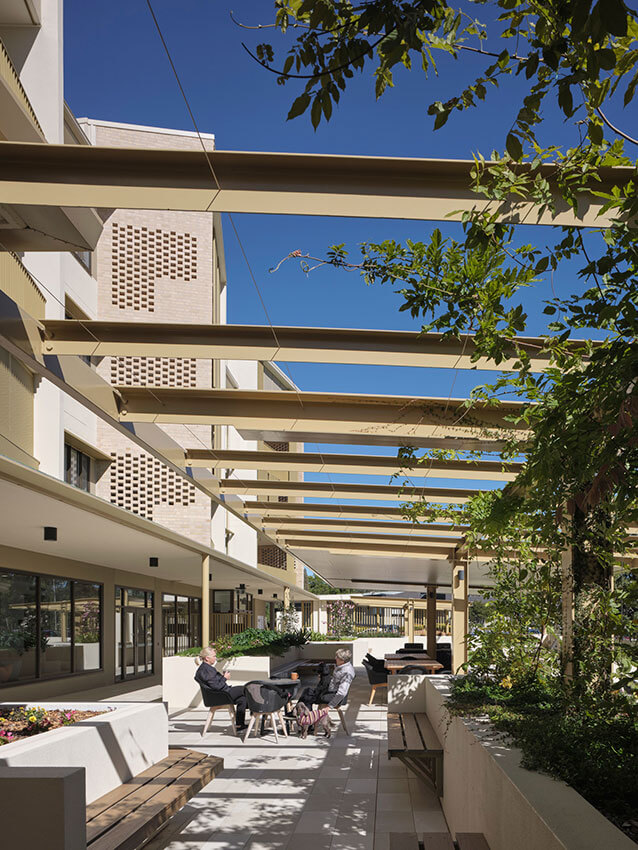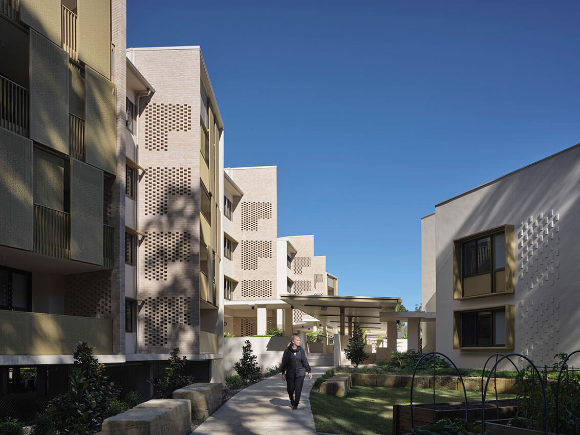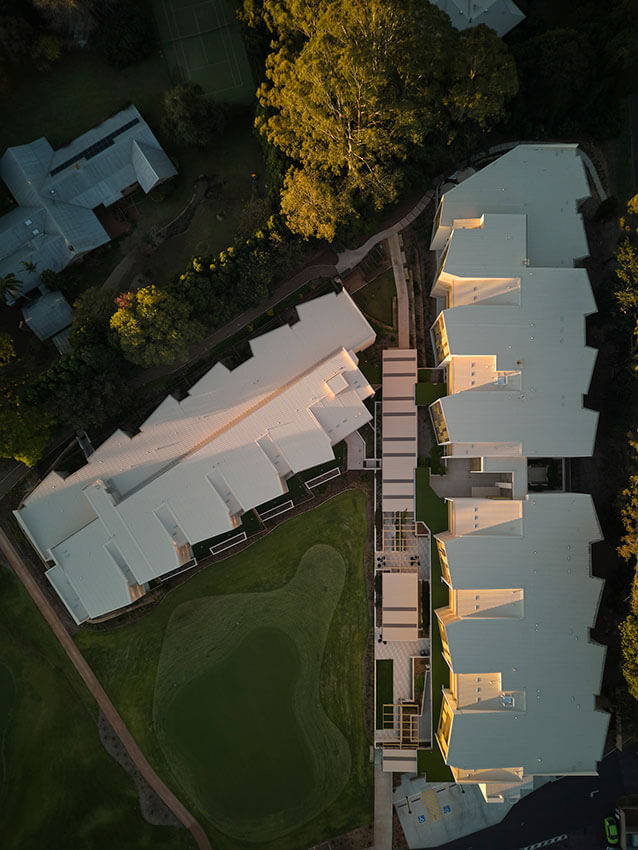 Pedestrian access is organised under sheltered links to promote social activity, community and connectedness between residents. The ‘village green’ looks out over the putting greens of the golf course and reciprocal relationship of views and backdrop are formed.