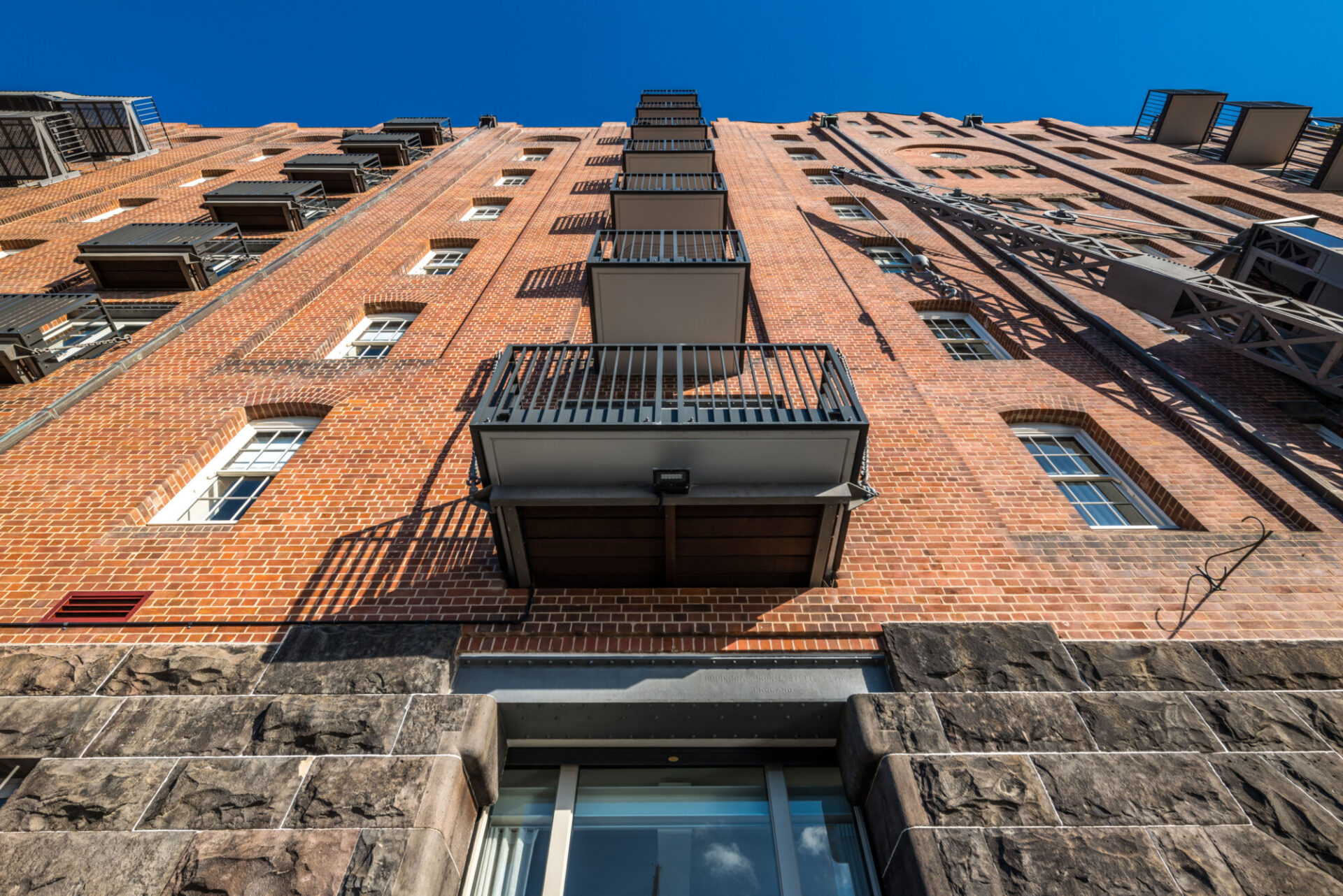 It’s been an enlightening and rewarding journey working on the transformation of The Revy, Pyrmont’s Grade One listed waterfront landmark by architect Walter Liberty Vernon. Built circa 1912, the eight storey Royal Edward Victualling Yard, Building C (The Revy), now comprises 44 residences, including one north-facing penthouse. Two storey townhouses sit within the rusticated basalt base, with generous double height spaces allowing full appreciation of the original volumes. The requirement to accommodate six apartments per core in this very narrow footprint, required an external core expression that would contrast with the existing brick building, but also not visually dominate. The two new external glass cores are placed on Darling Island Road, while the waterfront façade remains largely unaltered but for small, discrete and delicate insertions. New openings and new balconies, sympathetic to the original design assisted the adaptive re-use to apartment living.
