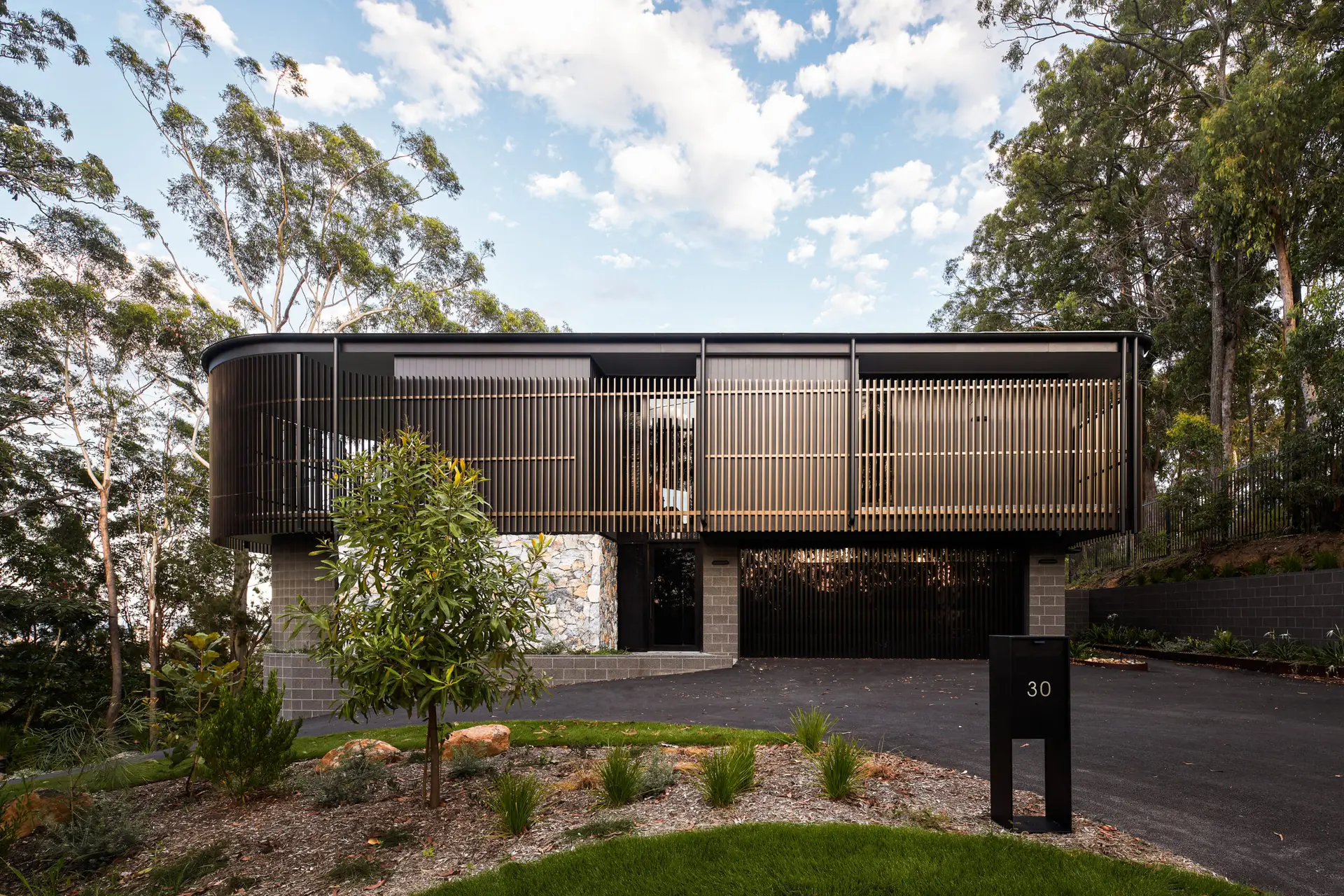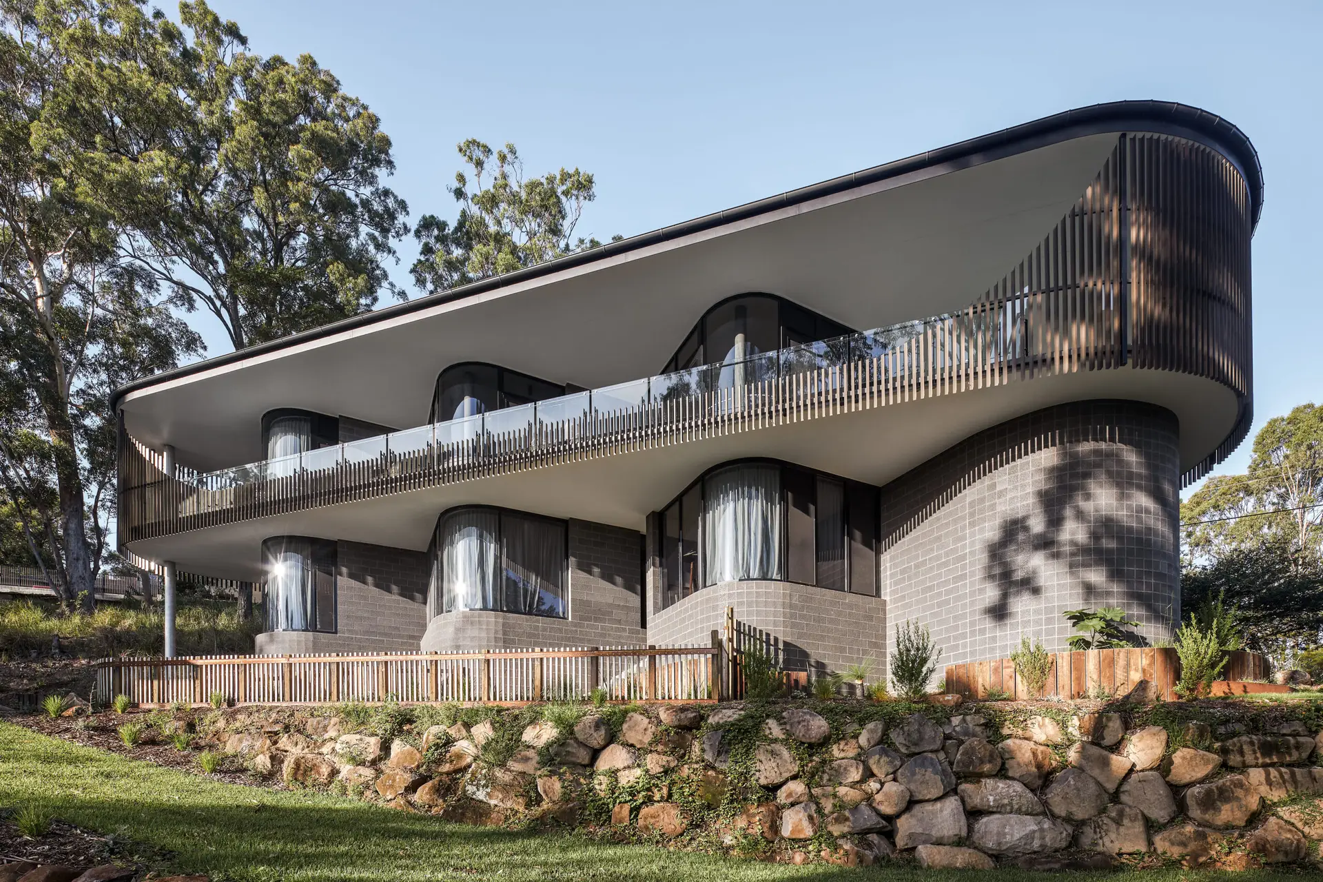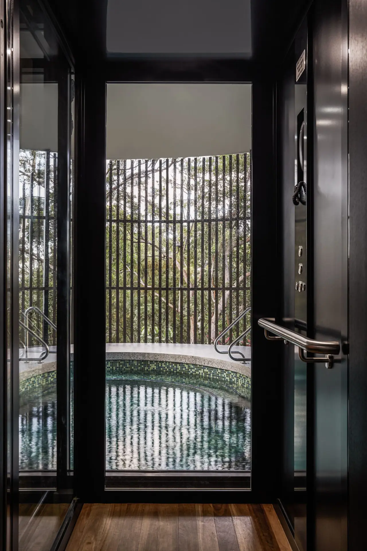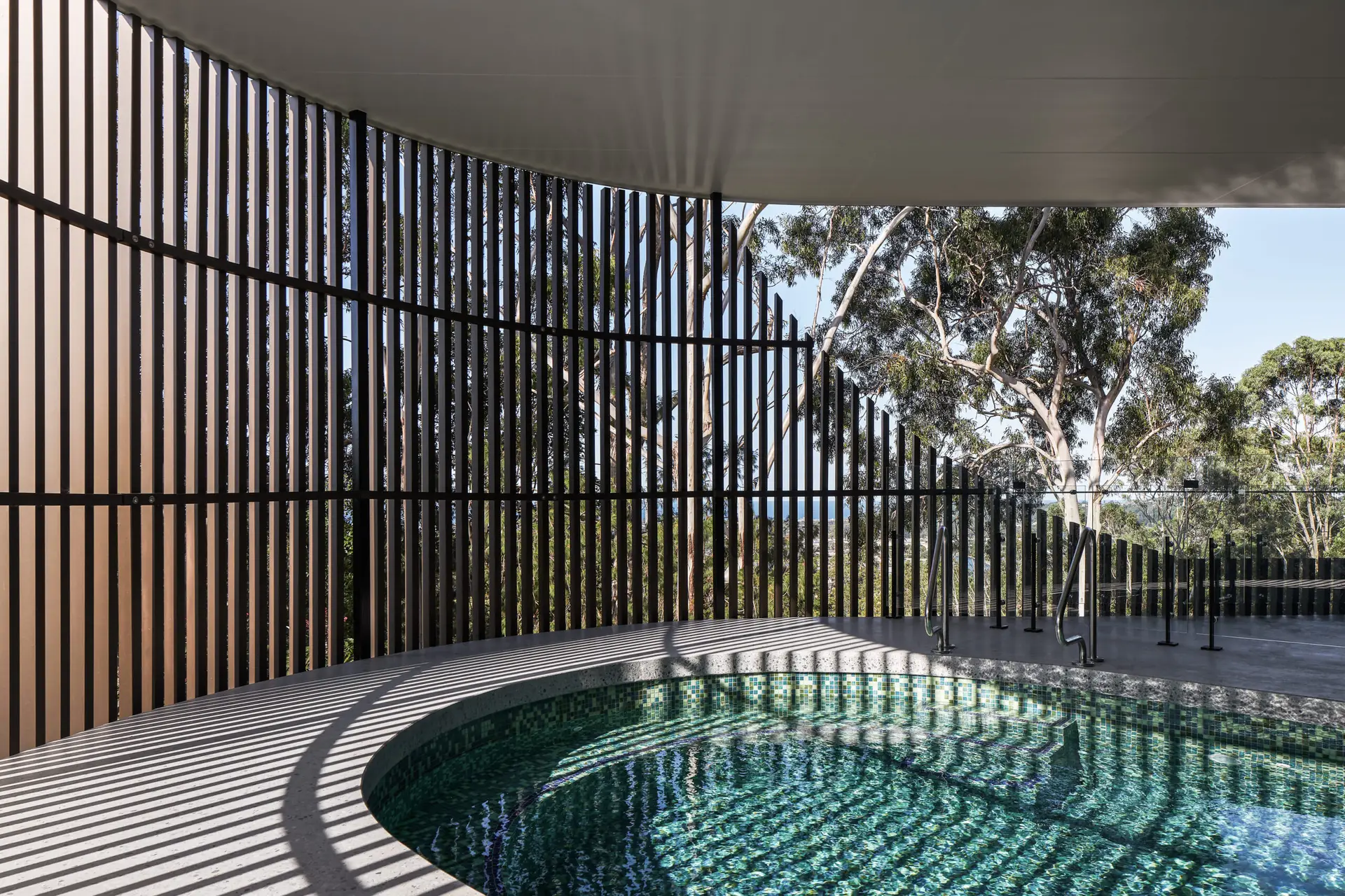 The building’s boomerang-shaped plan enables the services to face the road and be shaded from the western sun whilst the more public areas fan out into the treetops. The upper level includes the main living areas, an elevated therapeutic pool, and sweeping views of the coast below. The residents primarily live on the self-contained upper level and can utilise the lower level as necessary.