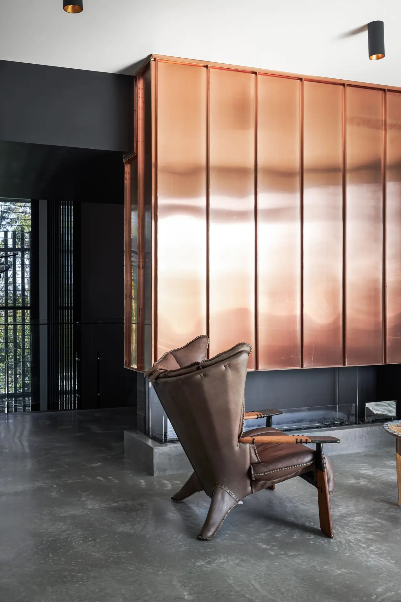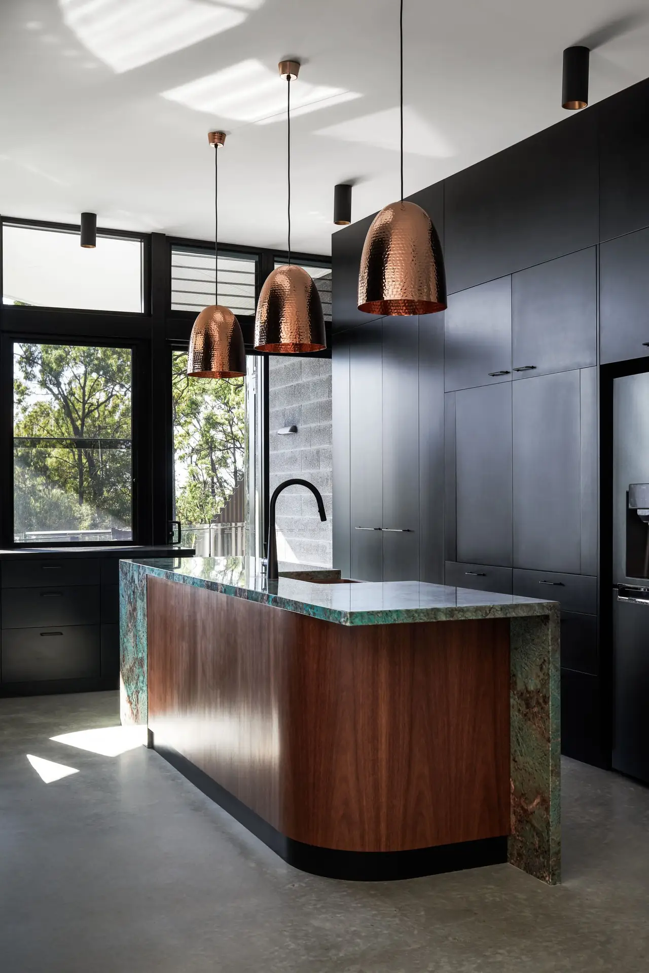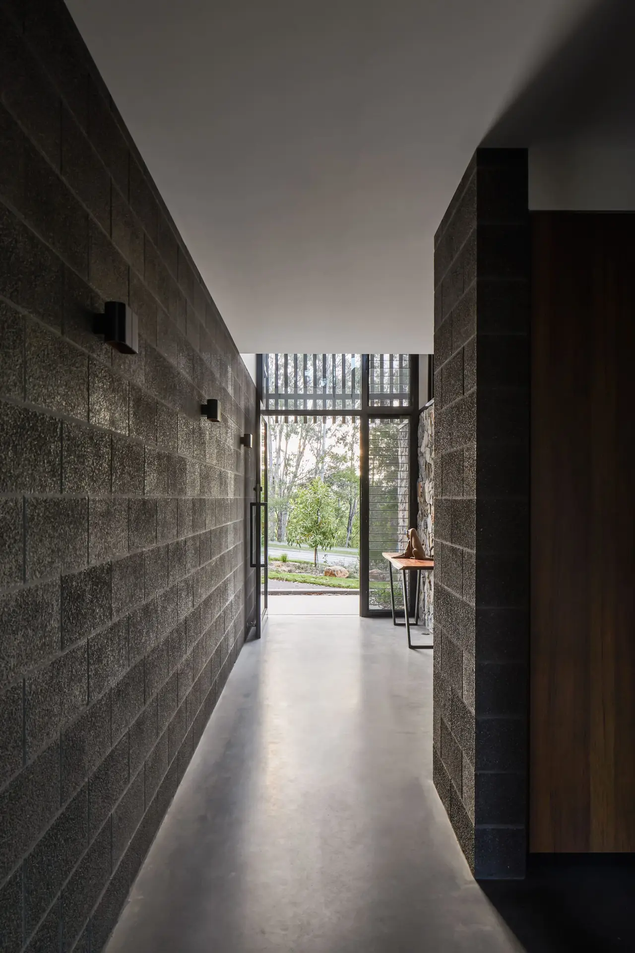 The high bushfire risk necessitated the use of robust, resistant materials. The concrete blockwork solidly grounds the building on the site, and the charcoal colour palette blends into the surrounding weathered gums.