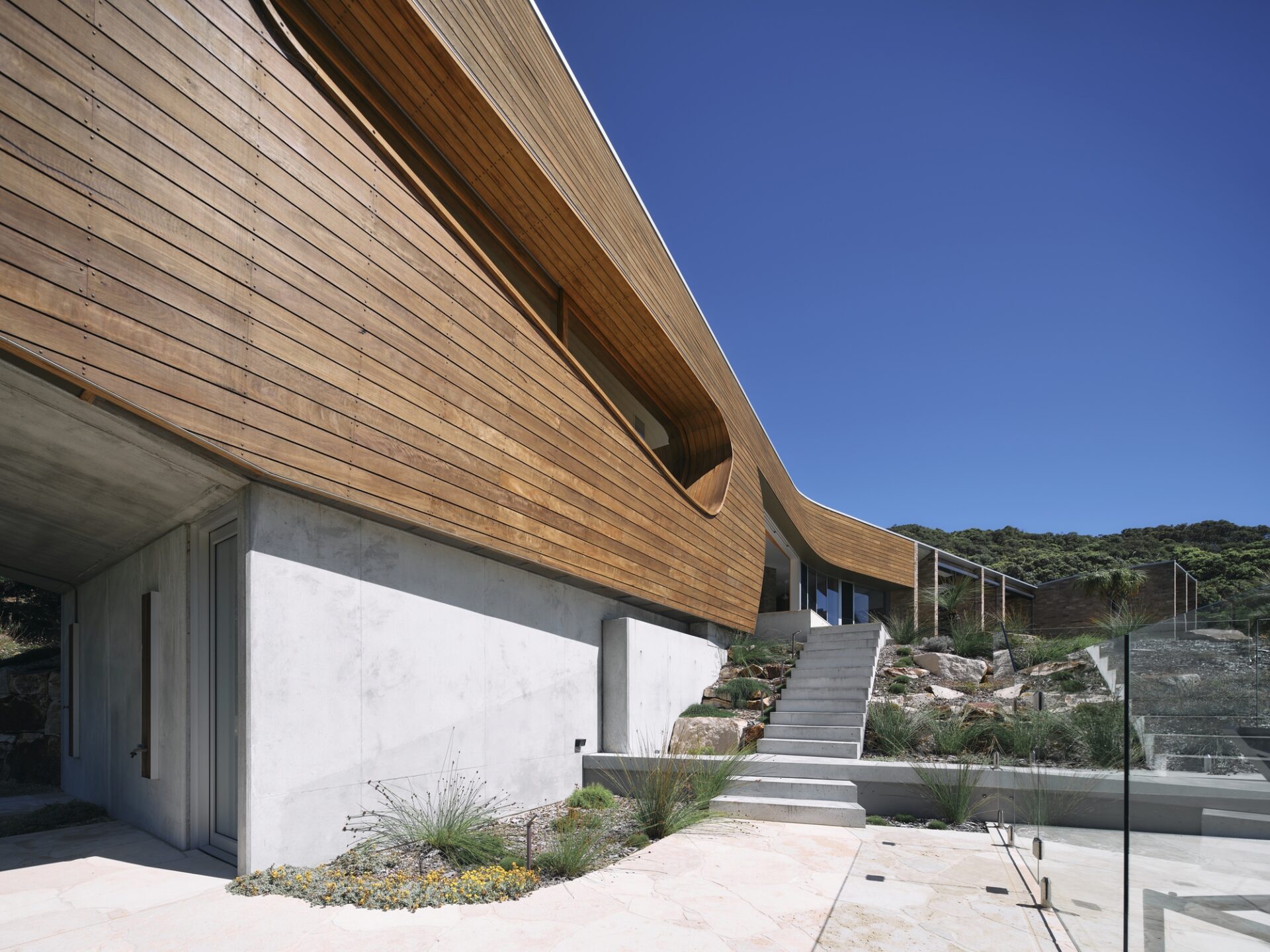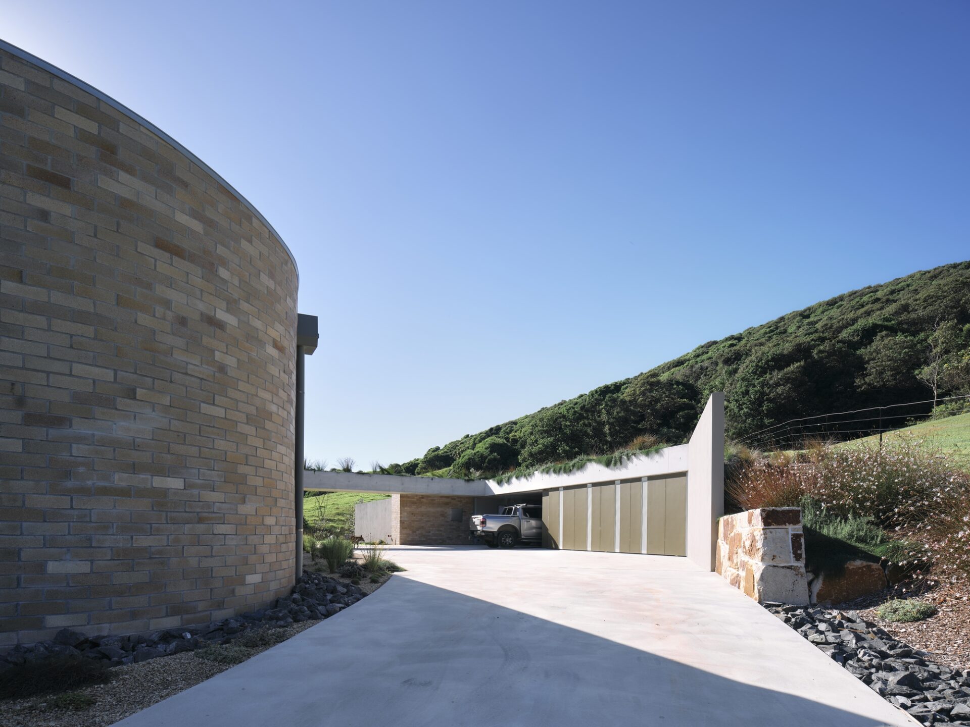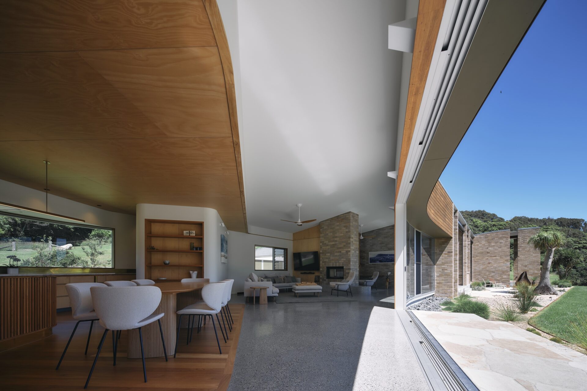 The design of a long narrow ship-like structure not only nestles perfectly into the hill behind but what has been achieved is an open and airy, bright home with lots of gentle curves that holds its warmth in winter and allows the breeze to keep it cool in summer.