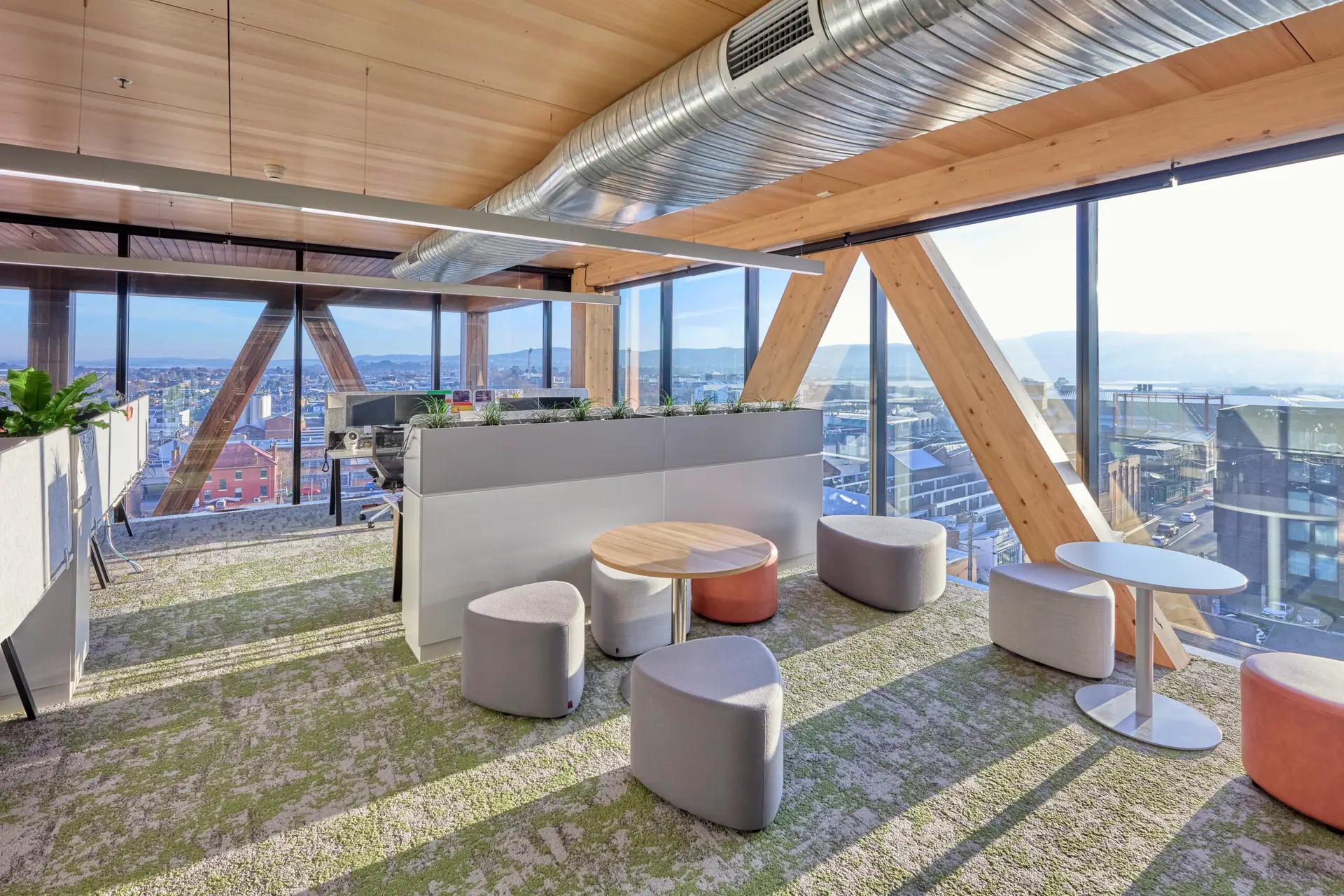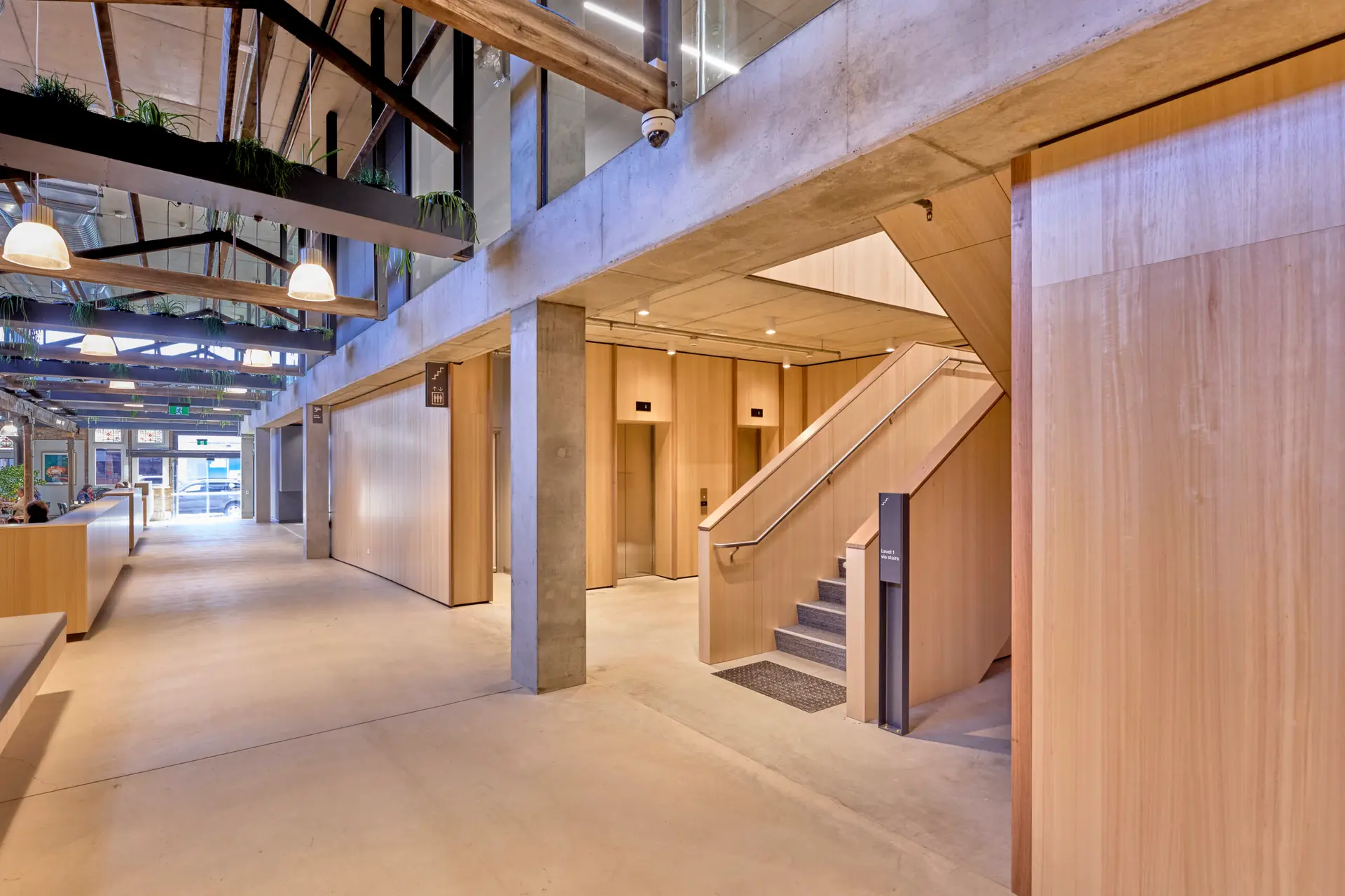 At the urban scale, the building is a simple form conducive to its unique mass timber construction system. A landscaped “outdoor room” to the upper levels connects to the broader landscape around Launceston.