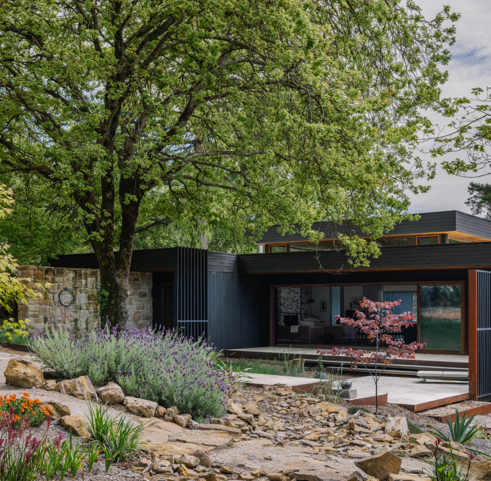 Retained mature trees and terraced gardens integrate the house into its natural setting and streetscape. Passive thermal design, rainwater capture, a 15 kW Solar system with dual-battery EV charging, recycled bricks and charred Australian hardwood cladding demonstrate environmental responsibility and biophilic design.