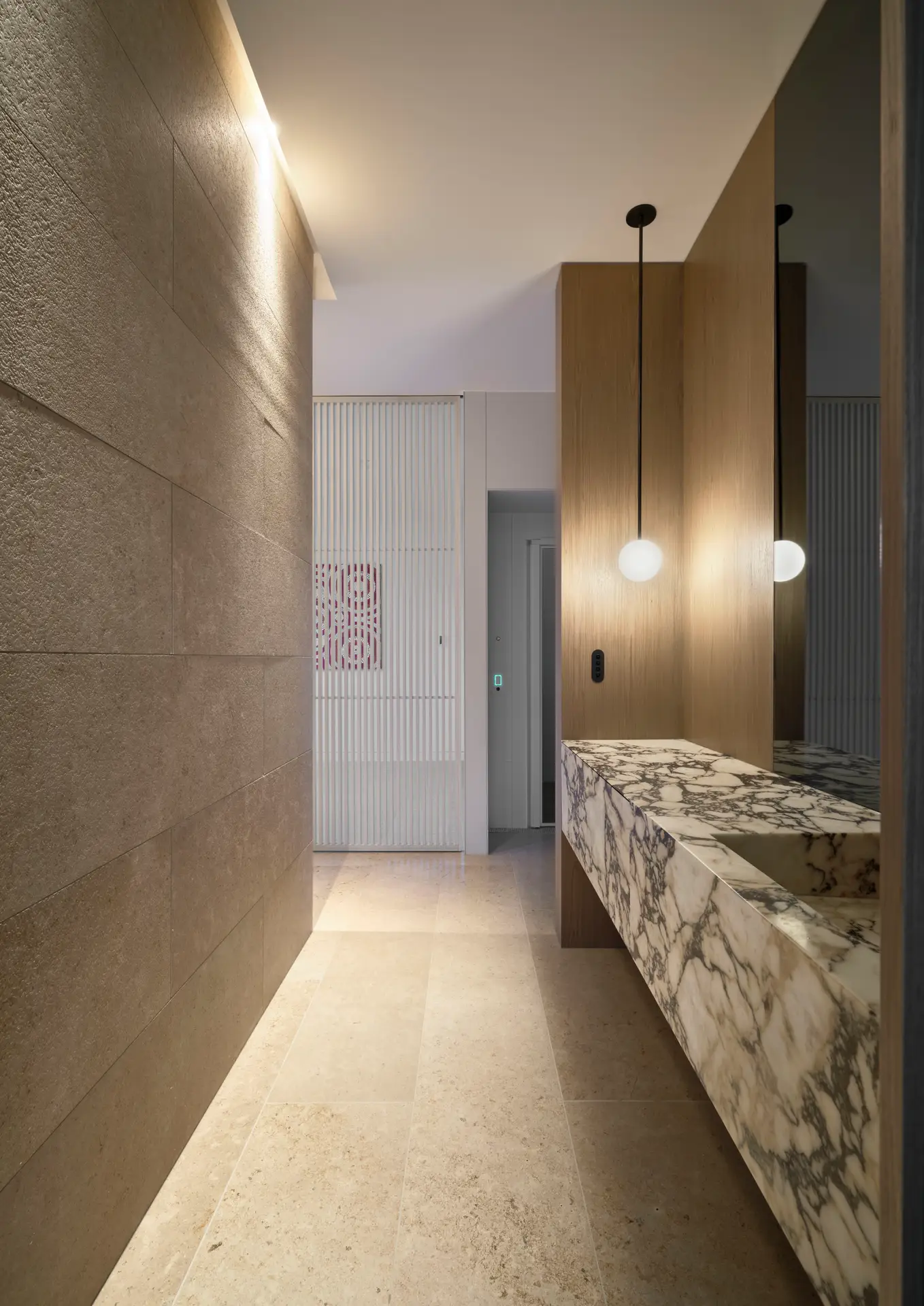 The residence’s layout prioritises functionality and connectivity, offering fluid transitions between indoor and outdoor spaces. A carefully curated material palette of limestone veneer, metal cladding, and natural timber ensures durability and timeless elegance. Landscape elements soften the built form, enhancing privacy while maintaining a strong connection to the surrounding environment.
