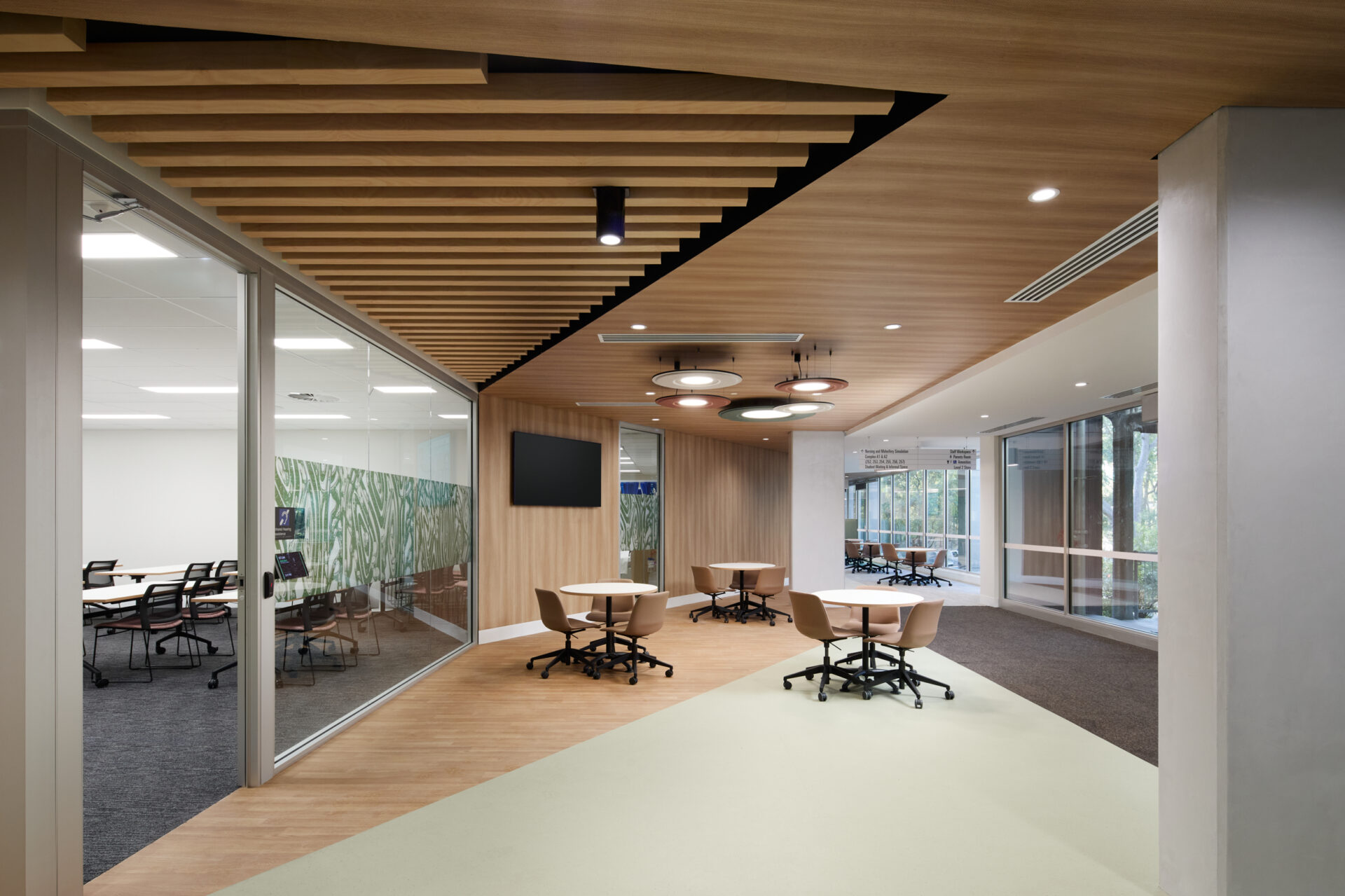 The project revitalised a whole level of an existing carpark under adaptive reuse principals to create the new School of Nursing and Midwifery (SoNM) Teaching Labs, Simulation Labs and Staff workspace. It consolidated and integrated the existing School of Health Sciences (SHS) on the level above the carpark with SoNM and the College Office. For the first time, it brought multiple Schools together in the one building with a view to creating a fully integrated building to foster interdisciplinary collaboration between staff and between students across disciplines with the aim to enhance the student learning experience and journey.