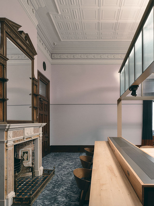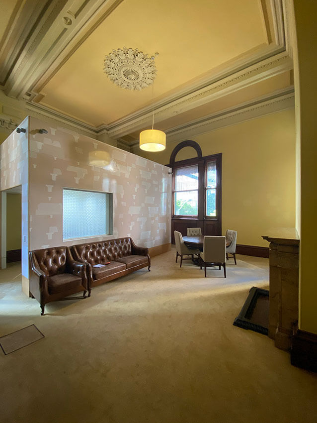 The Burra Charter process was adhered to in the team’s strong understanding of the building’s significance from inception to implementation and monitoring during construction. The team worked closely with the Department of Environment and Science to develop adaptation strategies, including fixing methodologies, acoustic treatments, and painting schemes. Shadow gaps were introduced to denote the boundary between old and new. Contemporary colours were selected to make reference to the heritage fabric, whilst acknowledging the original colour values and contrast of each heritage element. In The Atrium, a pool of colour floods the floor to a datum, a re-imagining of light that once fell through the original crimson and violet stained-glass dome. In the chambers, colour is informed by original, bespoke marble fireplaces, paired with an endemic flora species of the site. These subtle details allow visitors to understand the site’s history and careful thought that went into its restoration and adaptation.