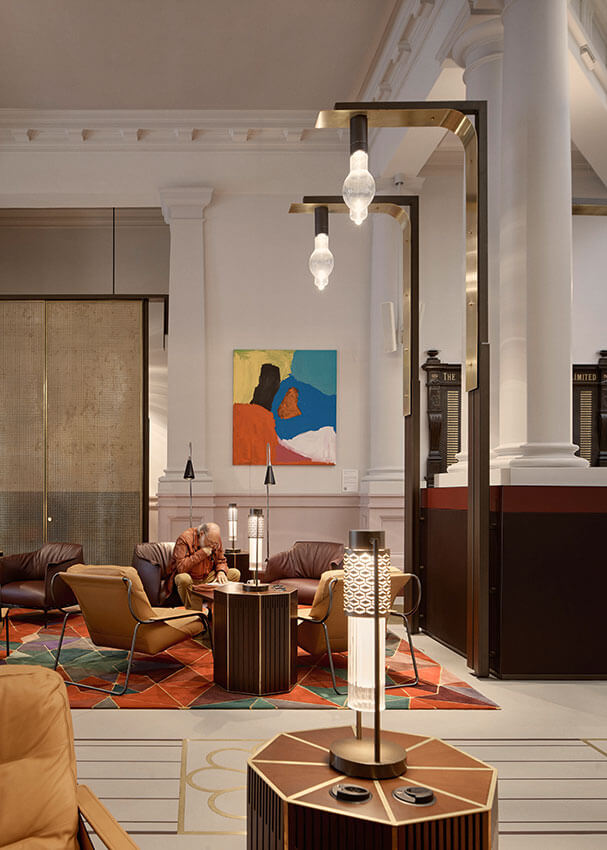 An associative approach to material selection established a conversation between old and new. New bronze and brass metalwork insertions reference the highly significant and identifiable dome. Bronze elements are structural and functional, while more decorative and ornate elements are brass, just as in the dome. Floor inlays, bespoke furniture pieces and rug patterning are informed by the dome’s geometry and Maltese Cross motifs.