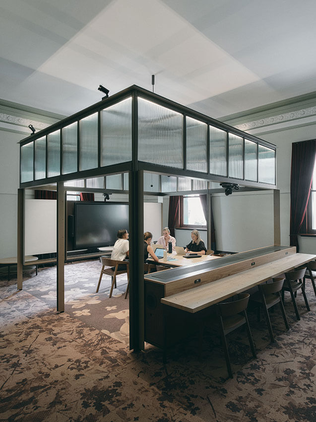 A deeply respectful approach of minimal interference with the heritage fabric was pursued. Acknowledging the need for modern amenity and technology, an underfloor services network, along with on-floor installations delivering lighting, power, data, conditioned air, writable surface, AV, were developed to minimise intervention with the walls and ceilings. Heritage chimneys were also utilised to bring in fresh air.