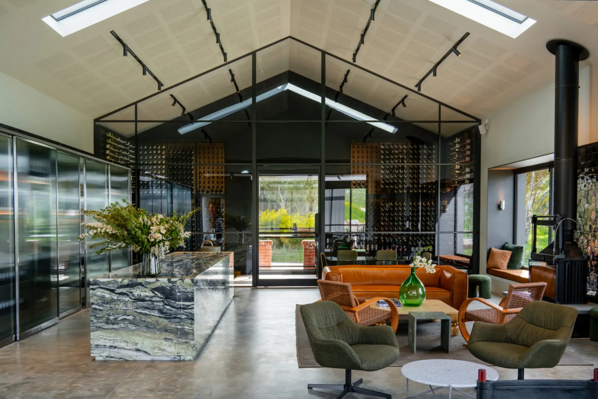 A wine business that owns its land, grows the grapes, produces the wine, and sells directly to the customer is a perfect example of full vertical integration. This “grape-to-glass” model isn’t just a production method; it’s a powerful business strategy centred on control, profitability, and brand equity. The design’s quality is evident in its materials, which tell a story of survival and renewal. Original red bricks that withstood the blaze remain visible. Charred timber beams salvaged from the fire stand as totem-like markers at the entry, honouring the past. This isn’t just design; it’s a testament to resilience.