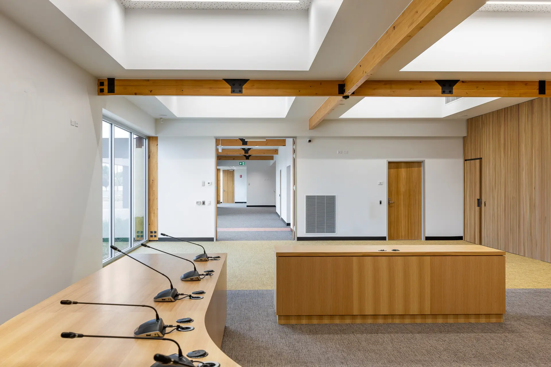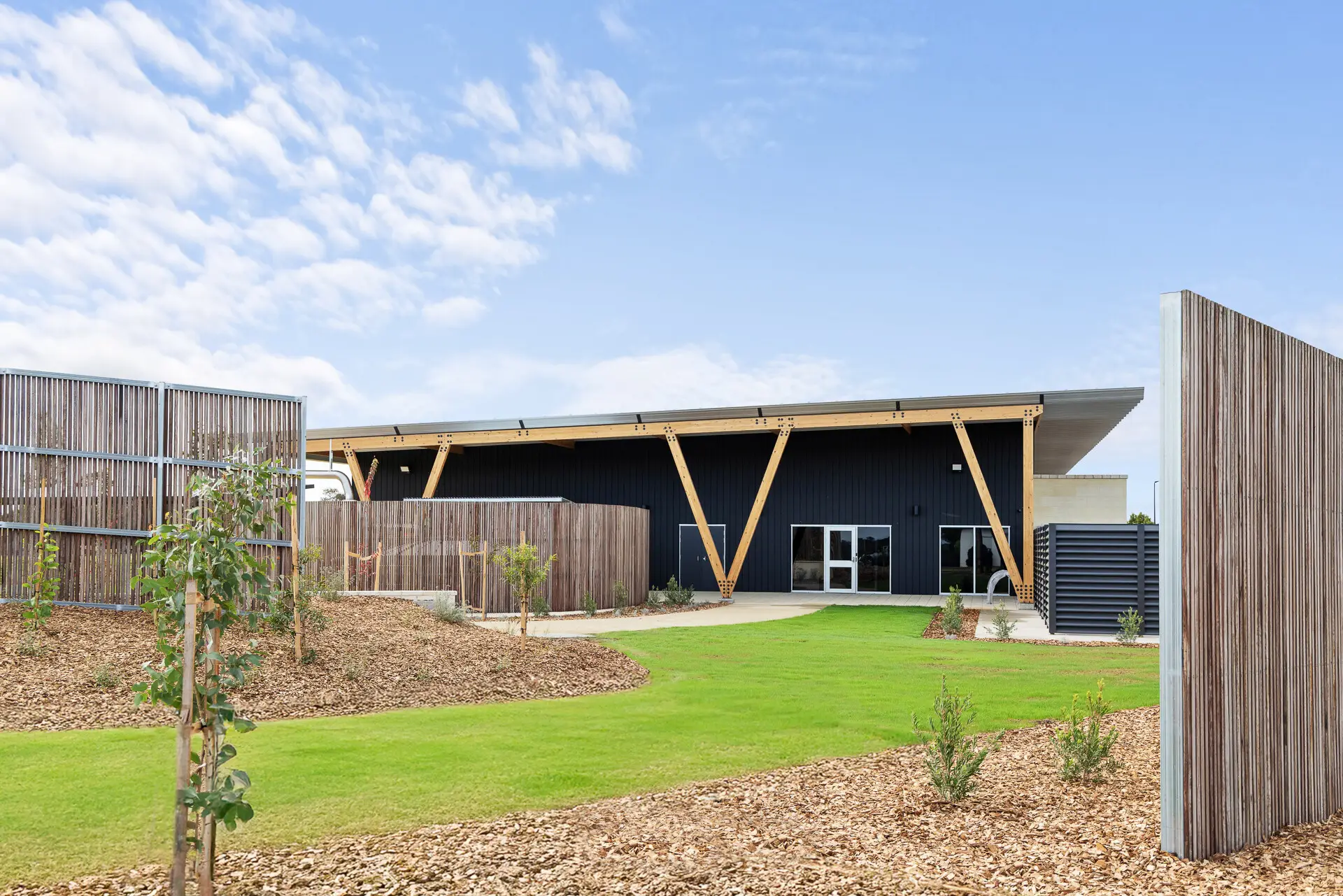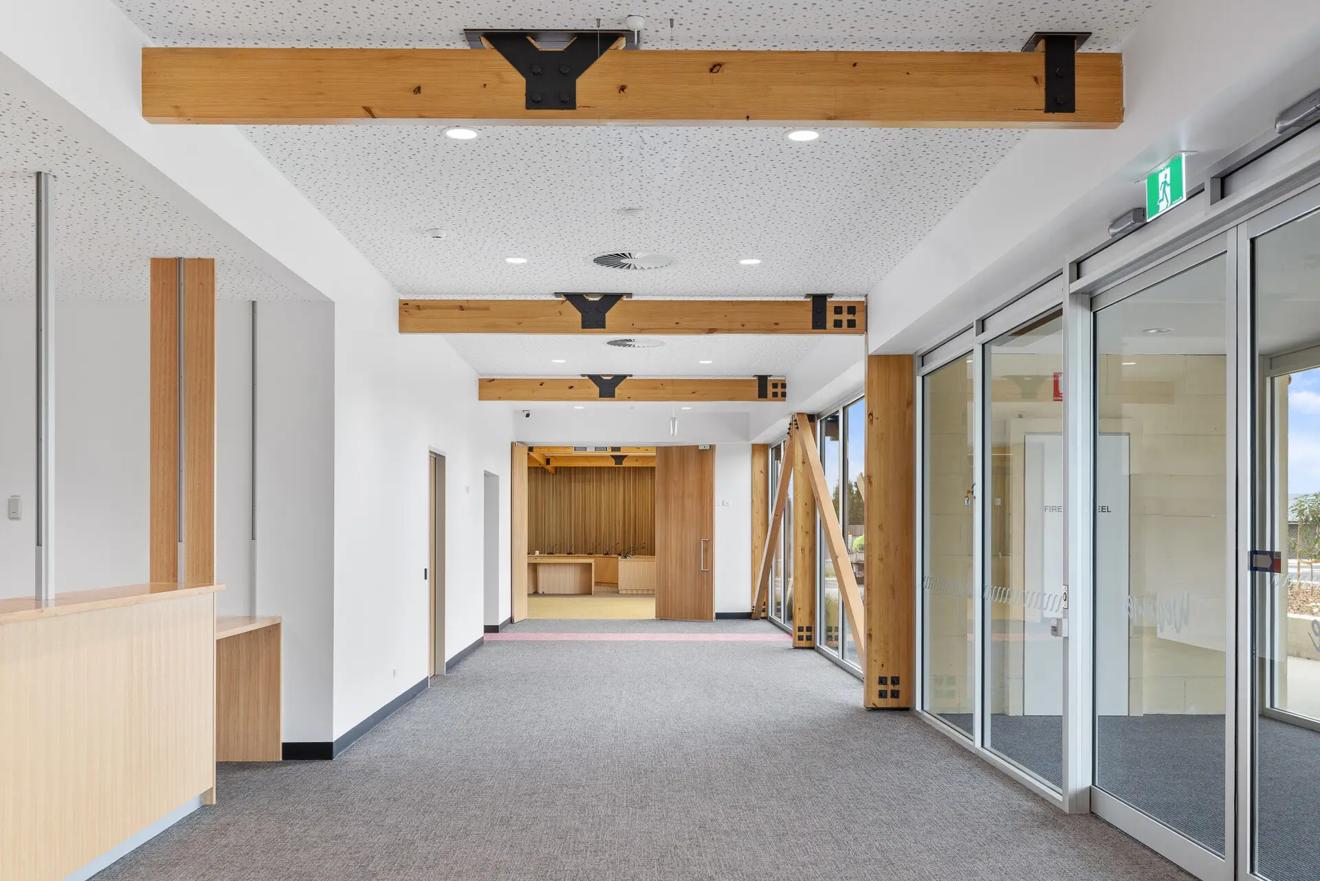 Local limestone, native plants, and Australian hardwood fencing landscape the building and adjacent watercourse. Rainwater is harvested, treated, and stored for use throughout the building. Double glazed windows with immersive landscape views provide natural light and a well vented roof space improves the thermal performance of the internal conditioned spaces by reducing energy demand. Internally, exposed structural elements made from local timber, Australian oak panel doors and joinery bring a tactile and psychological sense of well-being.