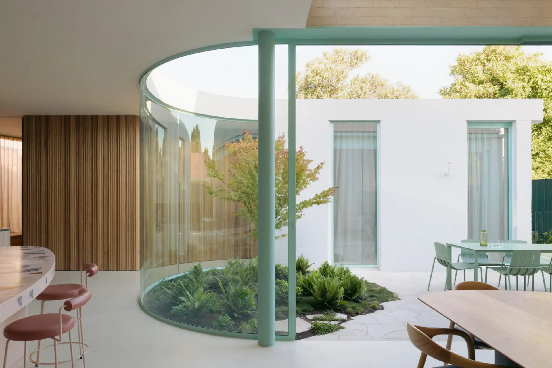 Yeo-Yo is a carefully considered alteration and addition to a modest 1925 bungalow, shaped by geometry and light. Retaining and repairing the original north-facing house to anchor the streetscape, the new work unfolds behind as a series of curved forms organised around a circular internal garden. This garden replaces the conventional backyard, drawing light and landscape deep into the plan and establishing a continuous spatial loop.