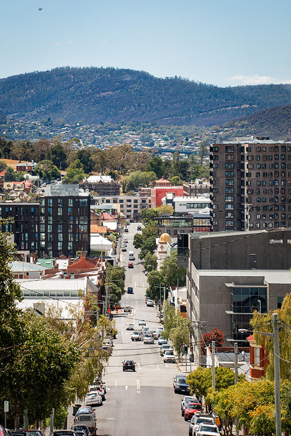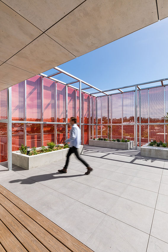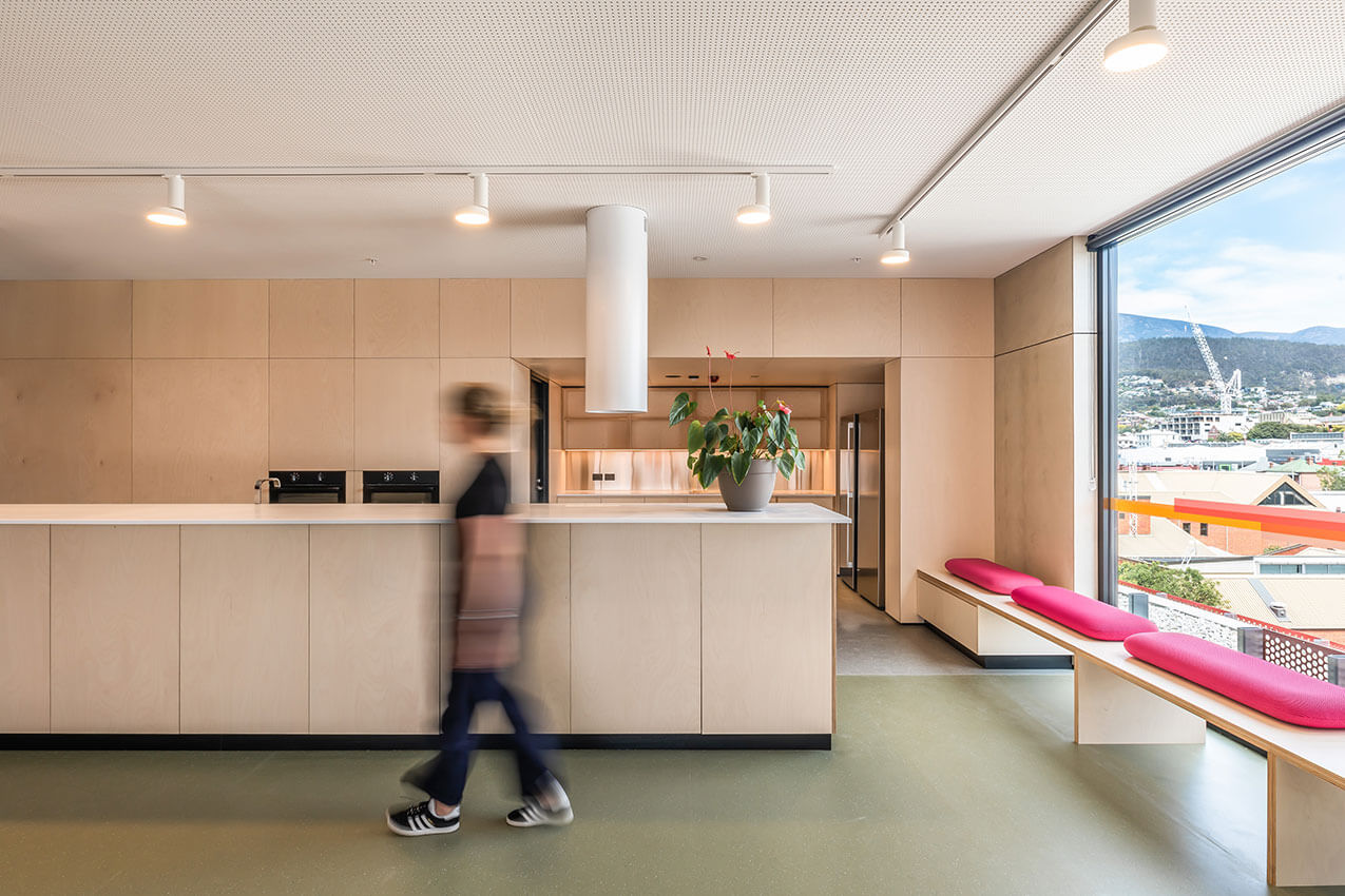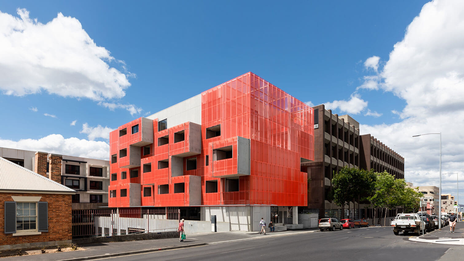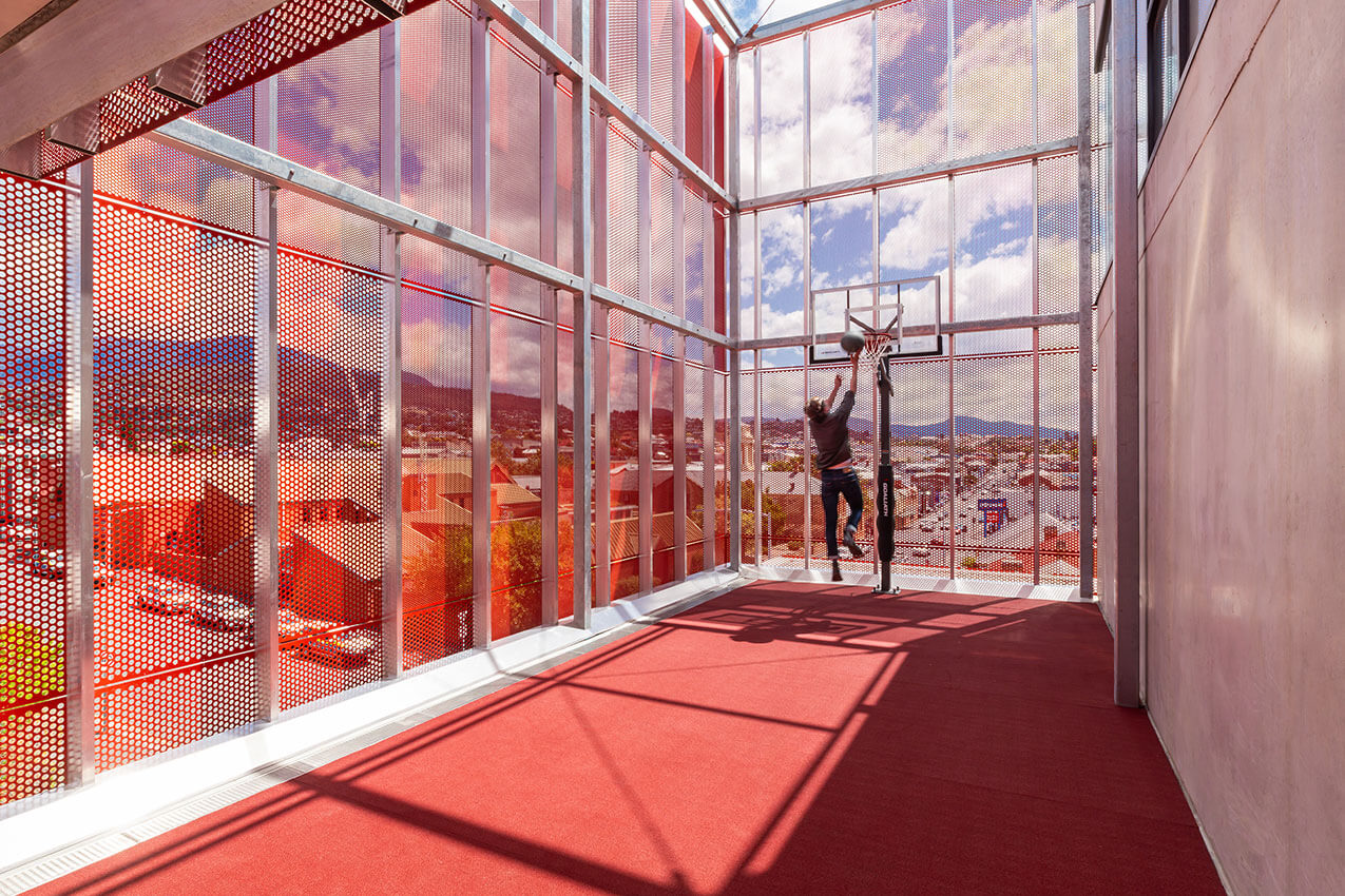 The vibrant mesh screening of the building’s façade operates as a city ‘marker’ within the urban context as well as a device to frame views to the rich urban fabric or kunanyi beyond.