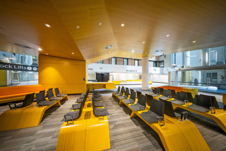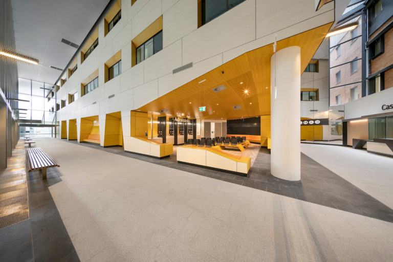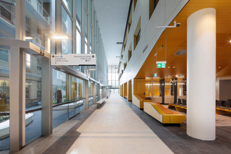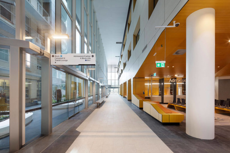 At the heart of this strategy, is a new internal public street that connects the existing campus fabric and facilities with a new inpatient tower (Building K), resolving many of the functionality problems from the hospital’s organic growth. The building brings together dispersed and outmoded ward accommodation from across the campus into a new multi-level contemporary inpatient building, delivering high levels of efficiency for patients and the hospital. The primary urban design strategy transformed the previous ‘institutional’ quality of the hospital campus to a porous campus that ‘opens up’ the community.